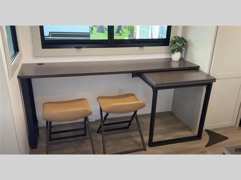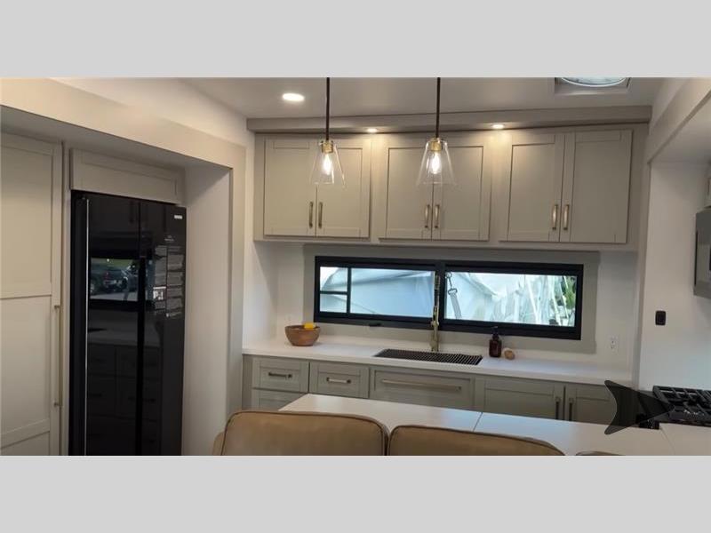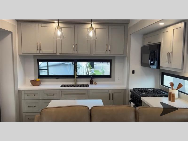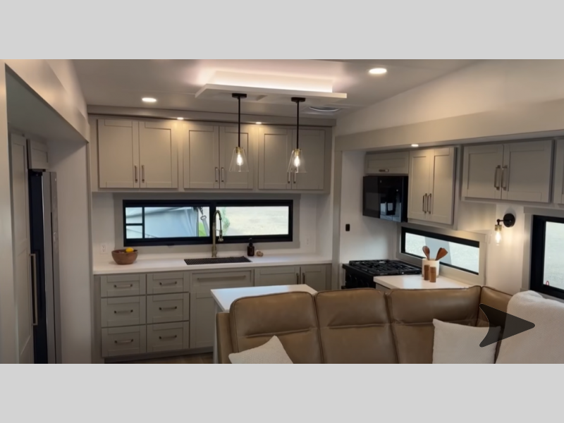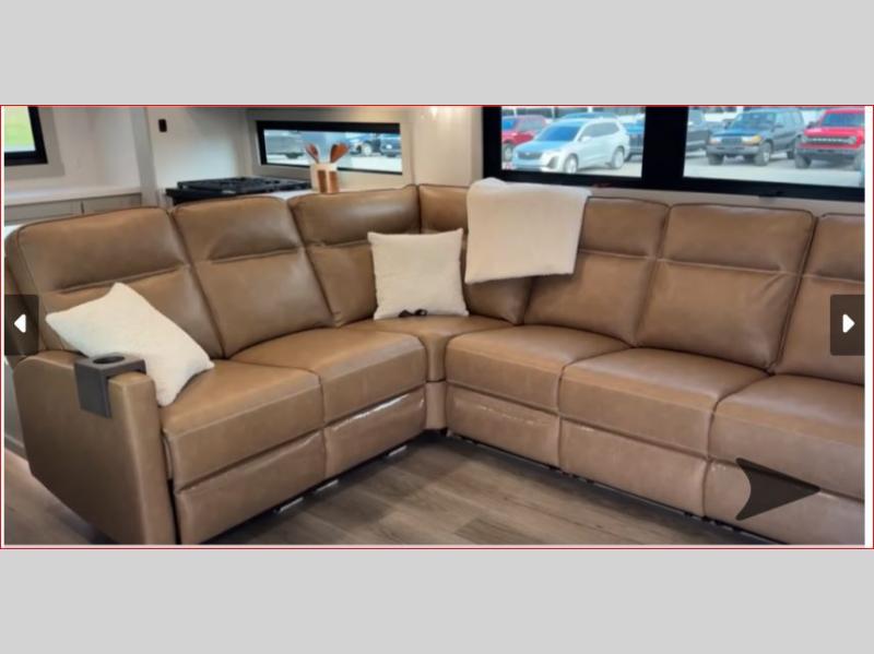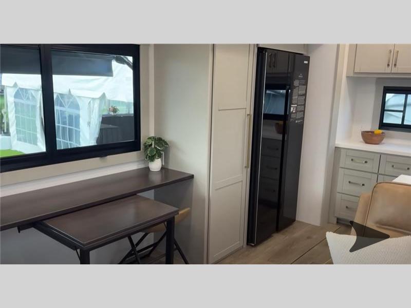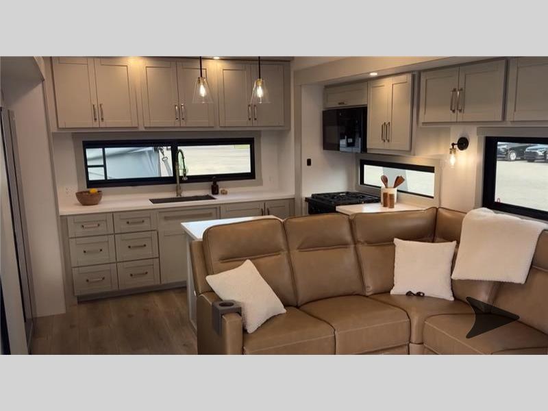 Escape to a world of comfort and luxury with this incredible fifth wheel! The living area features a plush L-sofa, five recliners, and a warm fireplace. The versatile dining table/L desk seats up to four people, making it perfect for meals, work, or play. Ample shoe storage and a convenient spot for pet bowls enhance comfort and practicality. The kitchen offers stunning solid surface countertops, dishwasher prep, a residential microwave, and a three-burner cooktop. The expansive pantry with pull-out drawers provides ample storage for your favorite ingredients and cooking essentials. The full bathroom is a serene oasis, featuring a linen closet for added storage and convenience. The front bedroom is a peaceful sanctuary, featuring a spacious king bed, shelves, and a sliding dresser top with hidden storage. The generous wardrobe and shoe rack provide ample storage for your clothes and shoes.