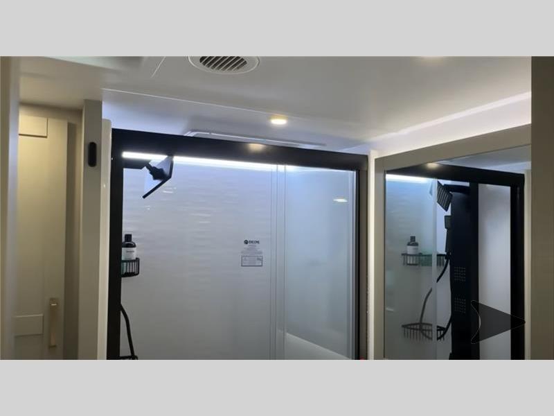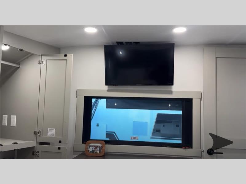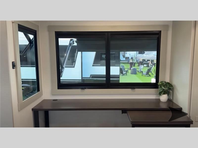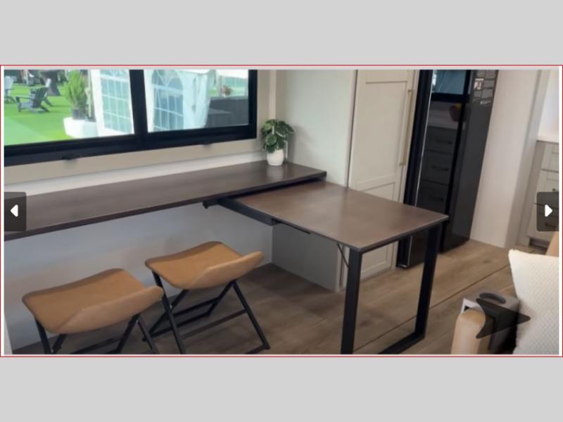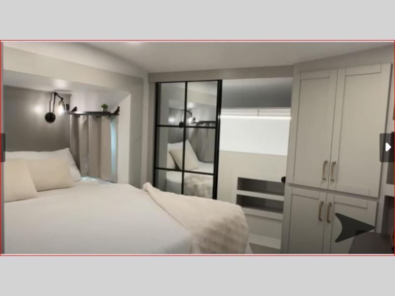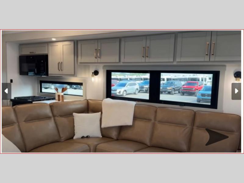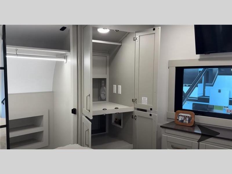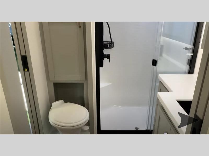 Escape to a world of comfort and luxury with this incredible fifth wheel! The living area features a plush L-sofa, five recliners, and a warm fireplace. The versatile dining table/L desk seats up to four people, making it perfect for meals, work, or play. Ample shoe storage and a convenient spot for pet bowls enhance comfort and practicality. The kitchen offers stunning solid surface countertops, dishwasher prep, a residential microwave, and a three-burner cooktop. The expansive pantry with pull-out drawers provides ample storage for your favorite ingredients and cooking essentials. The full bathroom is a serene oasis, featuring a linen closet for added storage and convenience. The front bedroom is a peaceful sanctuary, featuring a spacious king bed, shelves, and a sliding dresser top with hidden storage. The generous wardrobe and shoe rack provide ample storage for your clothes and shoes.