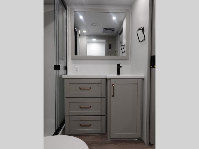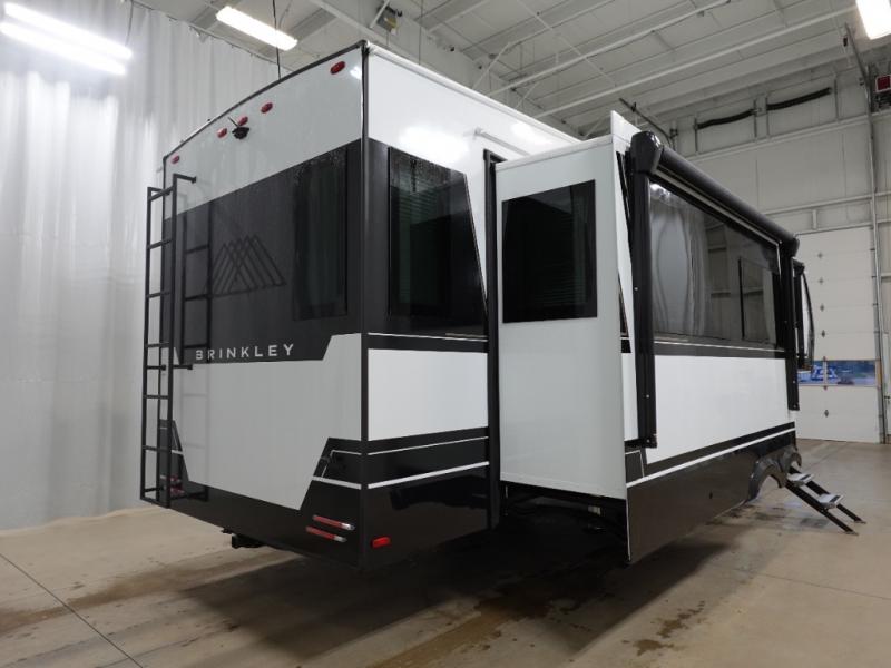 The Brinkley mid-profile Model Z fifth wheels bring you clean lines and an upscale look with plenty of style and exciting new features like the industry first brass plumbing connections. These units also feature an automotive grade front cap, plenty of exterior storage, exterior hot and cold showers, and wide stance leveling jacks for easy set up. Residential frameless windows provide a clean look and beautiful views, and ample electrical outlets and 6 USB/USB-C outlets allow all of your electronics and appliances to easily be used and charged.