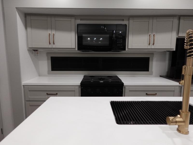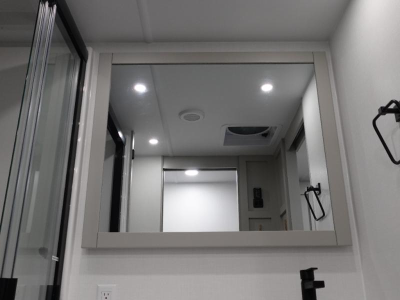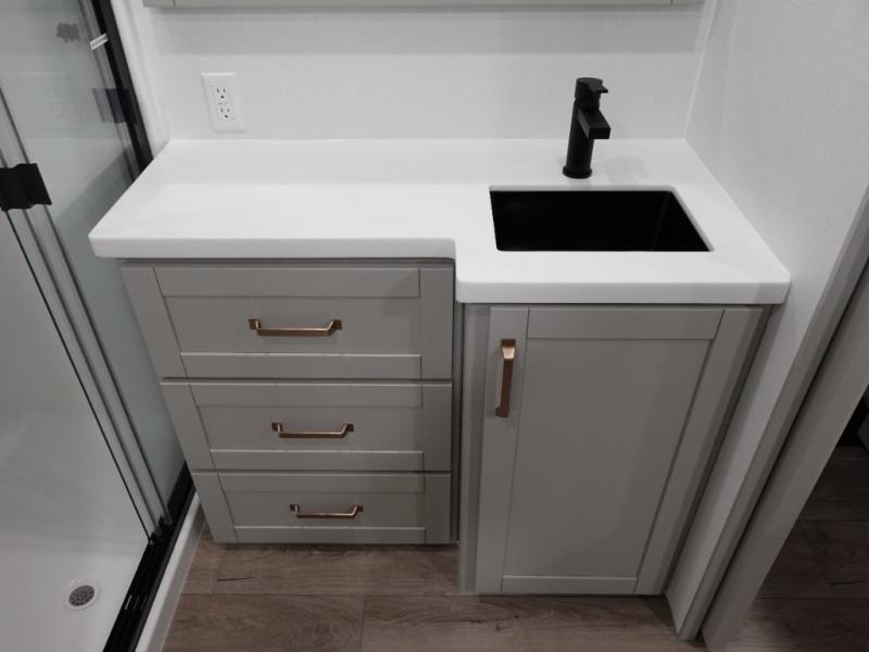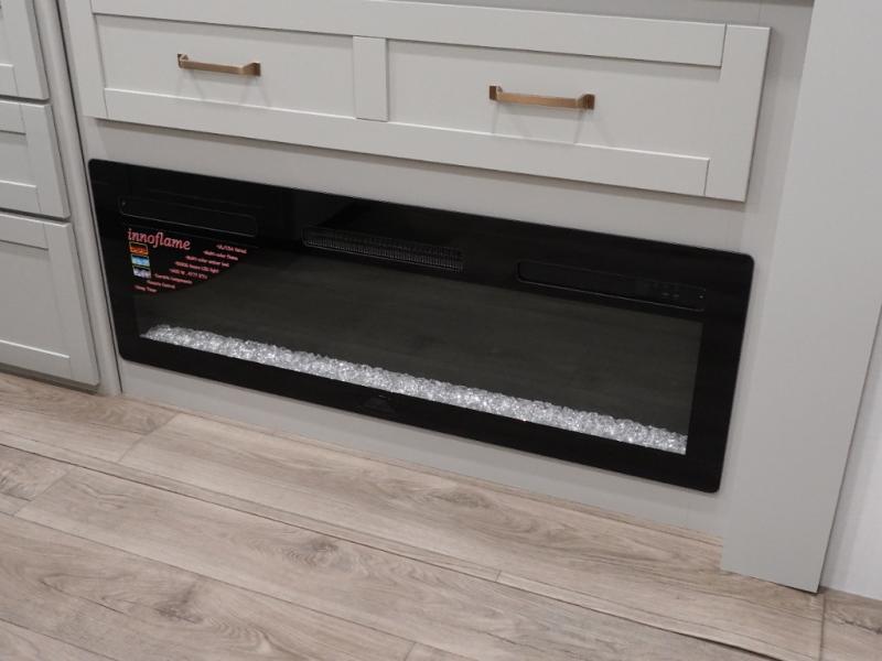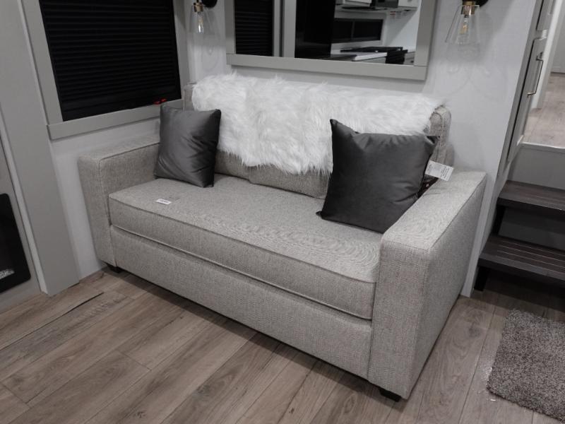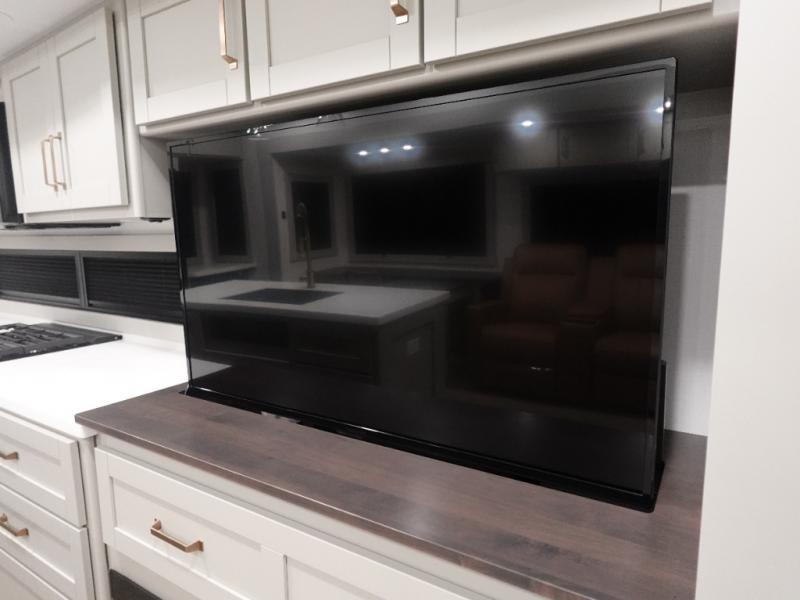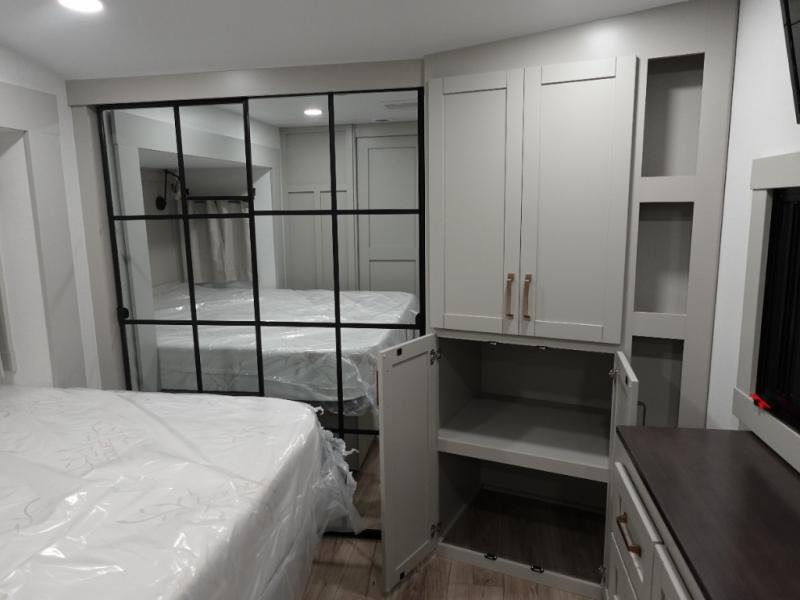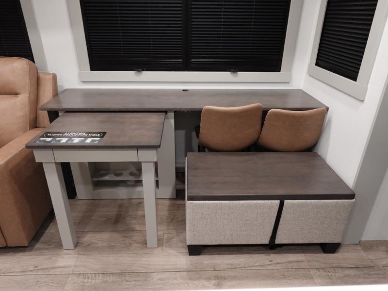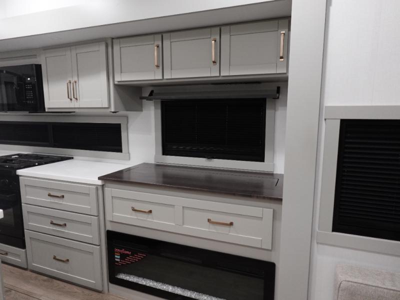 You're going to love every minute spent in this triple slide out fifth wheel! The chef will find everything they need in the kitchen, including a 30" residential microwave, 16 cu. ft. 12V refrigerator, plus a large kitchen island, complete with dual trash bins and dog bowls at the foot. Your crew can get cozy on the tri-fold sofa that extends to a 54" x 70" bed for guests, and there is theater seating across from the televator and fireplace for easy viewing! You will find the front private bedroom ultra accommodating with its king bed slide out, sliding dresser top with hidden storage, your own TV, and a front wardrobe with shelves and a shoe rack. There is even washer and dryer prep if you want the option to make laundry day that much easier!