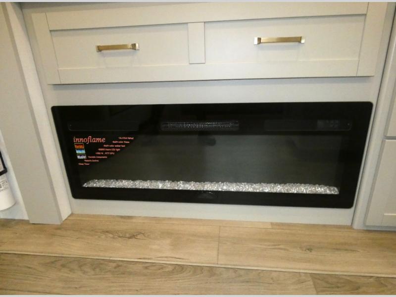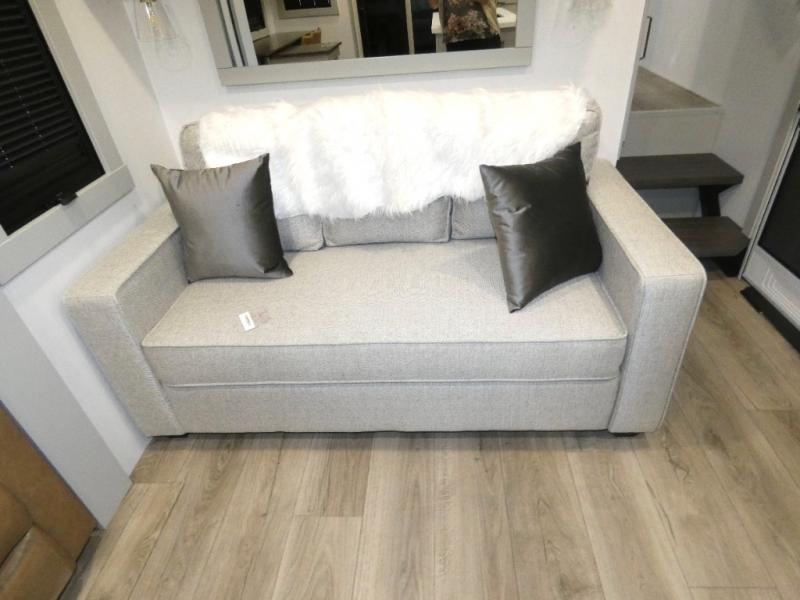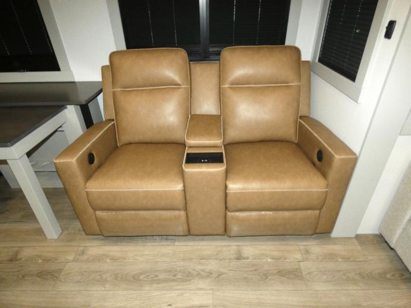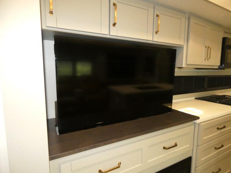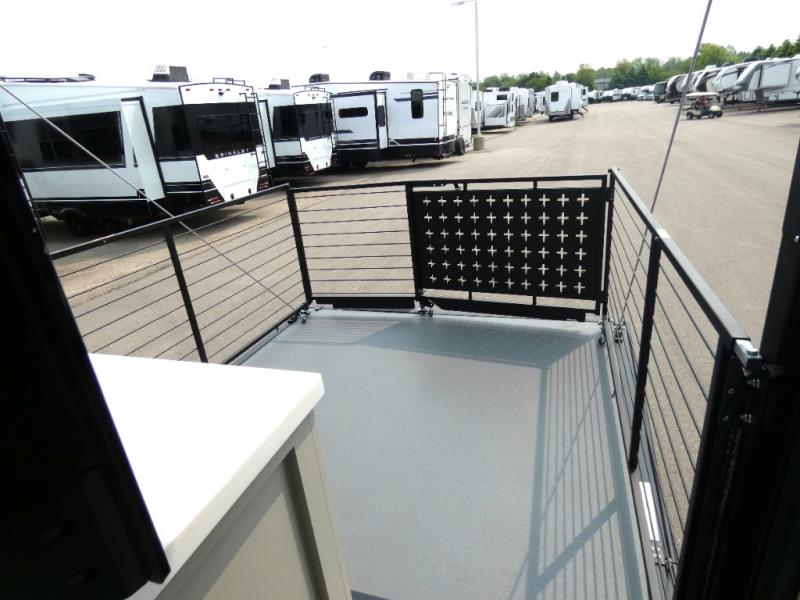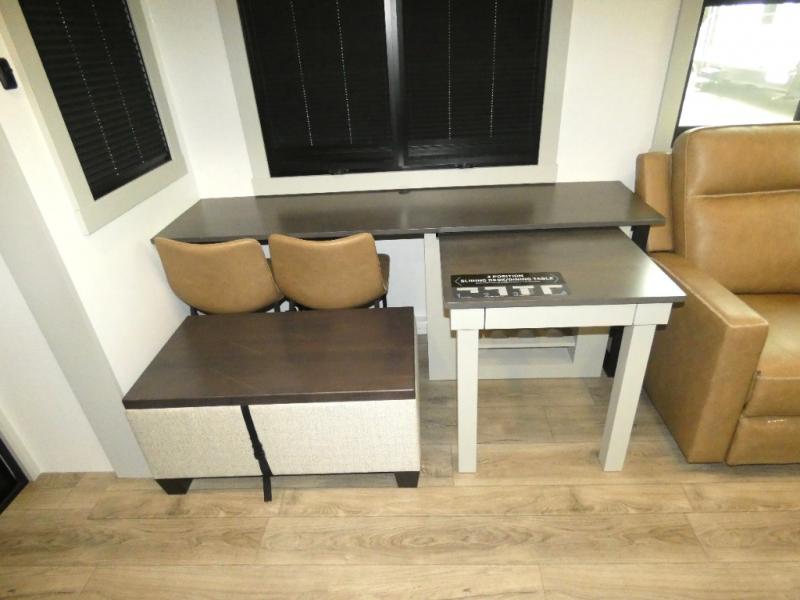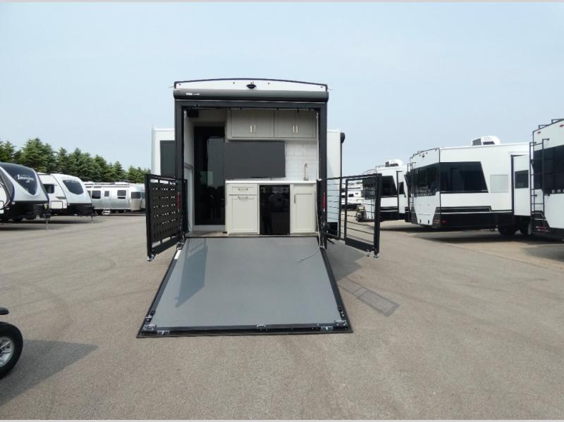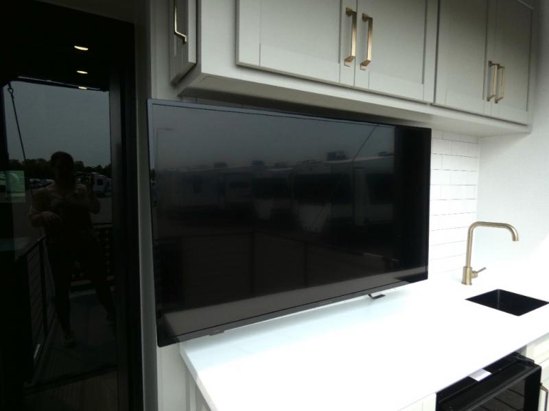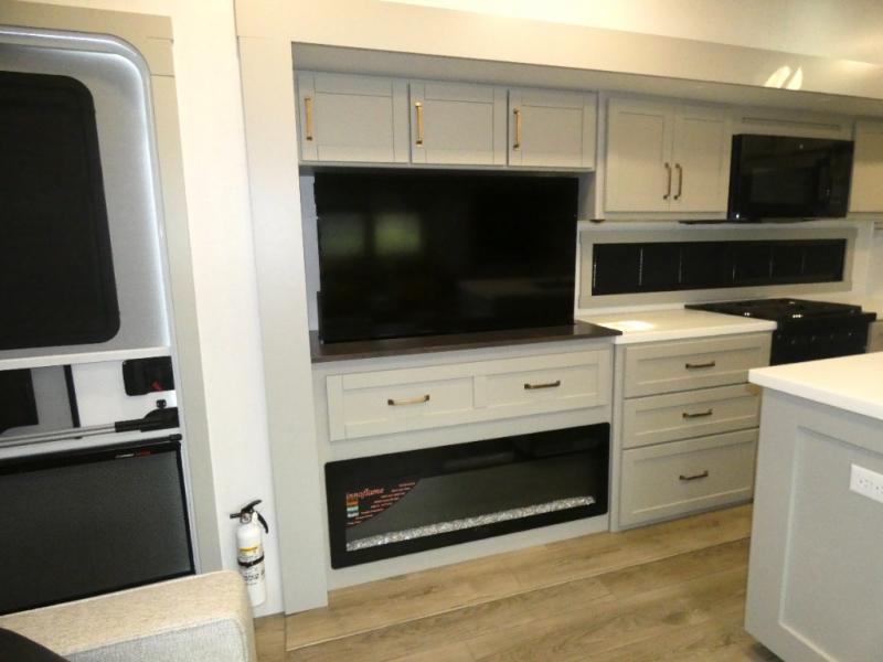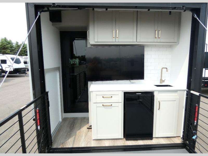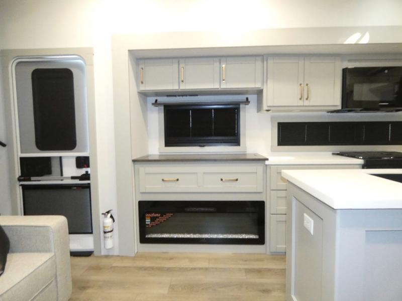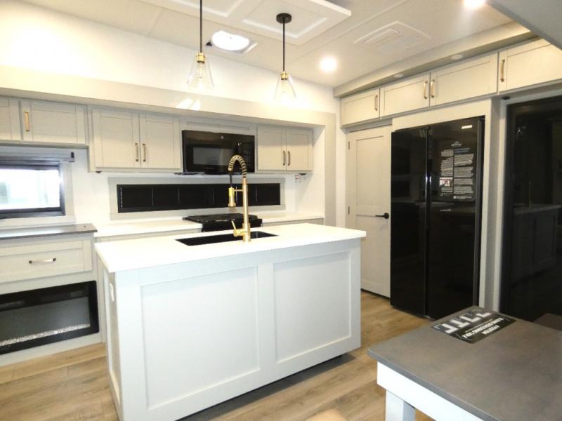 You're going to love every minute spent in this triple slide out fifth wheel! Once you arrive at the campground, you can put out the two side awnings, set up the rear patio and awning, then make lunch on the outdoor kitchen! There is also an outdoor TV here, a bar sink, and a refrigerator to keep drinks close by! Inside, the chef will find everything they need if the weather isn't cooperating, including a 30" residential microwave, 16 cu. ft. refrigerator, plus a large kitchen island, complete with dual trash bins and dog bowls at the foot. Your crew can get cozy on the tri-fold sofa that extends to a 54" x 70" bed for guests, and there is theater seating across from the televator and fireplace for easy viewing! You will find the front private bedroom ultra accommodating with its king bed slide out, sliding dresser top with hidden storage, your own TV, and a front wardrobe with shelves and a shoe rack.
