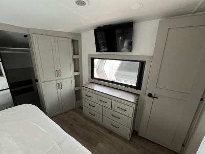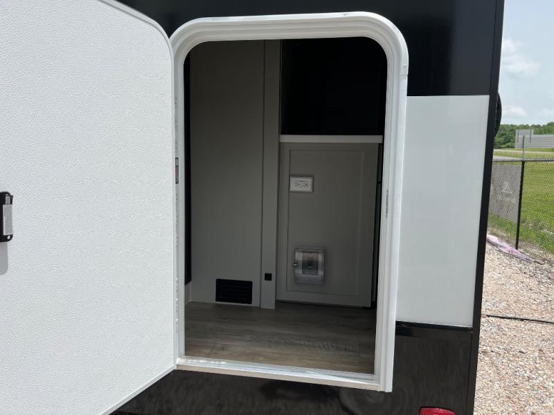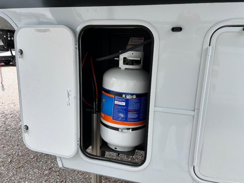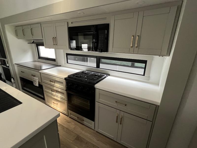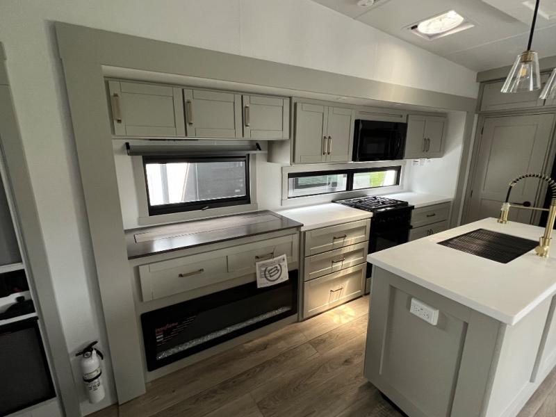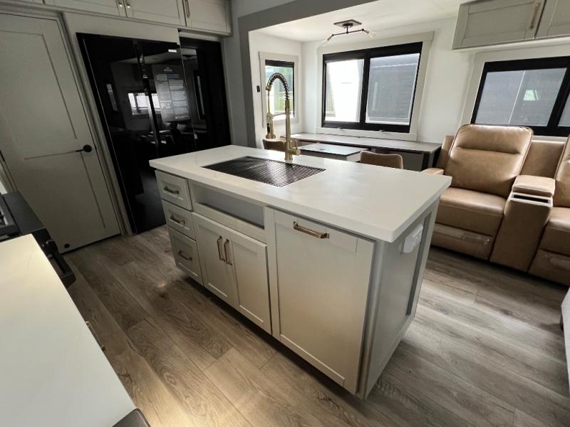 You're going to love every minute spent in this triple slide out fifth wheel! Once you arrive at the campground, you can put out the two side awnings, set up the rear patio and awning, then make lunch on the outdoor kitchen! There is also an outdoor TV here, a bar sink, and a refrigerator to keep drinks close by! Inside, the chef will find everything they need if the weather isn't cooperating, including a 30" residential microwave, 16 cu. ft. refrigerator, plus a large kitchen island, complete with dual trash bins and dog bowls at the foot. Your crew can get cozy on the tri-fold sofa that extends to a 54" x 70" bed for guests, and there is theater seating across from the televator and fireplace for easy viewing! You will find the front private bedroom ultra accommodating with its king bed slide out, sliding dresser top with hidden storage, your own TV, and a front wardrobe with shelves and a shoe rack. There is even washer and dryer prep if you want the option to make laundry day that much easier!