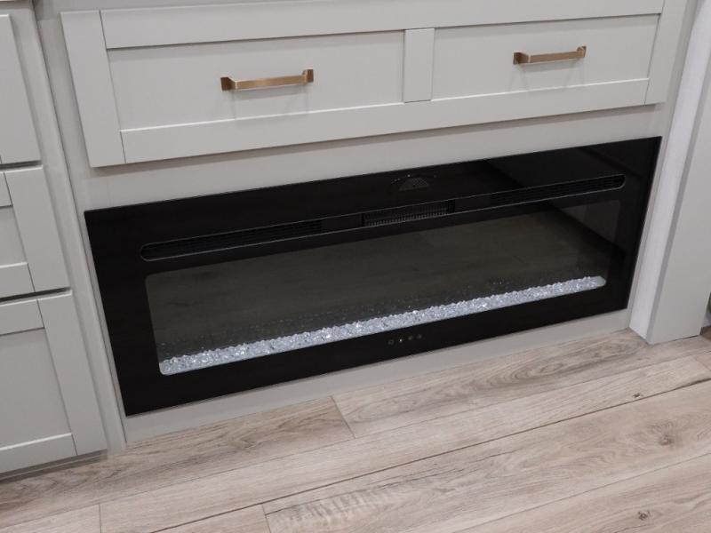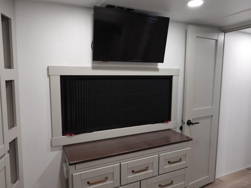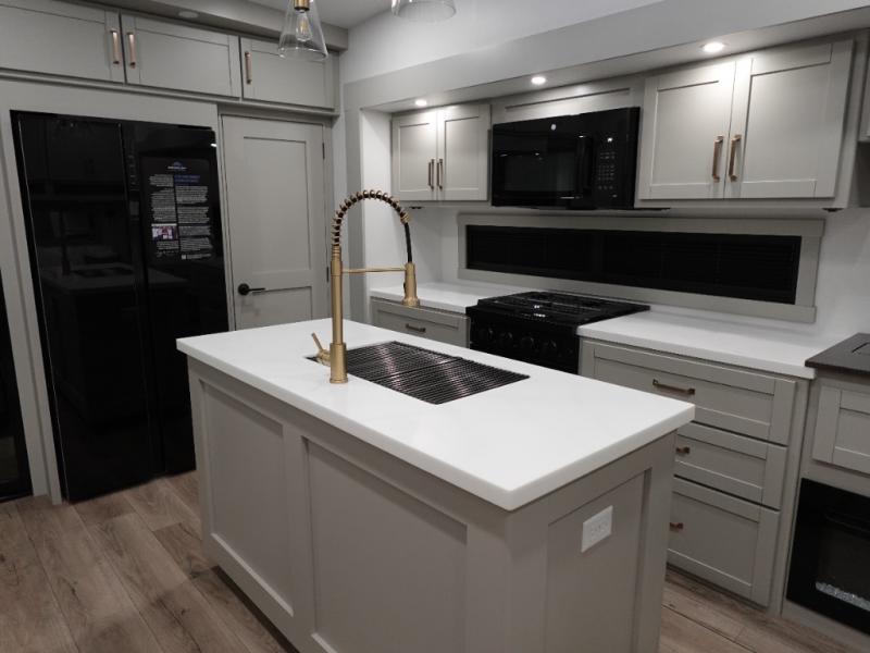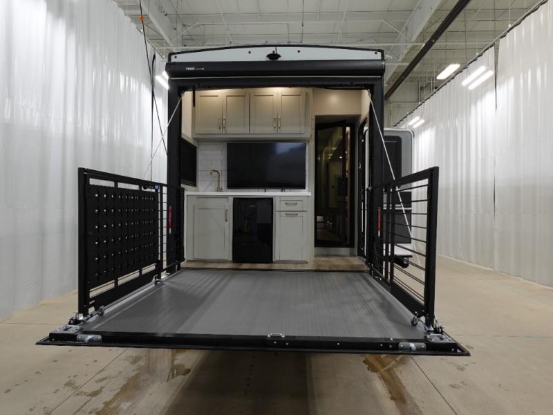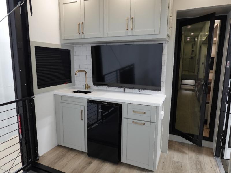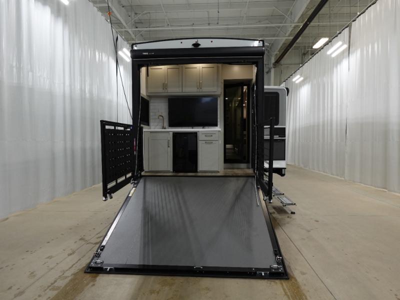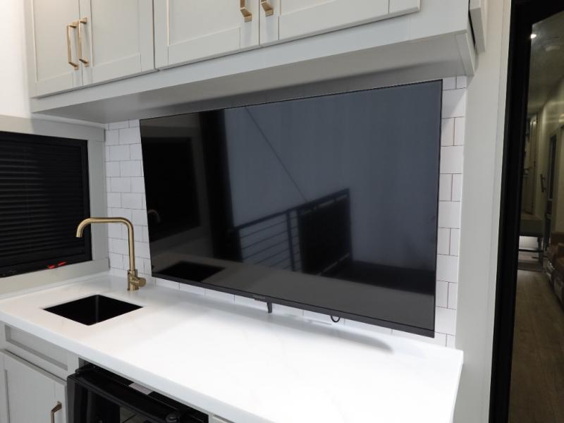 You're going to love every minute spent in this triple slide out fifth wheel! Once you arrive at the campground, you can put out the two side awnings, set up the rear patio and awning, then make lunch on the outdoor kitchen! There is also an outdoor TV here, a bar sink, and a refrigerator to keep drinks close by! Inside, the chef will find everything they need if the weather isn't cooperating, including a 30" residential microwave, 16 cu. ft. refrigerator, plus a large kitchen island, complete with dual trash bins and dog bowls at the foot. Your crew can get cozy on the tri-fold sofa that extends to a 54" x 70" bed for guests, and there is theater seating across from the televator and fireplace for easy viewing! You will find the front private bedroom ultra accommodating with its king bed slide out, sliding dresser top with hidden storage, your own TV, and a front wardrobe with shelves and a shoe rack. There is even washer and dryer prep if you want the option to make laundry day that much easier!