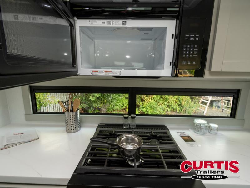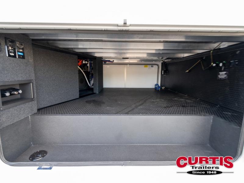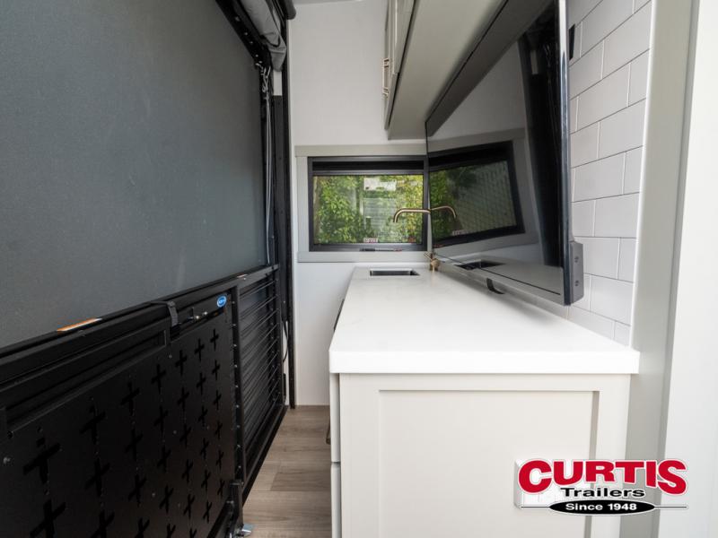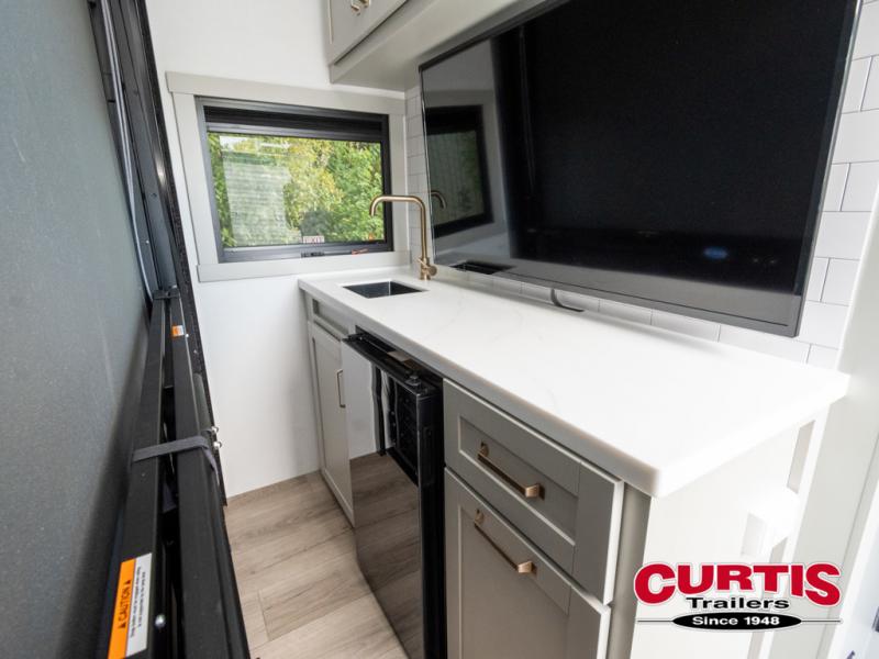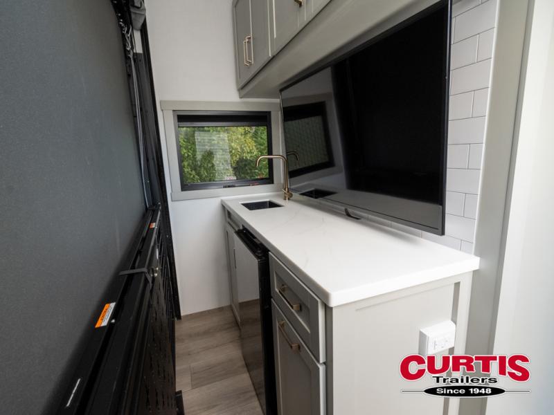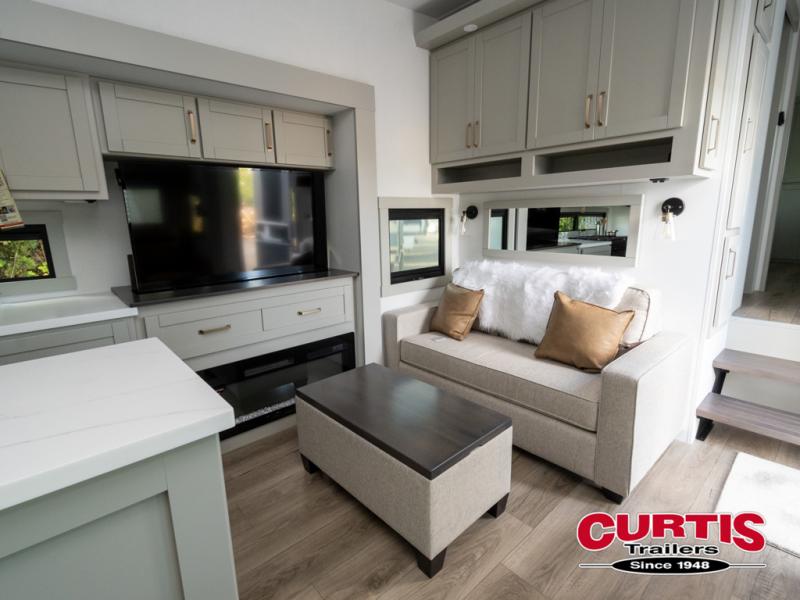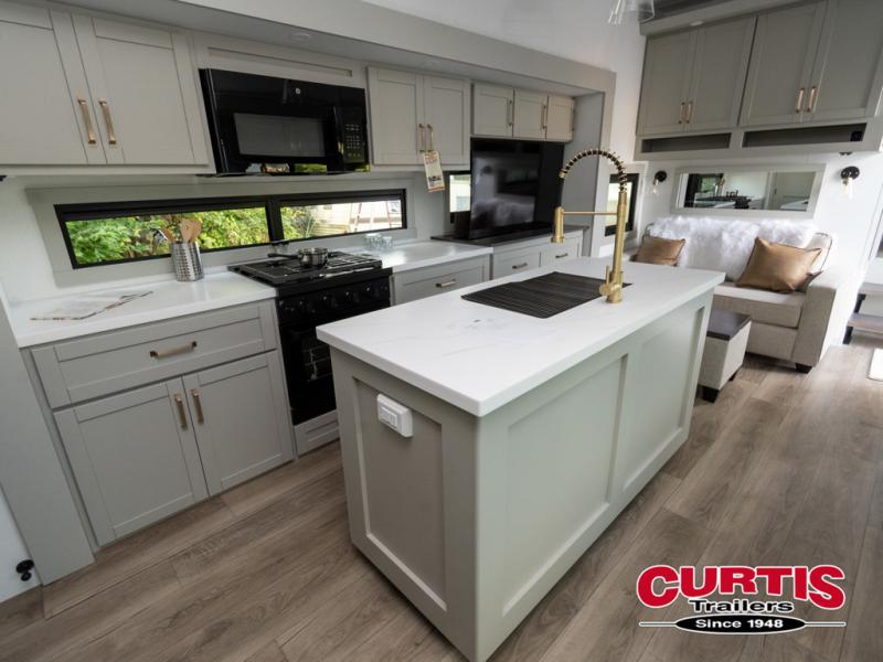 You're going to love every minute spent in this triple slide out fifth wheel! Once you arrive at the campground, you can put out the two side awnings, set up the rear patio and awning, then make lunch on the outdoor kitchen! There is also an outdoor TV here, a bar sink, and a refrigerator to keep drinks close by! Inside, the chef will find everything they need if the weather isn't cooperating, including a 30" residential microwave, 16 cu. ft. refrigerator, plus a large kitchen island, complete with dual trash bins and dog bowls at the foot. Your crew can get cozy on the tri-fold sofa that extends to a 54" x 70" bed for guests, and there is theater seating across from the televator and fireplace for easy viewing! You will find the front private bedroom ultra accommodating with its king bed slide out, sliding dresser top with hidden storage, your own TV, and a front wardrobe with shelves and a shoe rack. There is even washer and dryer prep if you want the option to make laundry day that much easier!