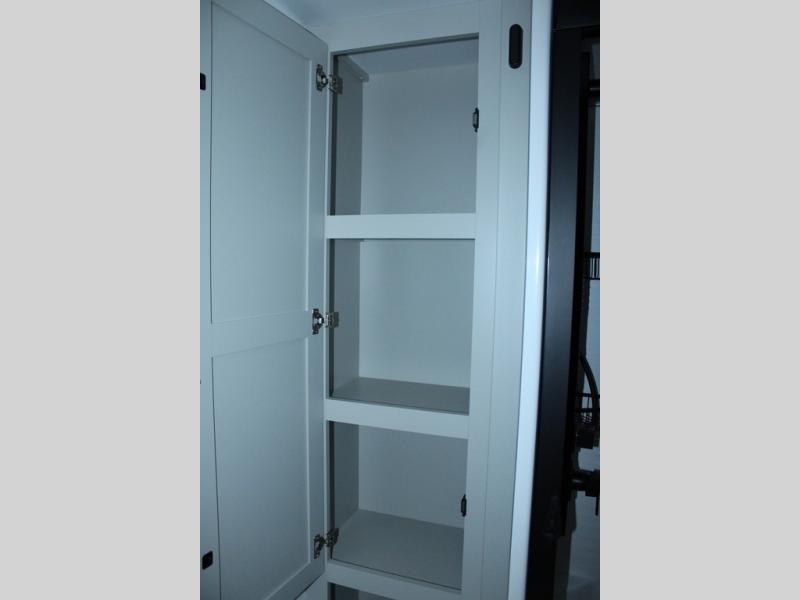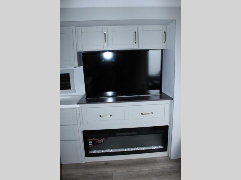 You're going to love every minute spent in this triple slide out fifth wheel! Once you arrive at the campground, you can put out the two side awnings, set up the rear patio and awning, then make lunch on the outdoor kitchen! There is also an outdoor TV here, a bar sink, and a refrigerator to keep drinks close by! Inside, the chef will find everything they need if the weather isn't cooperating, including a 30" residential microwave, 16 cu. ft. refrigerator, plus a large kitchen island, complete with dual trash bins and dog bowls at the foot. Your crew can get cozy on the tri-fold sofa that extends to a 54" x 70" bed for guests, and there is theater seating across from the televator and fireplace for easy viewing! You will find the front private bedroom ultra accommodating with its king bed slide out, sliding dresser top with hidden storage, your own TV, and a front wardrobe with shelves and a shoe rack. There is even washer and dryer prep if you want the option to make laundry day that much easier!