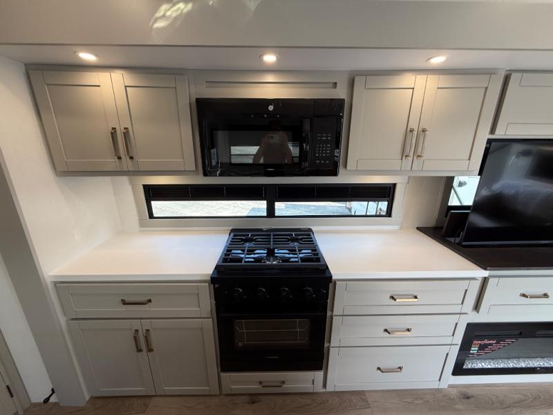 You're going to love every minute spent in this triple slide out fifth wheel! Once you arrive at the campground, you can put out the two side awnings, set up the rear patio and awning, then make lunch on the outdoor kitchen! There is also an outdoor TV here, a bar sink, and a refrigerator to keep drinks close by! Inside, the chef will find everything they need if the weather isn't cooperating, including a 30" residential microwave, 16 cu. ft. refrigerator, plus a large kitchen island, complete with dual trash bins and dog bowls at the foot. Your crew can get cozy on the tri-fold sofa that extends to a 54" x 70" bed for guests, and there is theater seating across from the televator and fireplace for easy viewing! You will find the front private bedroom ultra accommodating with its king bed slide out, sliding dresser top with hidden storage, your own TV, and a front wardrobe with shelves and a shoe rack. There is even washer and dryer prep if you want the option to make laundry day that much easier!