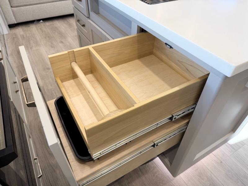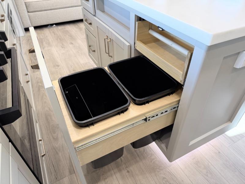 - Spacious kitchen island with dual trash bins and built-in dog bowls