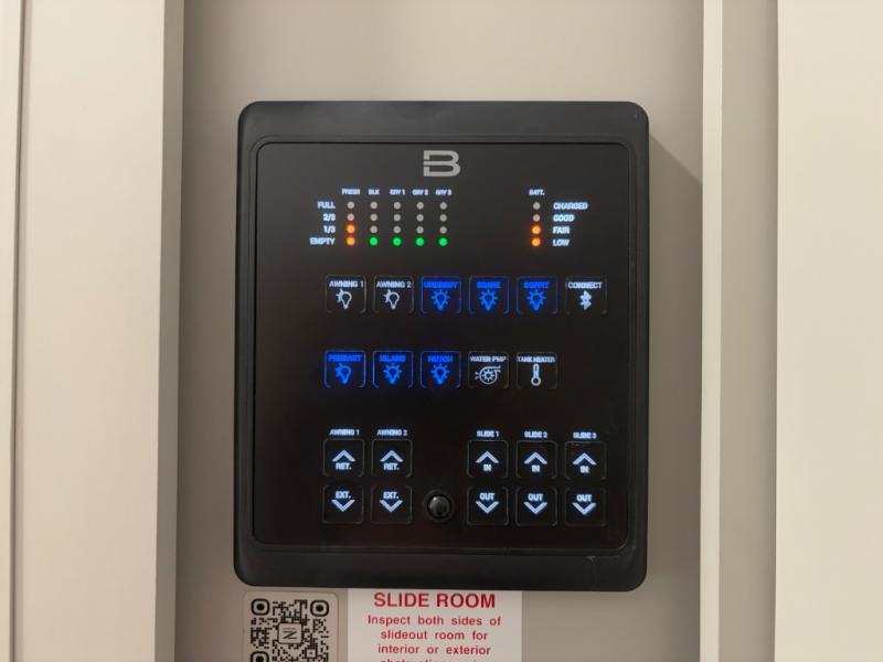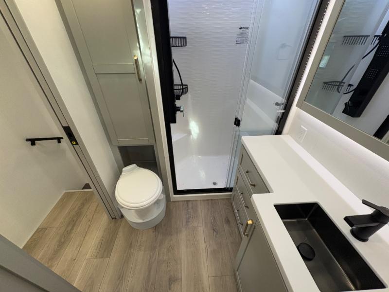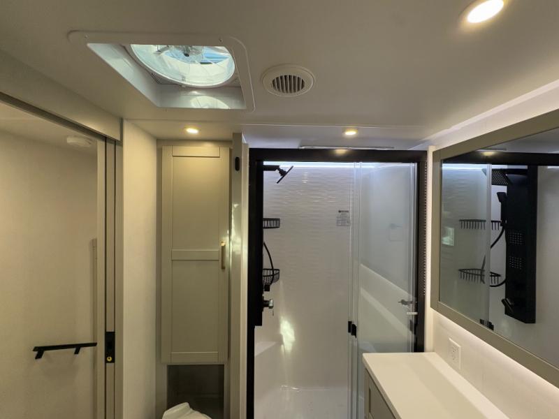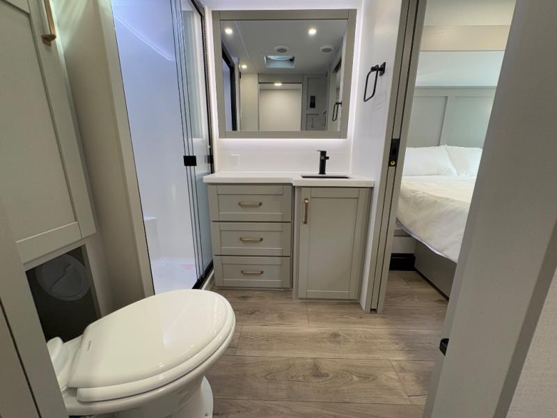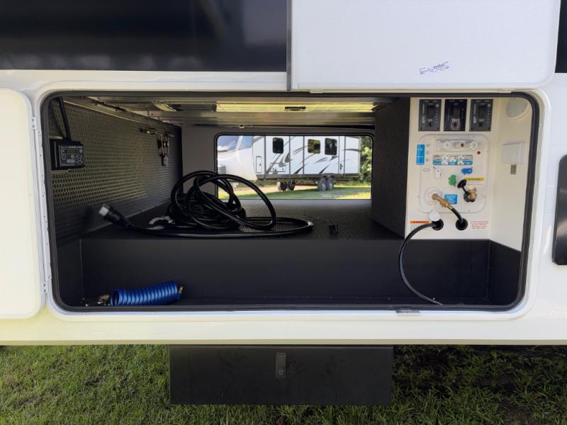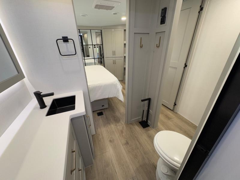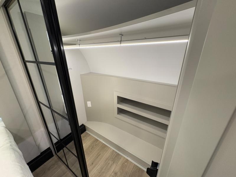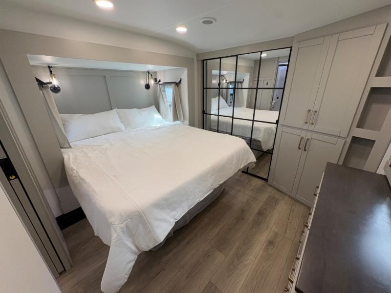 The front private bedroom features a king bed slide, a sliding dresser top with hidden storage for valuables, its own TV, and a spacious wardrobe with shelves and a shoe rack. Washer/dryer prep adds full-time convenience for extended trips.