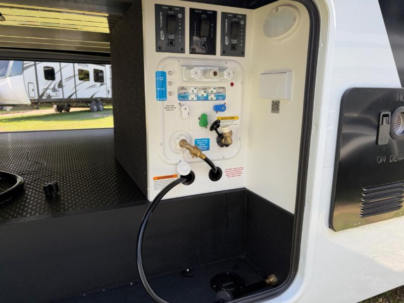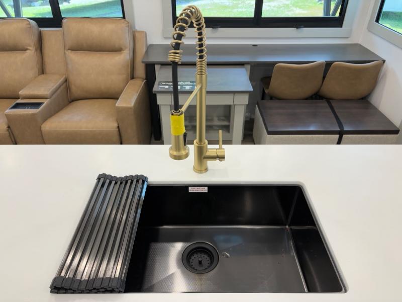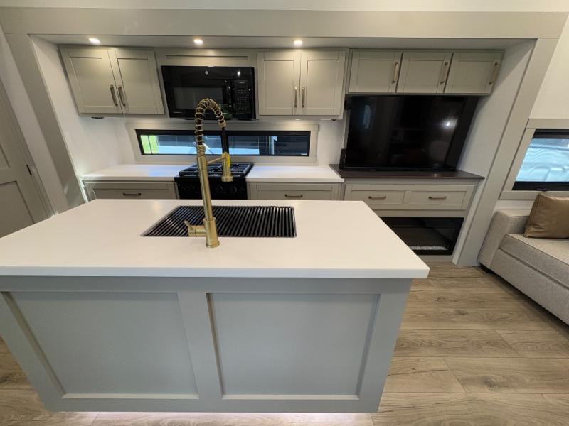 You're going to love every minute spent in this feature-packed triple-slide fifth wheel! Set up camp by extending the dual side awnings and the rear patio with its own awning. The outdoor kitchen includes a bar sink, refrigerator, and exterior TV—perfect for game days, cookouts, and late-night lounging.