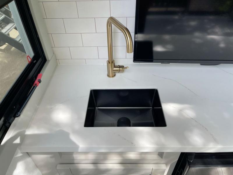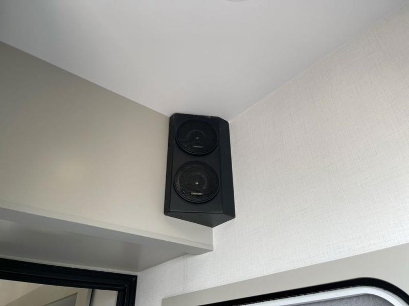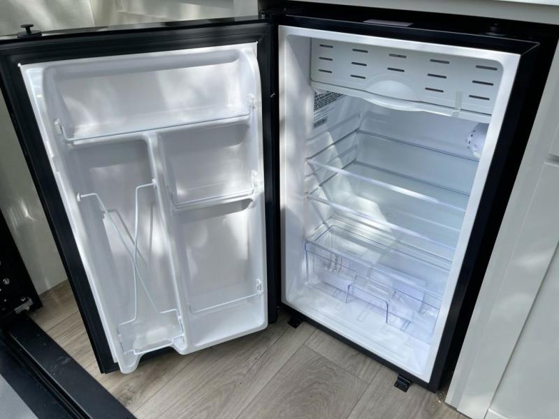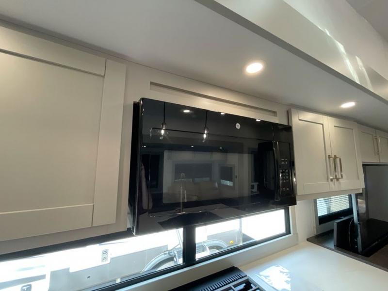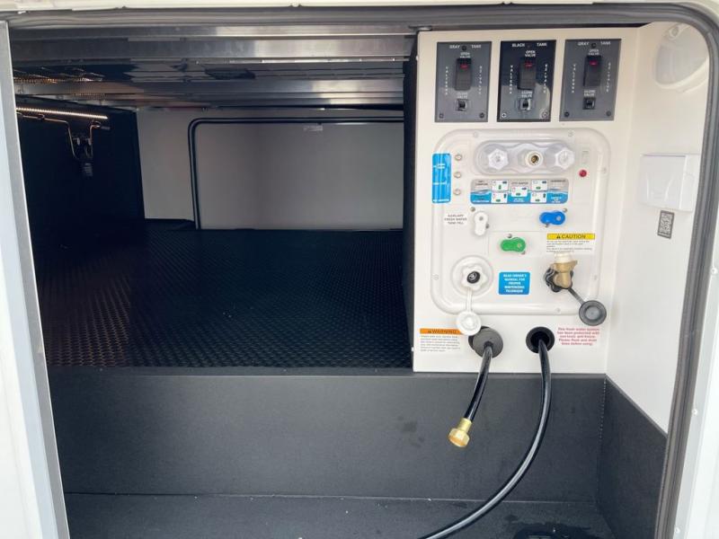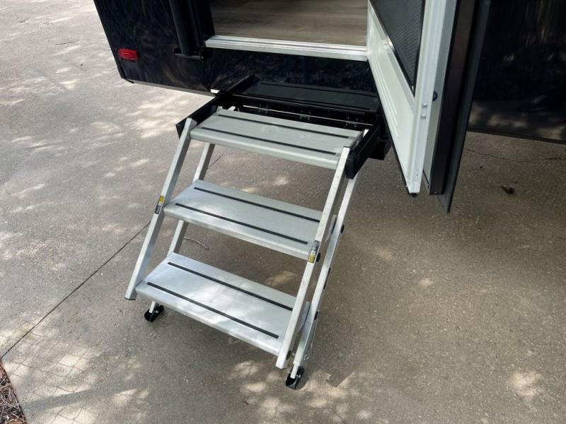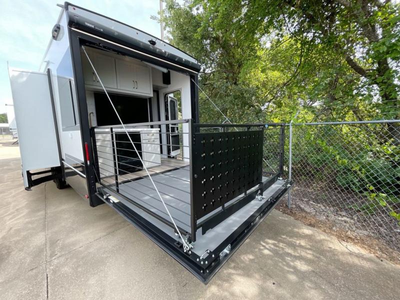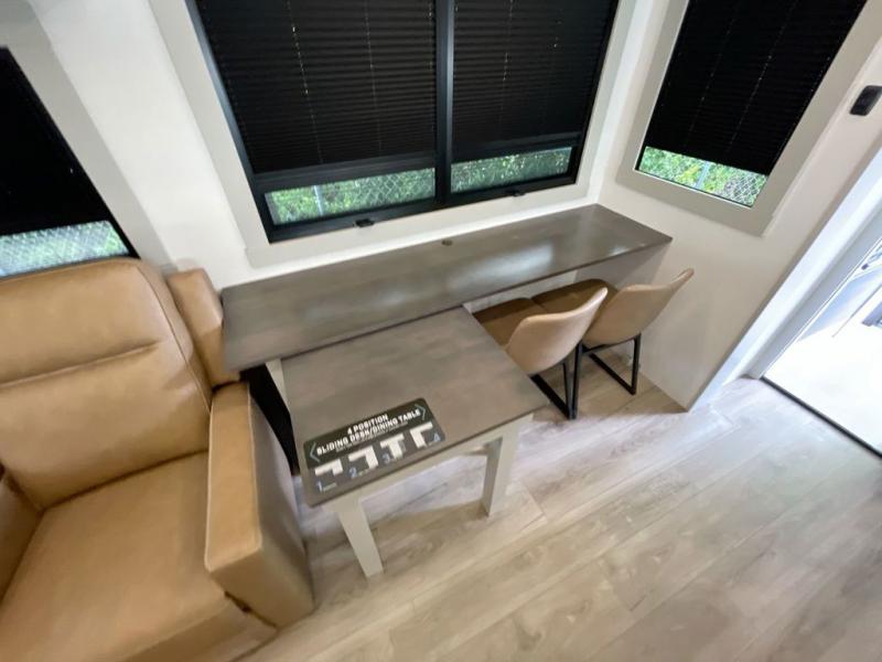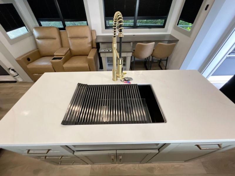 You're going to love every minute spent in this triple slide out fifth wheel! Once you arrive at the campground, you can put out the two side awnings, set up the rear patio and awning, then make lunch on the outdoor kitchen! There is also an outdoor TV here, a bar sink, and a refrigerator to keep drinks close by! Inside, the chef will find everything they need if the weather isn't cooperating, including a 30" residential microwave, 16 cu. ft. refrigerator, plus a large kitchen island, complete with dual trash bins and dog bowls at the foot. Your crew can get cozy on the tri-fold sofa that extends to a 54" x 70" bed for guests, and there is theater seating across from the televator and fireplace for easy viewing! You will find the front private bedroom ultra accommodating with its king bed slide out, sliding dresser top with hidden storage, your own TV, and a front wardrobe with shelves and a shoe rack. There is even washer and dryer prep if you want the option to make laundry day that much easier!