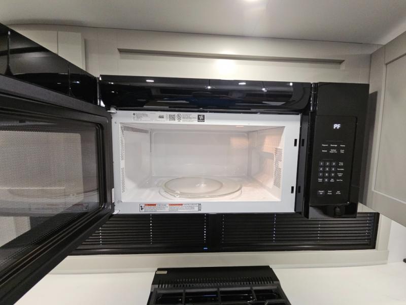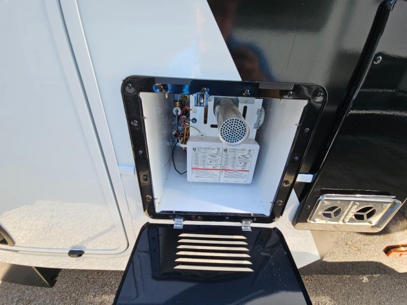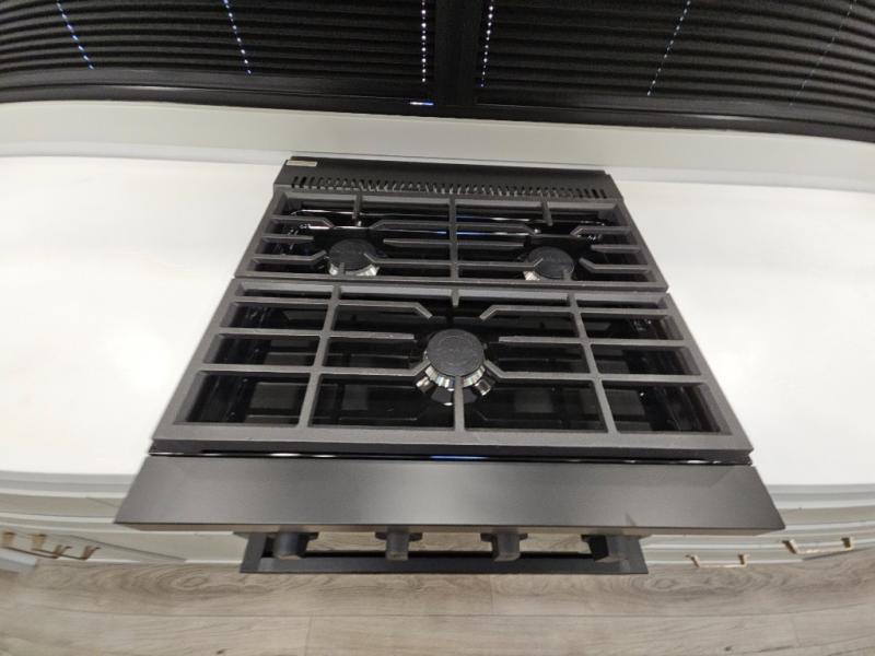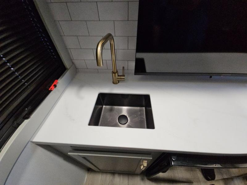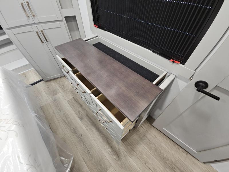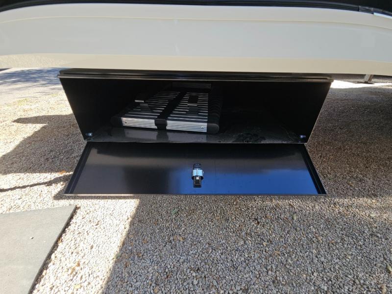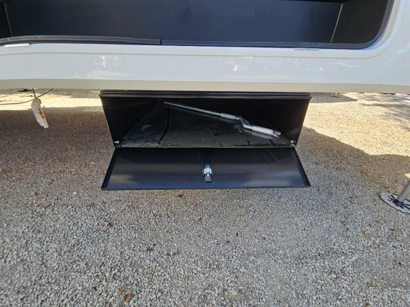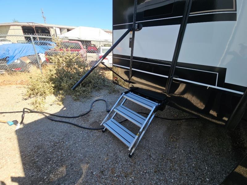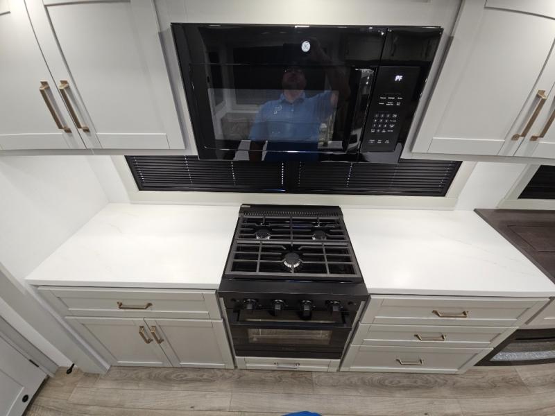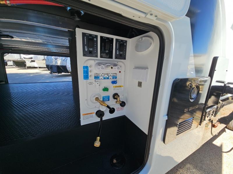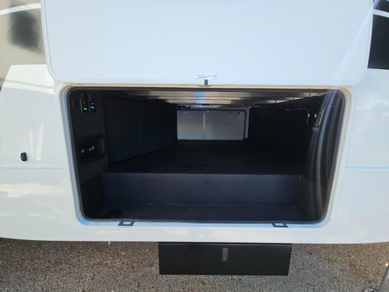 You're going to love every minute spent in this triple slide out fifth wheel! Once you arrive at the campground, you can put out the two side awnings, set up the rear patio and awning, then make lunch on the outdoor kitchen! There is also an outdoor TV here, a bar sink, and a refrigerator to keep drinks close by! Inside, the chef will find everything they need if the weather isn't cooperating, including a 30" residential microwave, 16 cu. ft. refrigerator, plus a large kitchen island, complete with dual trash bins and dog bowls at the foot. Your crew can get cozy on the tri-fold sofa that extends to a 54" x 70" bed for guests, and there is theater seating across from the televator and fireplace for easy viewing! You will find the front private bedroom ultra accommodating with its king bed slide out, sliding dresser top with hidden storage, your own TV, and a front wardrobe with shelves and a shoe rack. There is even washer and dryer prep if you want the option to make laundry day that much easier!