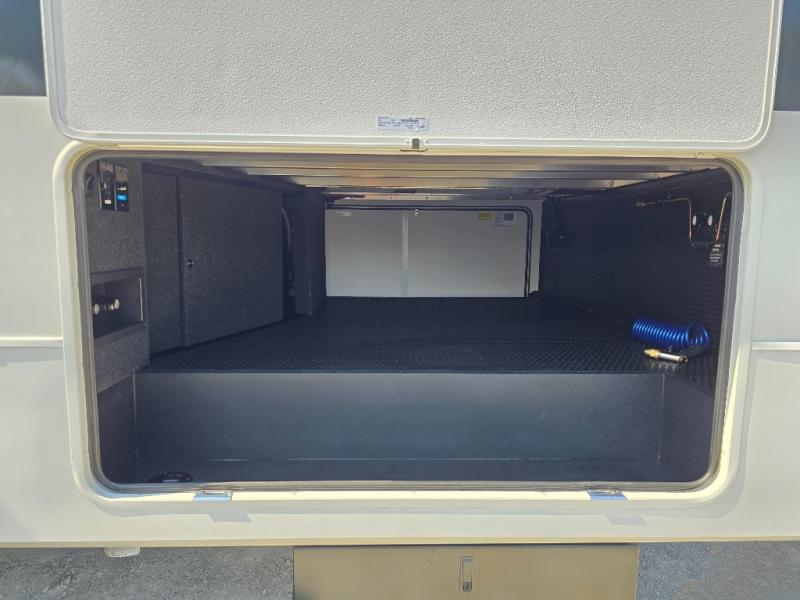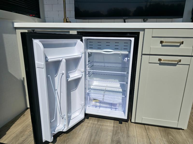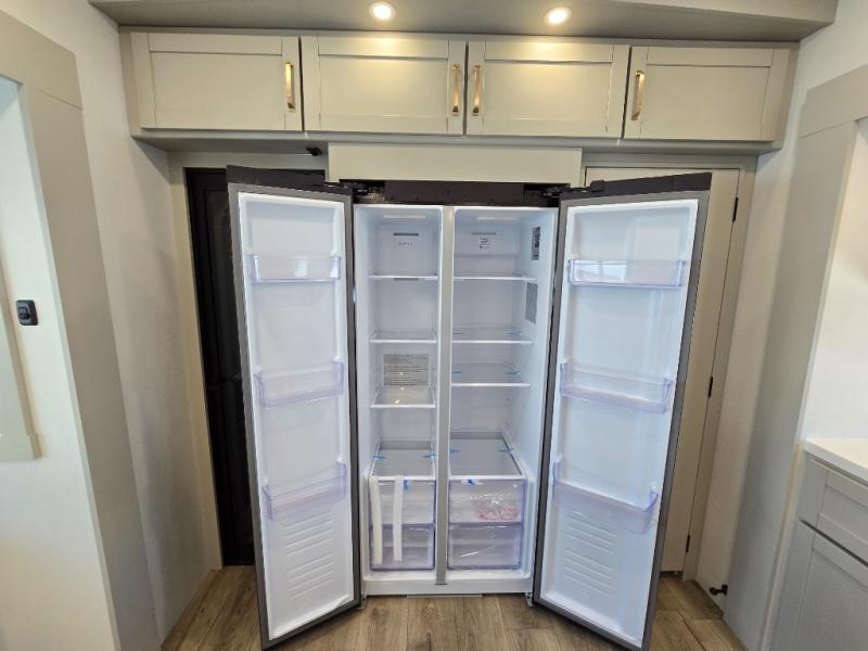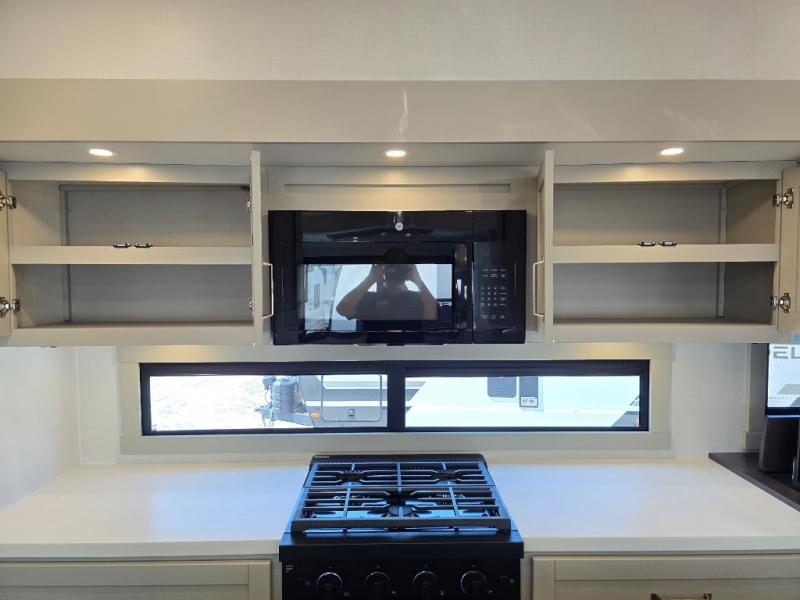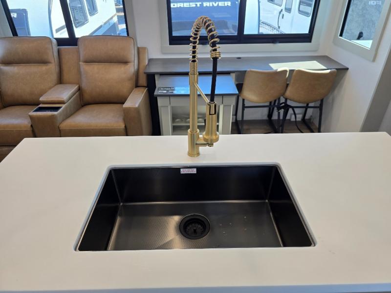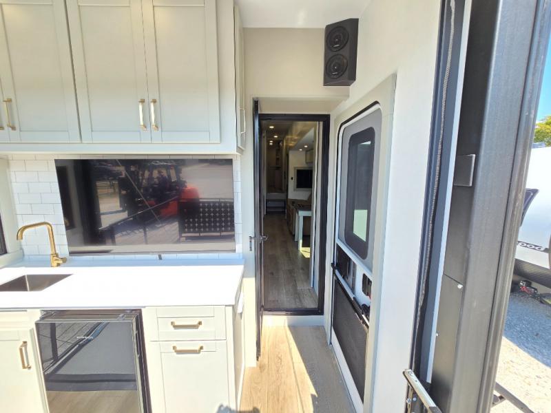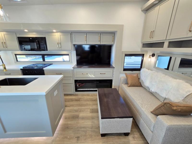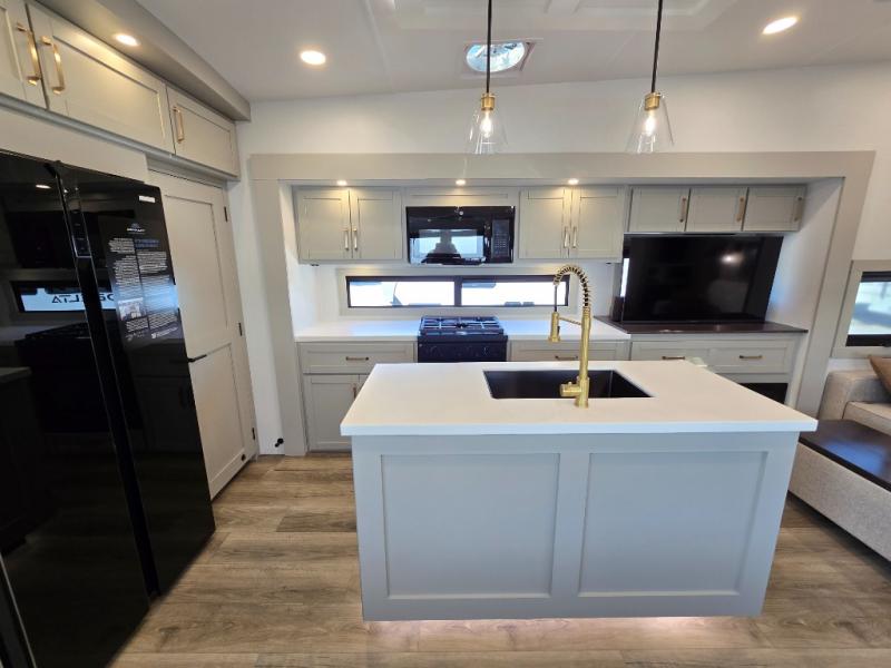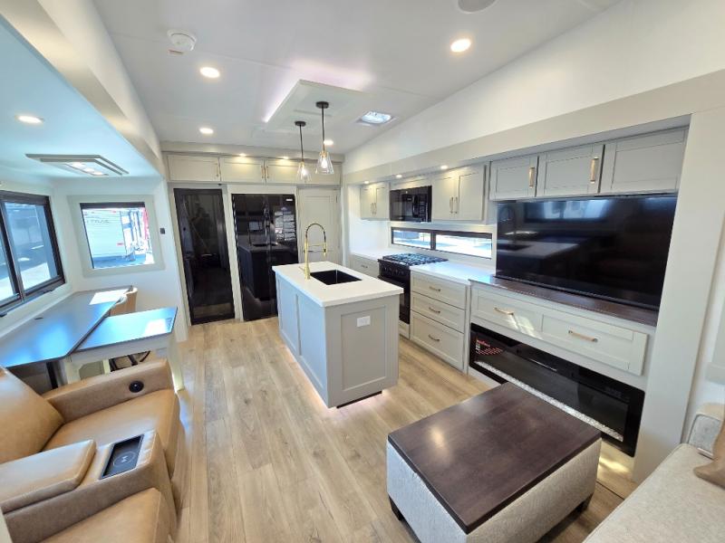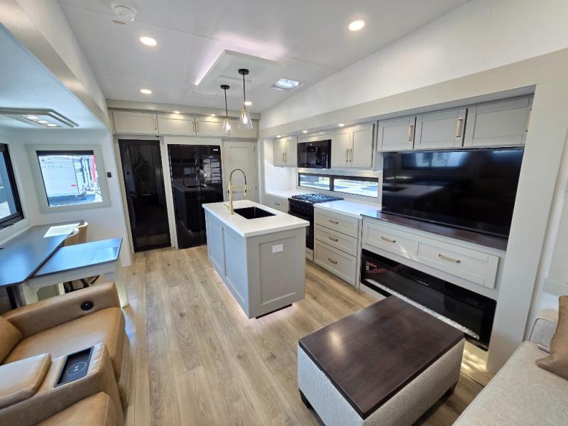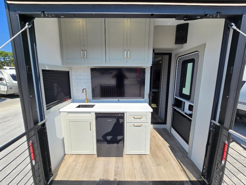 You're going to love every minute spent in this triple slide out fifth wheel! Once you arrive at the campground, you can put out the two side awnings, set up the rear patio and awning, then make lunch on the outdoor kitchen! There is also an outdoor TV here, a bar sink, and a refrigerator to keep drinks close by! Inside, the chef will find everything they need if the weather isn't cooperating, including a 30" residential microwave, 16 cu. ft. refrigerator, plus a large kitchen island, complete with dual trash bins and dog bowls at the foot. Your crew can get cozy on the tri-fold sofa that extends to a 54" x 70" bed for guests, and there is theater seating across from the televator and fireplace for easy viewing! You will find the front private bedroom ultra accommodating with its king bed slide out, sliding dresser top with hidden storage, your own TV, and a front wardrobe with shelves and a shoe rack. There is even washer and dryer prep if you want the option to make laundry day that much easier!