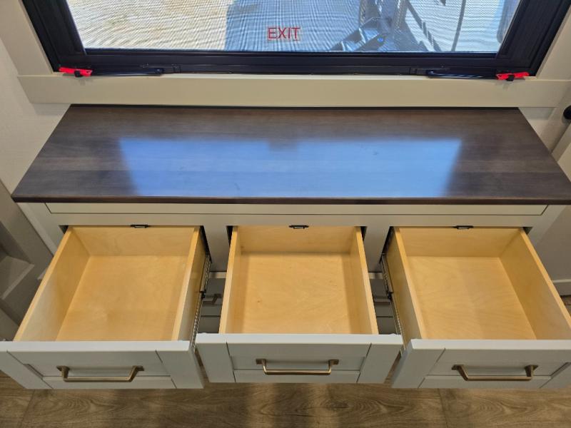 The Brinkley mid-profile Model Z fifth wheels bring you clean lines and an upscale look with plenty of style and exciting new features like the industry first brass plumbing connections. These units also feature an automotive grade front cap, plenty of exterior storage, exterior hot and cold showers, and wide stance leveling jacks for easy set up. Residential frameless windows provide a clean look and beautiful views, and ample electrical outlets and 6 USB/USB-C outlets allow all of your electronics and appliances to easily be used and charged.