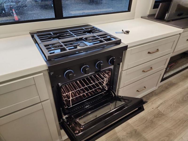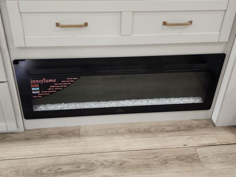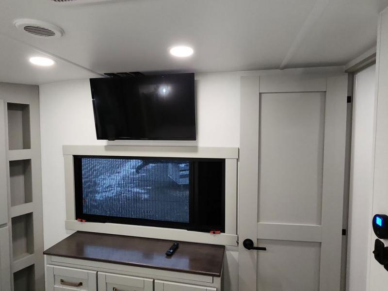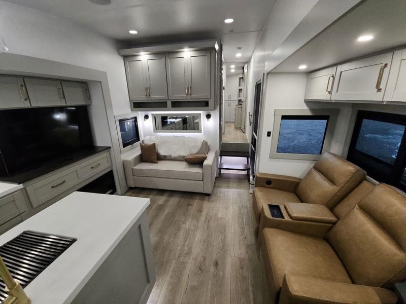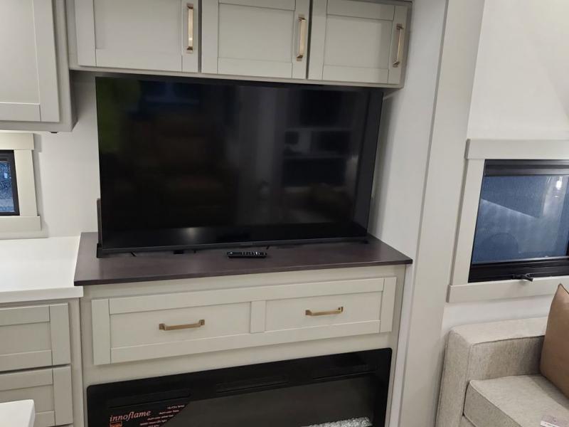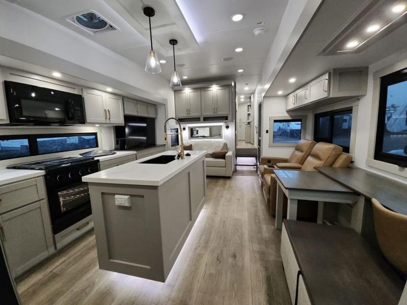 You're going to love every minute spent in this triple slide out fifth wheel! Once you arrive at the campground, you can put out the two side awnings, set up the rear patio and awning, then make lunch on the outdoor kitchen! There is also an outdoor TV here, a bar sink, and a refrigerator to keep drinks close by! Inside, the chef will find everything they need if the weather isn't cooperating, including a 30" residential microwave, 16 cu. ft. refrigerator, plus a large kitchen island, complete with dual trash bins and dog bowls at the foot. Your crew can get cozy on the tri-fold sofa that extends to a 54" x 70" bed for guests, and there is theater seating across from the televator and fireplace for easy viewing! You will find the front private bedroom ultra accommodating with its king bed slide out, sliding dresser top with hidden storage, your own TV, and a front wardrobe with shelves and a shoe rack. There is even washer and dryer prep if you want the option to make laundry day that much easier!