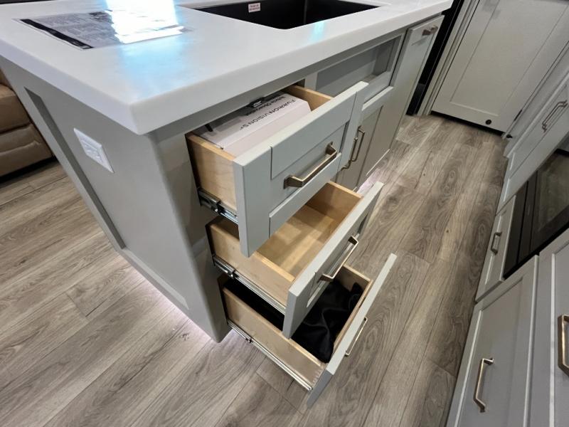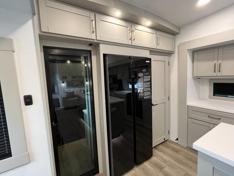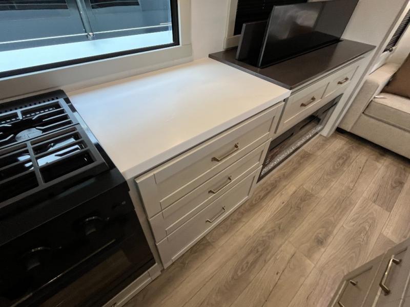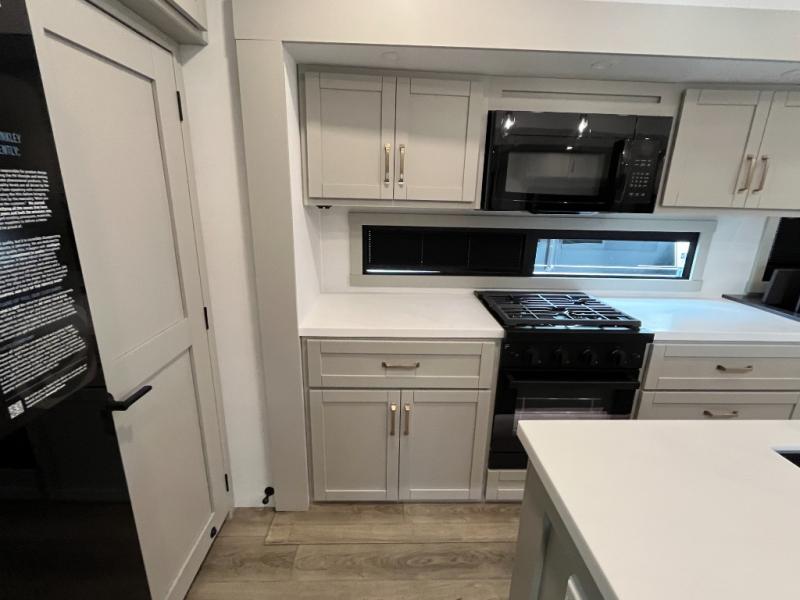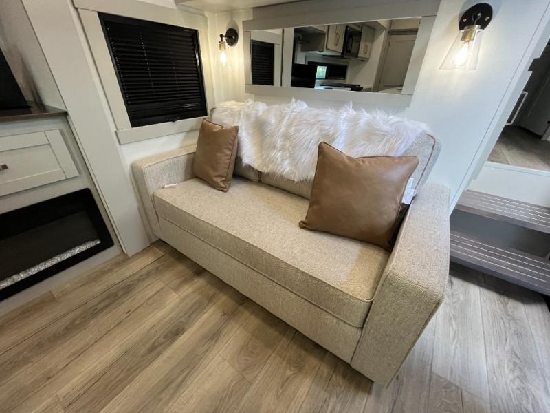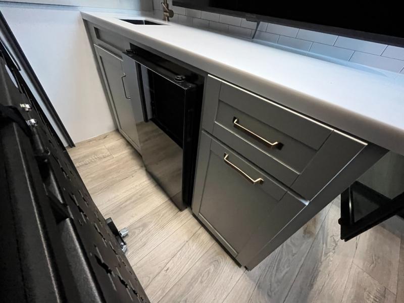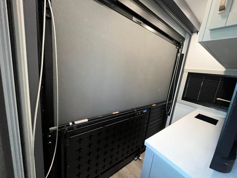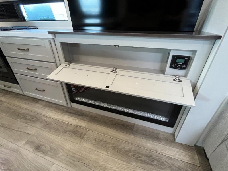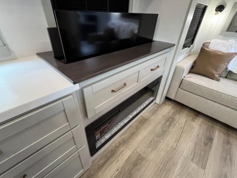 You're going to love every minute spent in this triple slide out fifth wheel! Once you arrive at the campground, you can put out the two side awnings, set up the rear patio and awning, then make lunch on the outdoor kitchen! There is also an outdoor TV here, a bar sink, and a refrigerator to keep drinks close by! Inside, the chef will find everything they need if the weather isn't cooperating, including a 30" residential microwave, 16 cu. ft. refrigerator, plus a large kitchen island, complete with dual trash bins and dog bowls at the foot. Your crew can get cozy on the tri-fold sofa that extends to a 54" x 70" bed for guests, and there is theater seating across from the televator and fireplace for easy viewing! You will find the front private bedroom ultra accommodating with its king bed slide out, sliding dresser top with hidden storage, your own TV, and a front wardrobe with shelves and a shoe rack. There is even washer and dryer prep if you want the option to make laundry day that much easier!