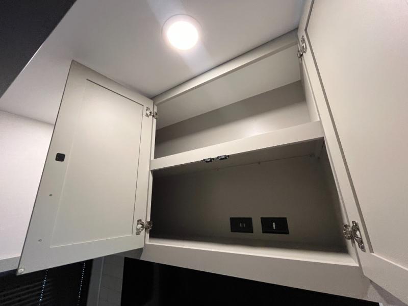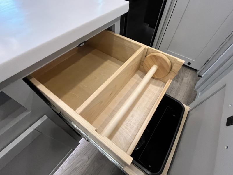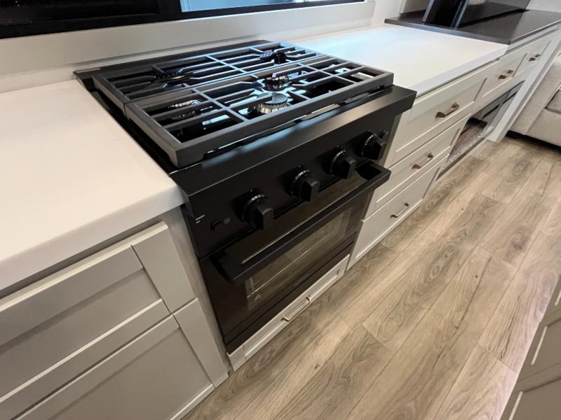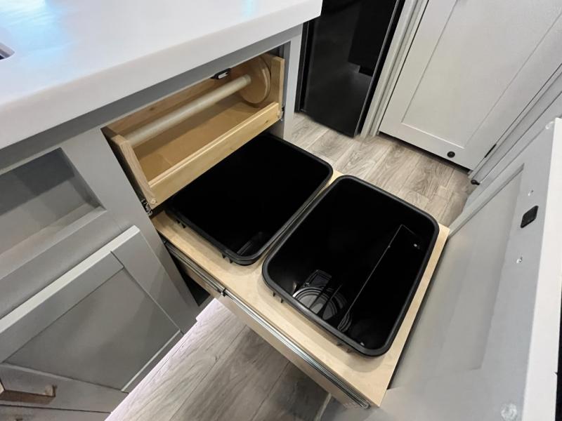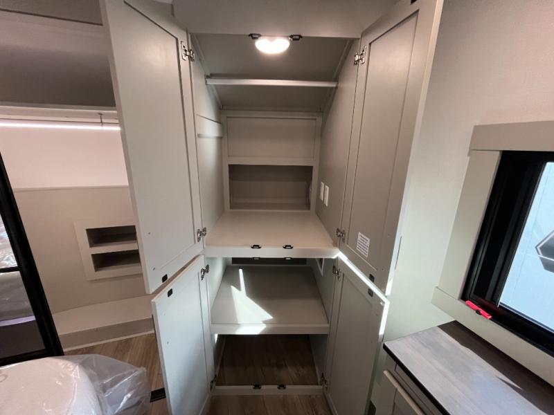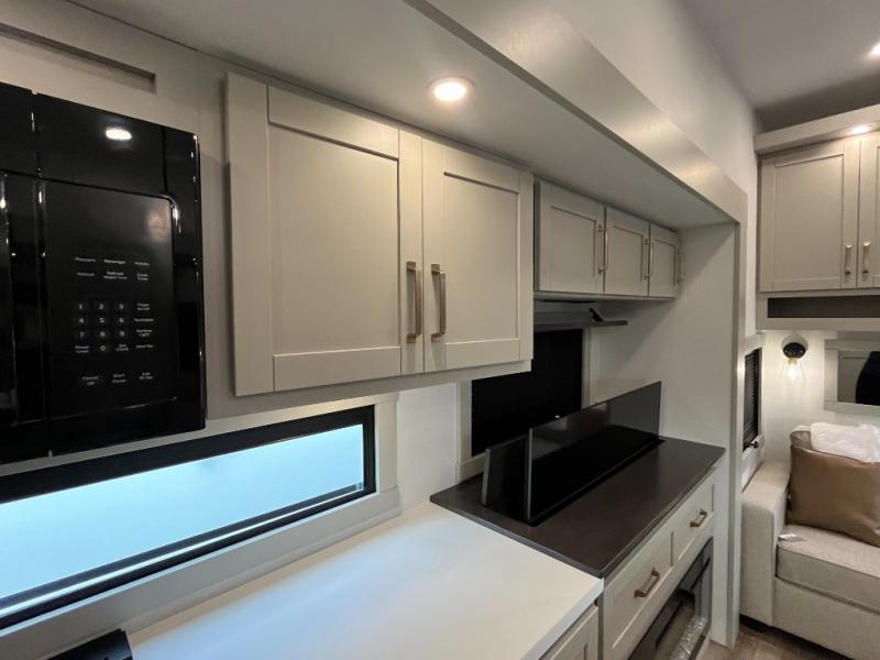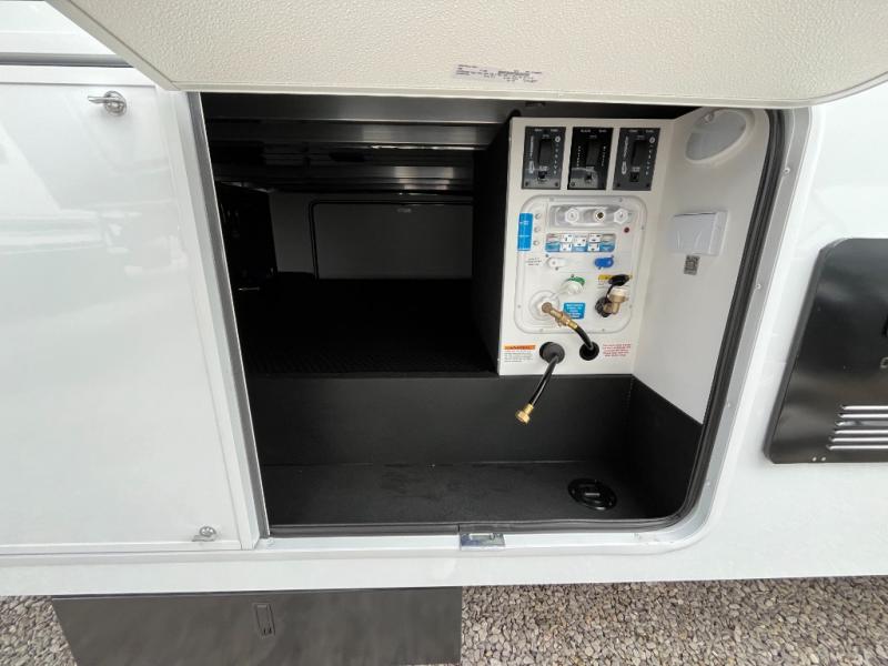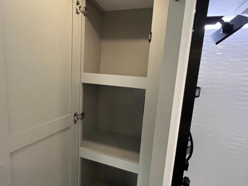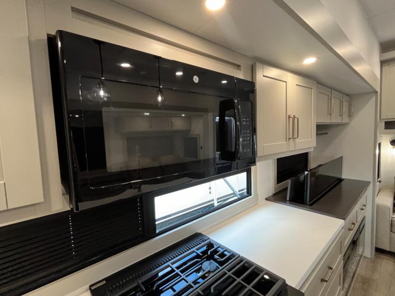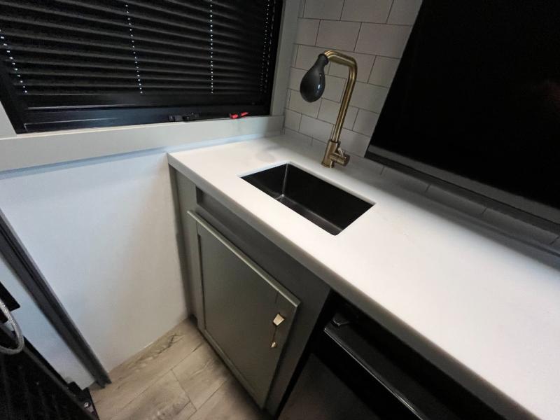You're going to love every minute spent in this triple slide out fifth wheel! Once you arrive at the campground, you can put out the two side awnings, set up the rear patio and awning, then make lunch on the outdoor kitchen! There is also an outdoor TV here, a bar sink, and a refrigerator to keep drinks close by! Inside, the chef will find everything they need if the weather isn't cooperating, including a 30" residential microwave, 16 cu. ft. refrigerator, plus a large kitchen island, complete with dual trash bins and dog bowls at the foot. Your crew can get cozy on the tri-fold sofa that extends to a 54" x 70" bed for guests, and there is theater seating across from the televator and fireplace for easy viewing! You will find the front private bedroom ultra accommodating with its king bed slide out, sliding dresser top with hidden storage, your own TV, and a front wardrobe with shelves and a shoe rack. There is even washer and dryer prep if you want the option to make laundry day that much easier!