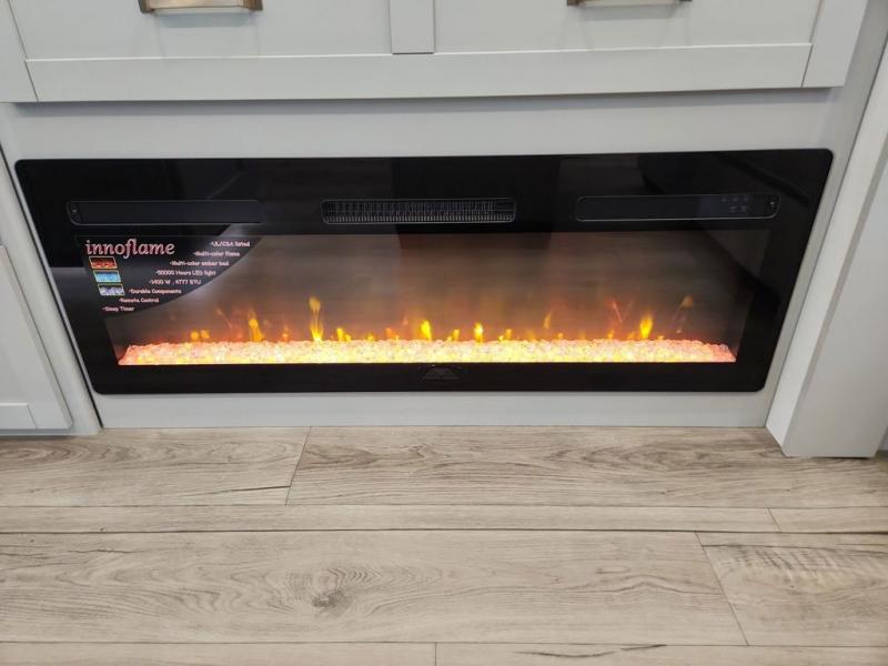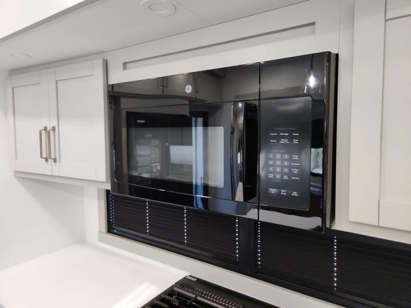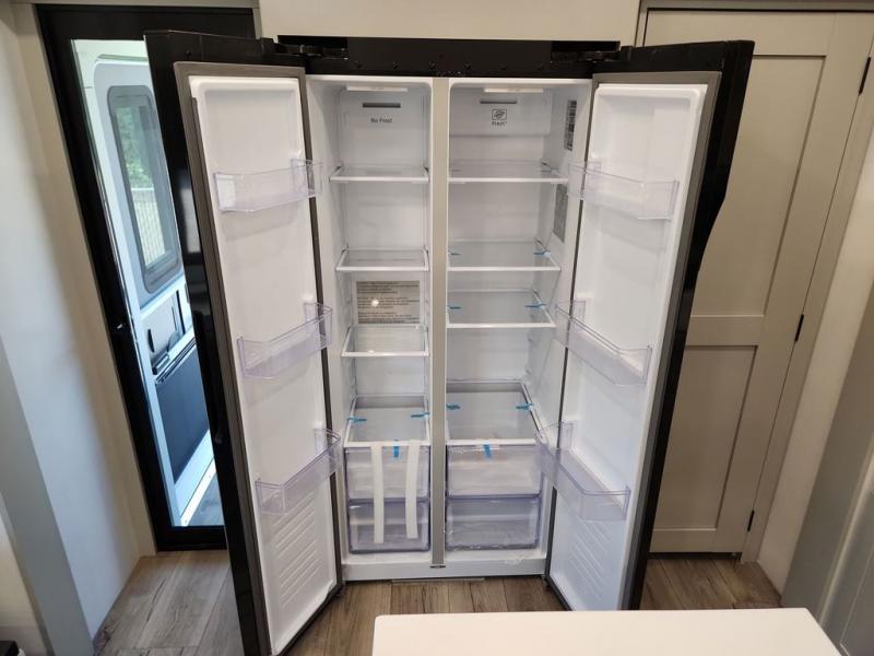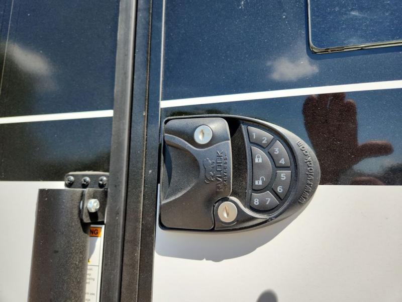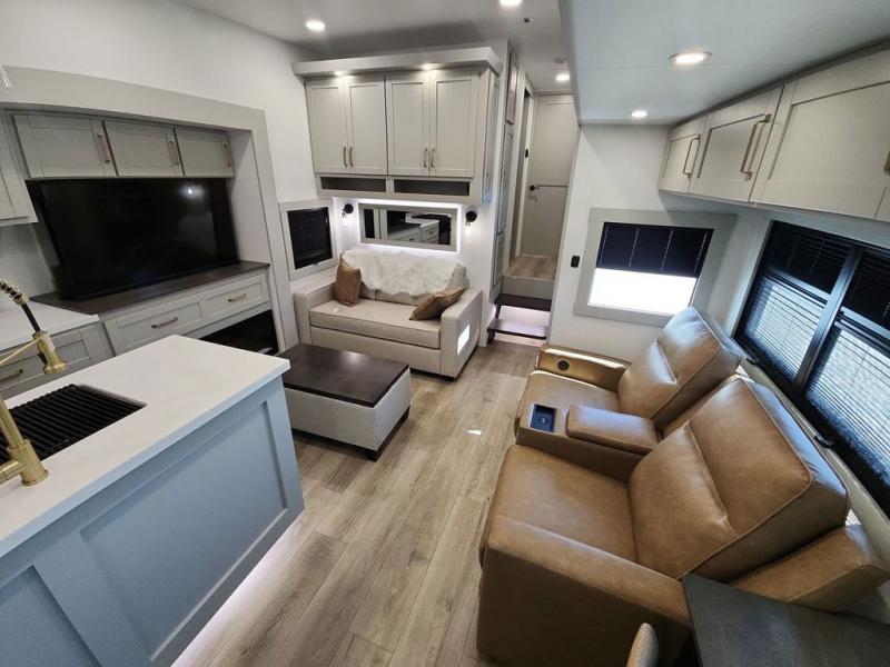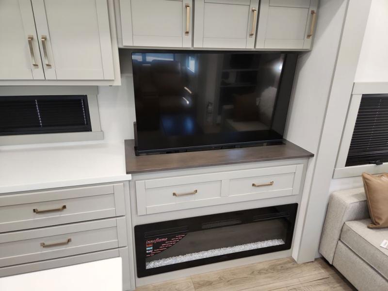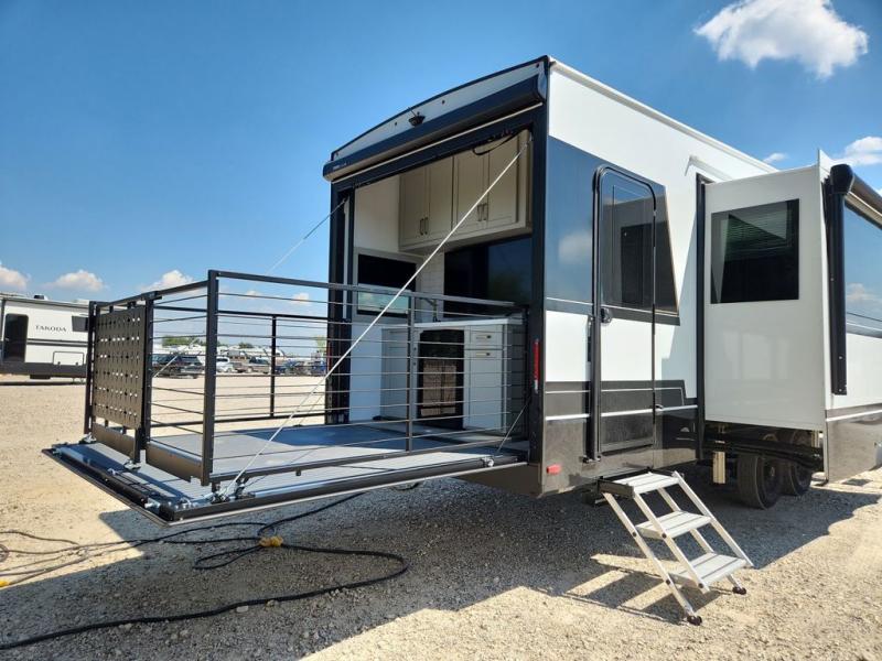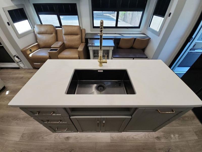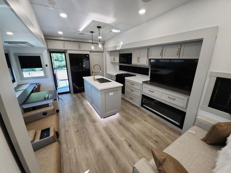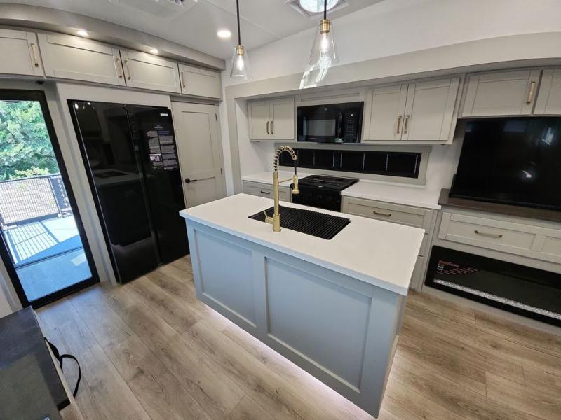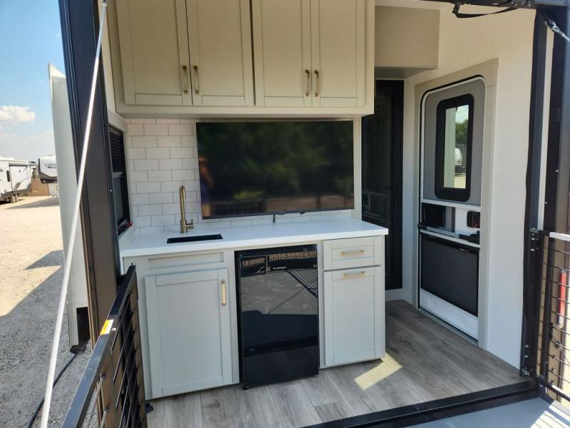 You're going to love every minute spent in this triple slide out fifth wheel! Once you arrive at the campground, you can put out the two side awnings, set up the rear patio and awning, then make lunch on the outdoor kitchen! There is also an outdoor TV here, a bar sink, and a refrigerator to keep drinks close by! Inside, the chef will find everything they need if the weather isn't cooperating, including a 30" residential microwave, 16 cu. ft. refrigerator, plus a large kitchen island, complete with dual trash bins and dog bowls at the foot. Your crew can get cozy on the tri-fold sofa that extends to a 54" x 70" bed for guests, and there is theater seating across from the televator and fireplace for easy viewing! You will find the front private bedroom ultra accommodating with its king bed slide out, sliding dresser top with hidden storage, your own TV, and a front wardrobe with shelves and a shoe rack. There is even washer and dryer prep if you want the option to make laundry day that much easier!