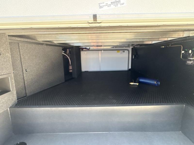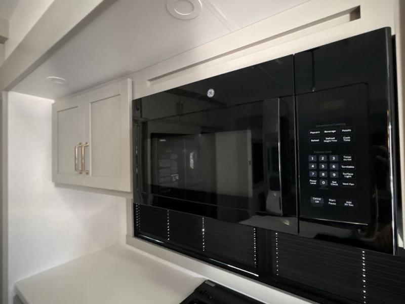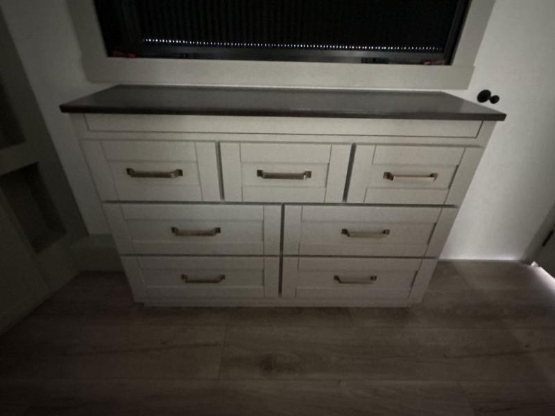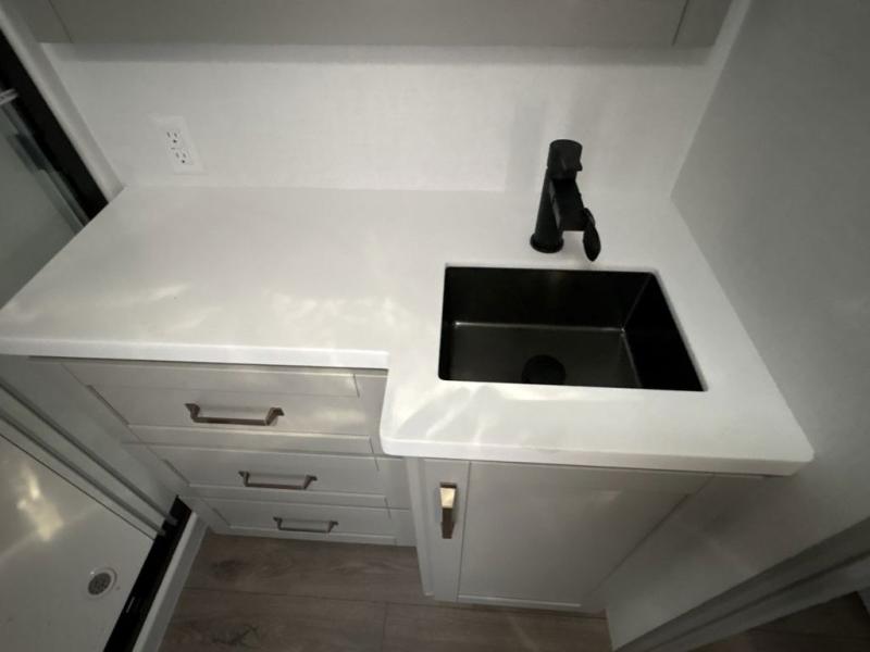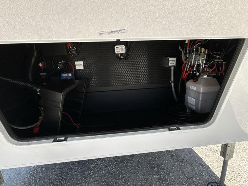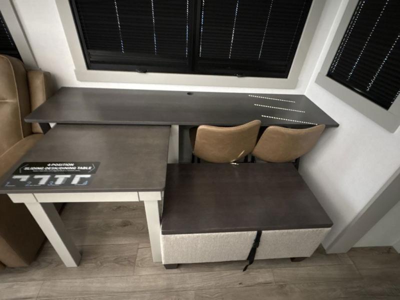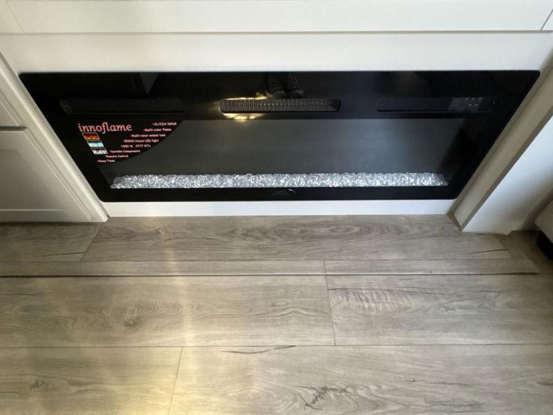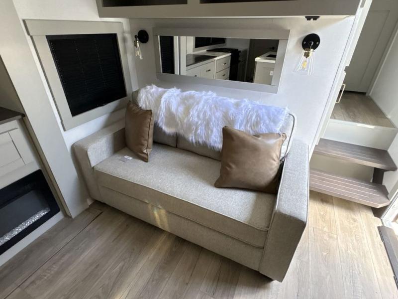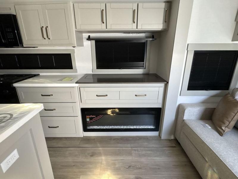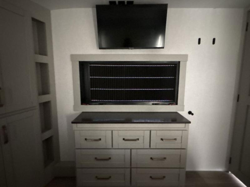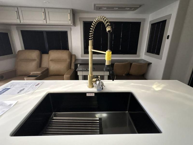 You're going to love every minute spent in this triple slide out fifth wheel! Once you arrive at the campground, you can put out the two side awnings, set up the rear patio and awning, then make lunch on the outdoor kitchen! There is also an outdoor TV here, a bar sink, and a refrigerator to keep drinks close by! Inside, the chef will find everything they need if the weather isn't cooperating, including a 30" residential microwave, 16 cu. ft. refrigerator, plus a large kitchen island, complete with dual trash bins and dog bowls at the foot. Your crew can get cozy on the tri-fold sofa that extends to a 54" x 70" bed for guests, and there is theater seating across from the televator and fireplace for easy viewing! You will find the front private bedroom ultra accommodating with its king bed slide out, sliding dresser top with hidden storage, your own TV, and a front wardrobe with shelves and a shoe rack. There is even washer and dryer prep if you want the option to make laundry day that much easier!
