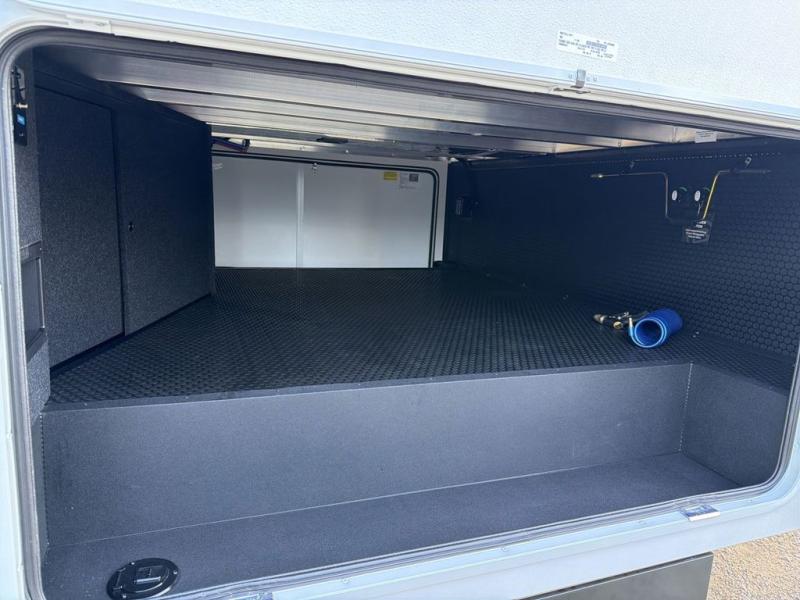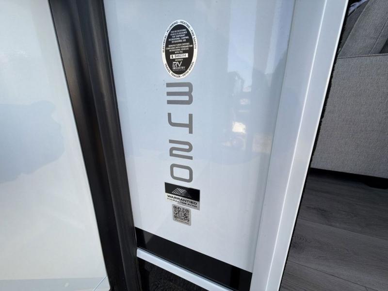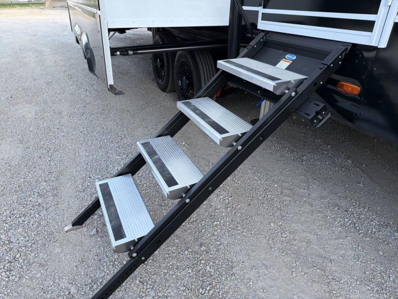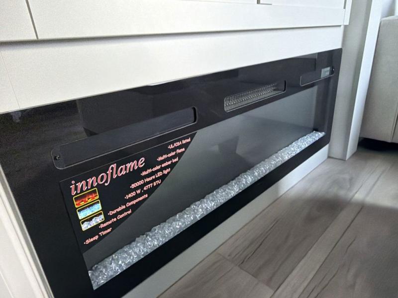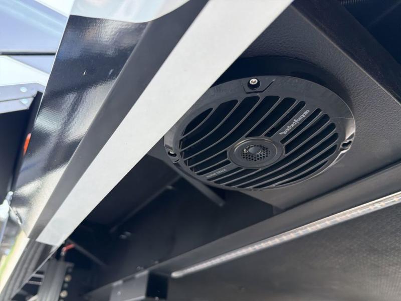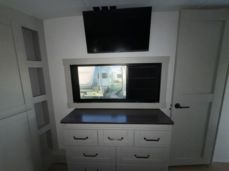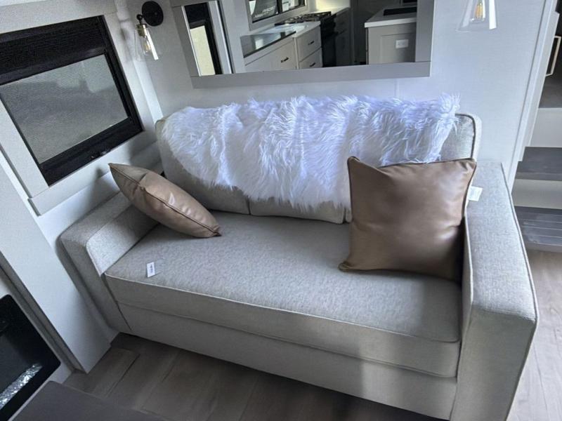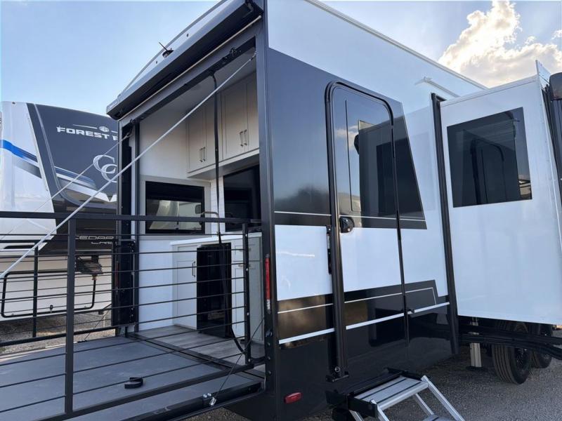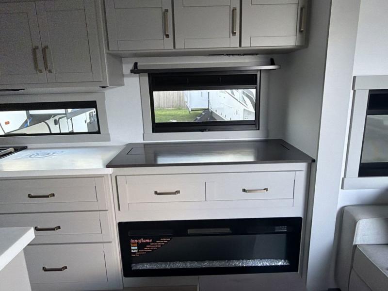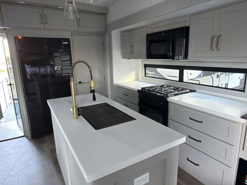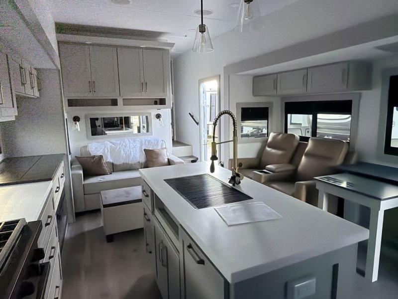 You're going to love every minute spent in this triple slide out fifth wheel! Once you arrive at the campground, you can put out the two side awnings, set up the rear patio and awning, then make lunch on the outdoor kitchen! There is also an outdoor TV here, a bar sink, and a refrigerator to keep drinks close by! Inside, the chef will find everything they need if the weather isn't cooperating, including a 30" residential microwave, 16 cu. ft. refrigerator, plus a large kitchen island, complete with dual trash bins and dog bowls at the foot. Your crew can get cozy on the tri-fold sofa that extends to a 54" x 70" bed for guests, and there is theater seating across from the televator and fireplace for easy viewing! You will find the front private bedroom ultra accommodating with its king bed slide out, sliding dresser top with hidden storage, your own TV, and a front wardrobe with shelves and a shoe rack. There is even washer and dryer prep if you want the option to make laundry day that much easier!