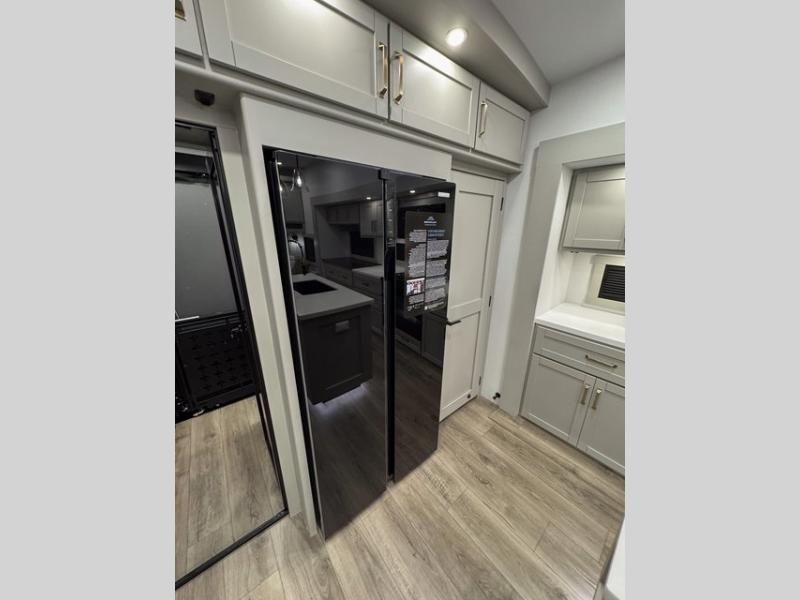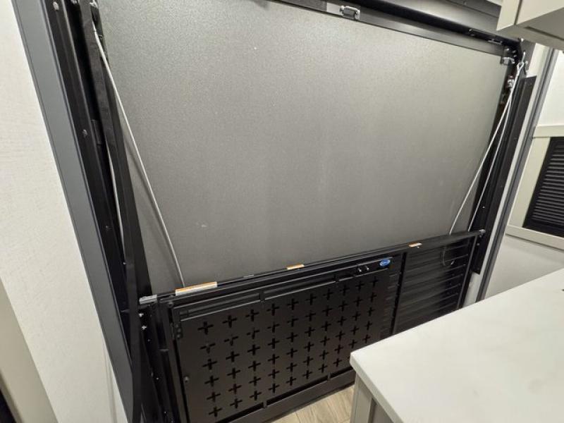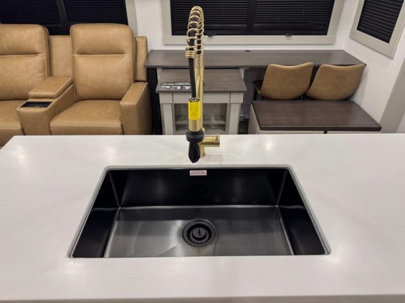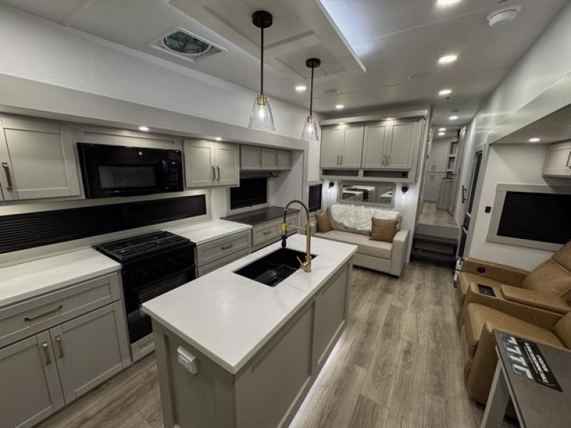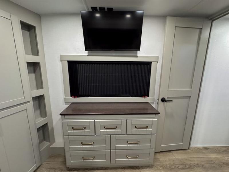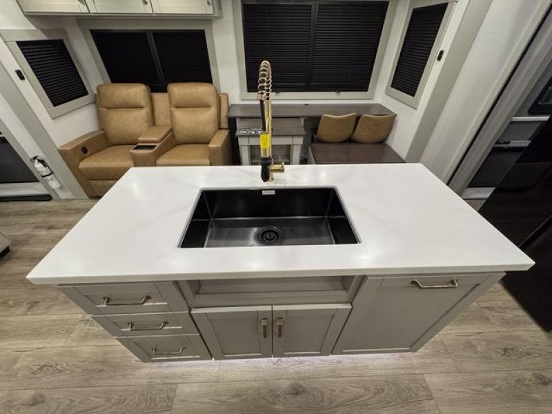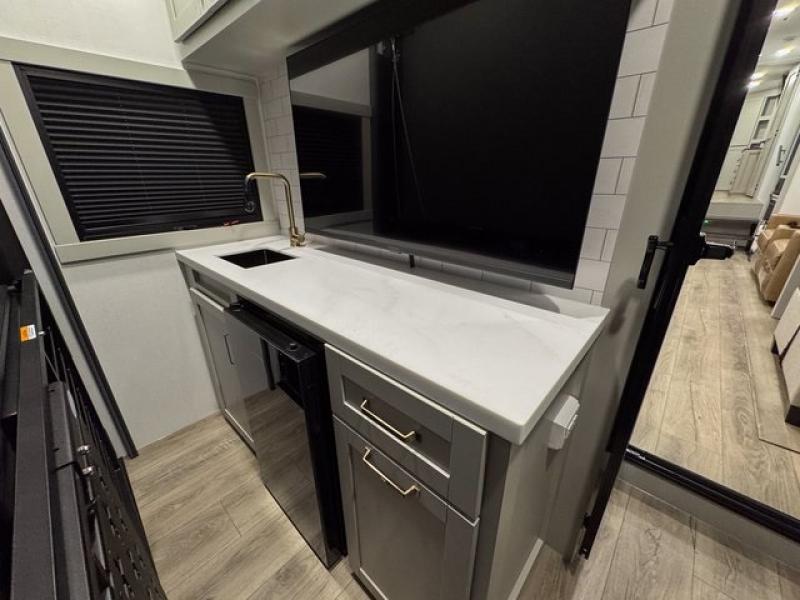 You're going to love every minute spent in this triple slide out fifth wheel! Once you arrive at the campground, you can put out the two side awnings, set up the rear patio and awning, then make lunch on the outdoor kitchen! There is also an outdoor TV here, a bar sink, and a refrigerator to keep drinks close by! Inside, the chef will find everything they need if the weather isn't cooperating, including a 30" residential microwave, 16 cu. ft. refrigerator, plus a large kitchen island, complete with dual trash bins and dog bowls at the foot. Your crew can get cozy on the tri-fold sofa that extends to a 54" x 70" bed for guests, and there is theater seating across from the televator and fireplace for easy viewing! You will find the front private bedroom ultra accommodating with its king bed slide out, sliding dresser top with hidden storage, your own TV, and a front wardrobe with shelves and a shoe rack. There is even washer and dryer prep if you want the option to make laundry day that much easier!