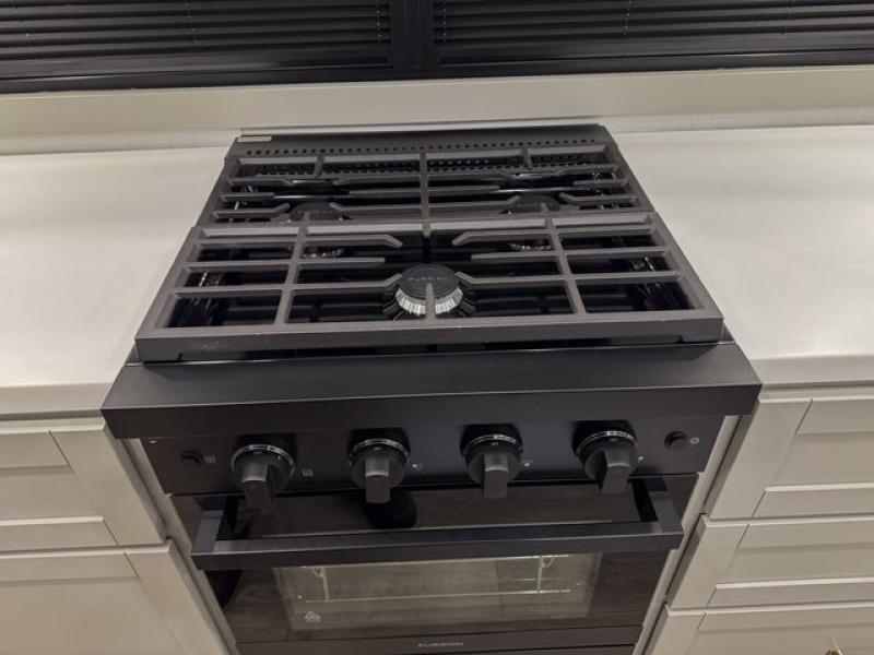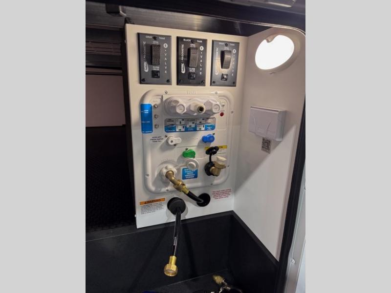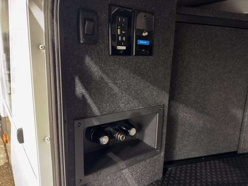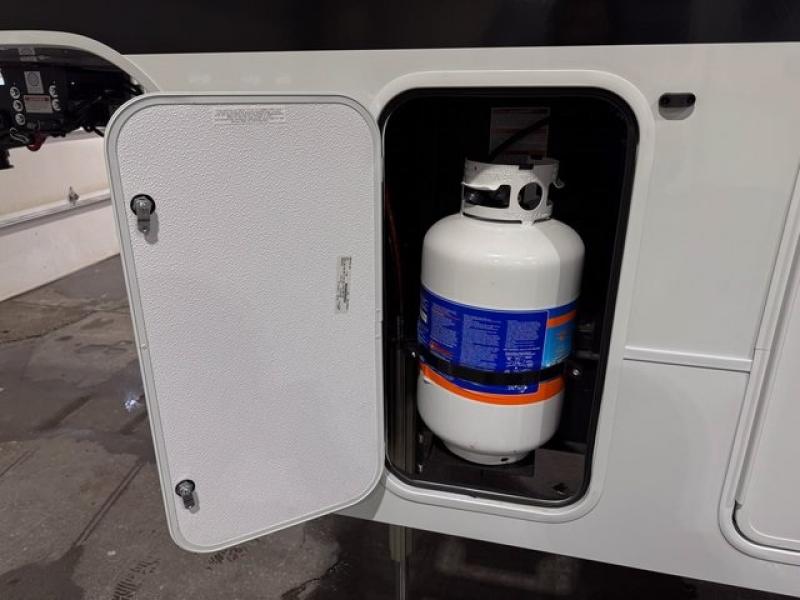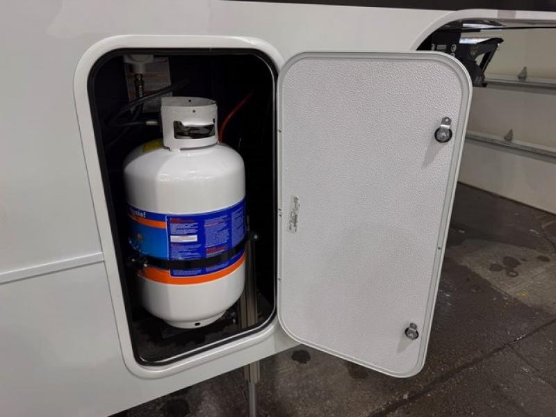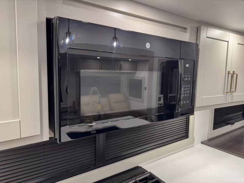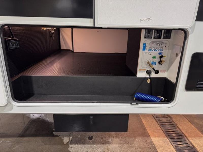 You're going to love every minute spent in this triple slide out fifth wheel! Once you arrive at the campground, you can put out the two side awnings, set up the rear patio and awning, then make lunch on the outdoor kitchen! There is also an outdoor TV here, a bar sink, and a refrigerator to keep drinks close by! Inside, the chef will find everything they need if the weather isn't cooperating, including a 30" residential microwave, 16 cu. ft. refrigerator, plus a large kitchen island, complete with dual trash bins and dog bowls at the foot. Your crew can get cozy on the tri-fold sofa that extends to a 54" x 70" bed for guests, and there is theater seating across from the televator and fireplace for easy viewing! You will find the front private bedroom ultra accommodating with its king bed slide out, sliding dresser top with hidden storage, your own TV, and a front wardrobe with shelves and a shoe rack. There is even washer and dryer prep if you want the option to make laundry day that much easier!