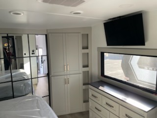 You're going to love every minute spent in this triple slide out fifth wheel! Once you arrive at the campground, you can put out the two side awnings, set up the rear patio and awning, then make lunch on the outdoor kitchen! There is also an outdoor TV here, a bar sink, and a refrigerator to keep drinks close by! Inside, the chef will find everything they need if the weather isn't cooperating, including a 30" residential microwave, 16 cu. ft. refrigerator, plus a large kitchen island, complete with dual trash bins and dog bowls at the foot. Your crew can get cozy on the tri-fold sofa that extends to a 54" x 70" bed for guests, and there is theater seating across from the televator and fireplace for easy viewing! You will find the front private bedroom ultra accommodating with its king bed slide out, sliding dresser top with hidden storage, your own TV, and a front wardrobe with shelves and a shoe rack. There is even washer and dryer prep if you want the option to make laundry day that much easier!