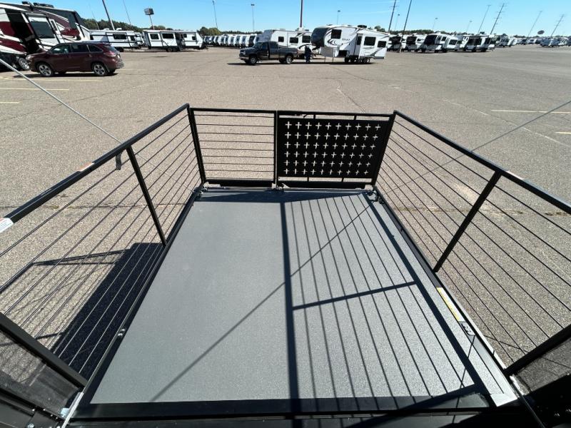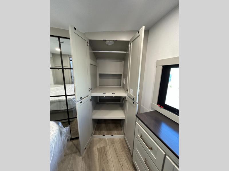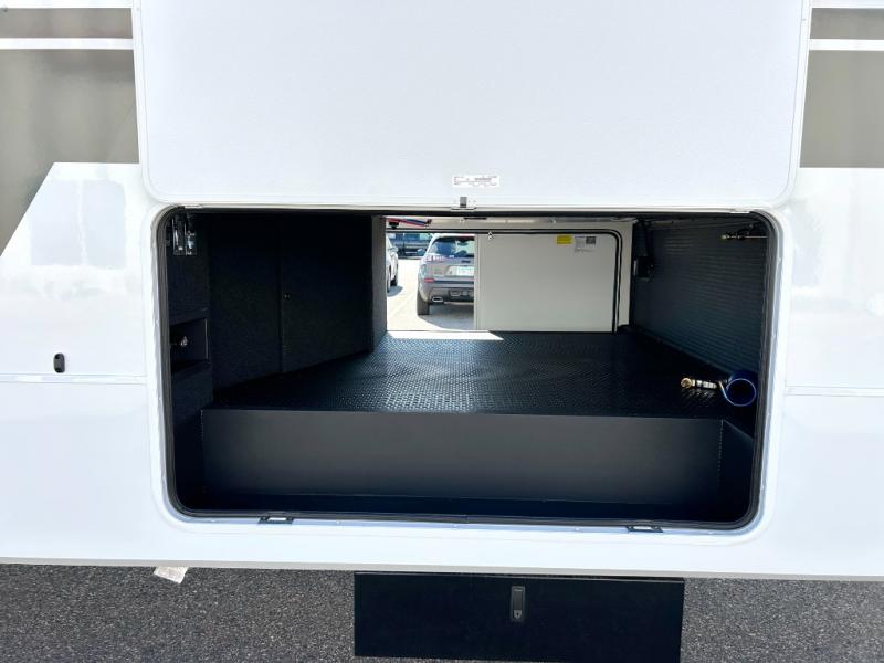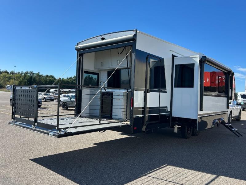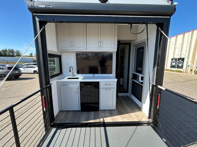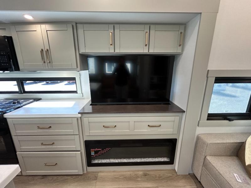 You're going to love every minute spent in this triple slide out fifth wheel! Once you arrive at the campground, you can put out the two side awnings, set up the rear patio and awning, then make lunch on the outdoor kitchen! There is also an outdoor TV here, a bar sink, and a refrigerator to keep drinks close by! Inside, the chef will find everything they need if the weather isn't cooperating, including a 30" residential microwave, 16 cu. ft. refrigerator, plus a large kitchen island, complete with dual trash bins and dog bowls at the foot. Your crew can get cozy on the tri-fold sofa that extends to a 54" x 70" bed for guests, and there is theater seating across from the televator and fireplace for easy viewing! You will find the front private bedroom ultra accommodating with its king bed slide out, sliding dresser top with hidden storage, your own TV, and a front wardrobe with shelves and a shoe rack. There is even washer and dryer prep if you want the option to make laundry day that much easier!