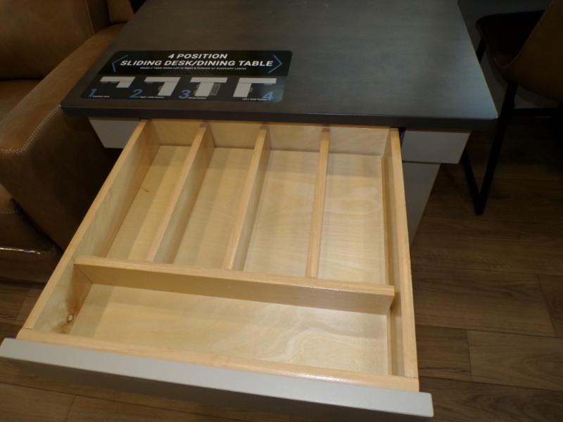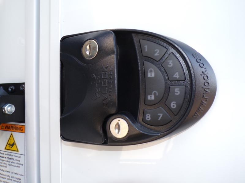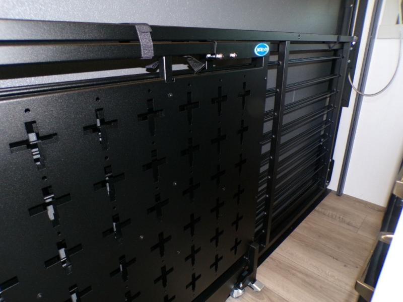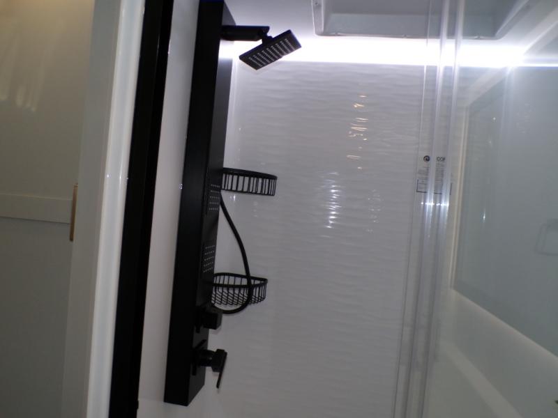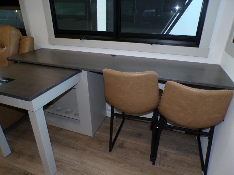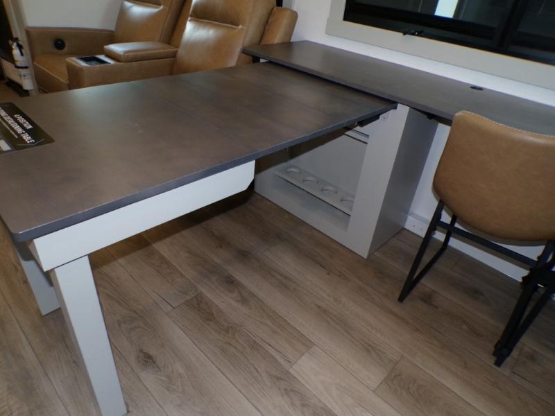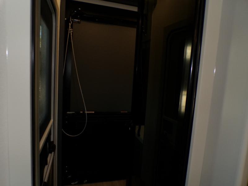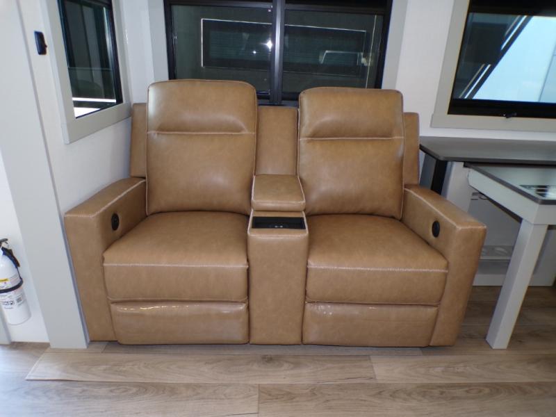 You're going to love every minute spent in this triple slide out fifth wheel! Once you arrive at the campground, you can put out the two side awnings, set up the rear patio and awning, then make lunch on the outdoor kitchen! There is also an outdoor TV here, a bar sink, and a refrigerator to keep drinks close by! Inside, the chef will find everything they need if the weather isn't cooperating, including a 30" residential microwave, 16 cu. ft. refrigerator, plus a large kitchen island, complete with dual trash bins and dog bowls at the foot. Your crew can get cozy on the tri-fold sofa that extends to a 54" x 70" bed for guests, and there is theater seating across from the televator and fireplace for easy viewing! You will find the front private bedroom ultra accommodating with its king bed slide out, sliding dresser top with hidden storage, your own TV, and a front wardrobe with shelves and a shoe rack. There is even washer and dryer prep if you want the option to make laundry day that much easier!
