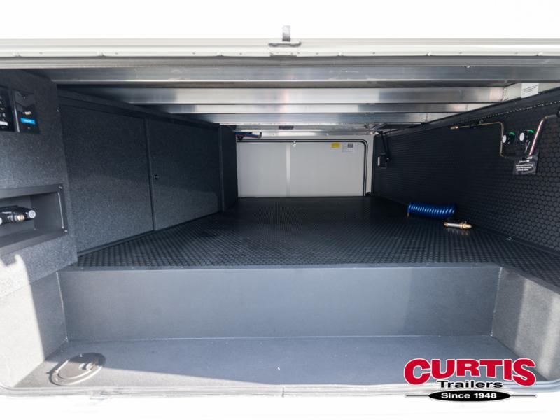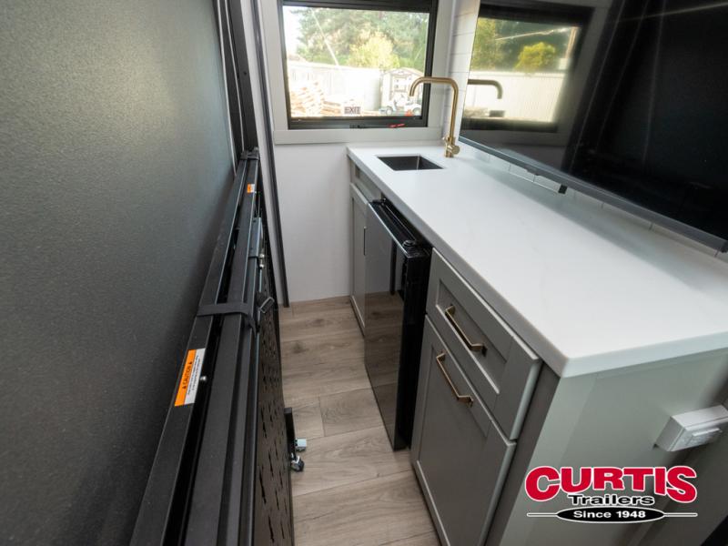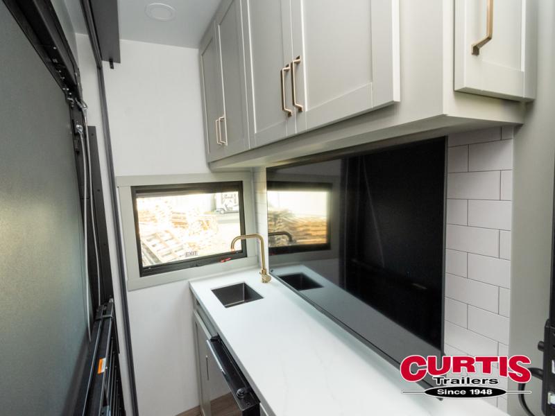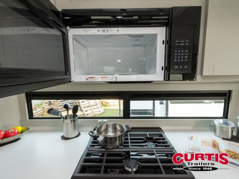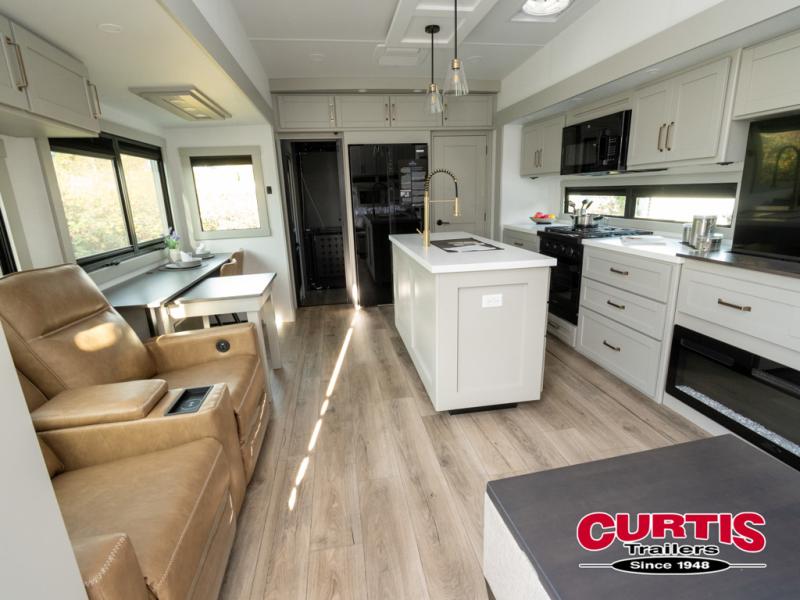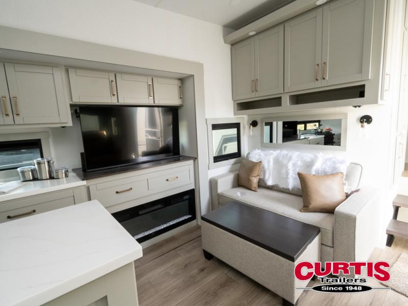 You're going to love every minute spent in this triple slide out fifth wheel! Once you arrive at the campground, you can put out the two side awnings, set up the rear patio and awning, then make lunch on the outdoor kitchen! There is also an outdoor TV here, a bar sink, and a refrigerator to keep drinks close by! Inside, the chef will find everything they need if the weather isn't cooperating, including a 30" residential microwave, 16 cu. ft. refrigerator, plus a large kitchen island, complete with dual trash bins and dog bowls at the foot. Your crew can get cozy on the tri-fold sofa that extends to a 54" x 70" bed for guests, and there is theater seating across from the televator and fireplace for easy viewing! You will find the front private bedroom ultra accommodating with its king bed slide out, sliding dresser top with hidden storage, your own TV, and a front wardrobe with shelves and a shoe rack. There is even washer and dryer prep if you want the option to make laundry day that much easier!
