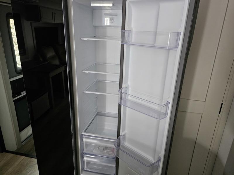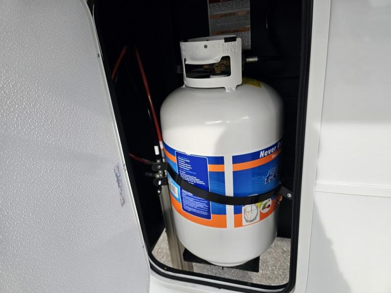 You're going to love every minute spent in this triple slide out fifth wheel! Once you arrive at the campground, you can put out the two side awnings, set up the rear patio and awning, then make lunch on the outdoor kitchen! There is also an outdoor TV here, a bar sink, and a refrigerator to keep drinks close by! Inside, the chef will find everything they need if the weather isn't cooperating, including a 30" residential microwave, 16 cu. ft. refrigerator, plus a large kitchen island, complete with dual trash bins and dog bowls at the foot. Your crew can get cozy on the tri-fold sofa that extends to a 54" x 70" bed for guests, and there is theater seating across from the televator and fireplace for easy viewing! You will find the front private bedroom ultra accommodating with its king bed slide out, sliding dresser top with hidden storage, your own TV, and a front wardrobe with shelves and a shoe rack. There is even washer and dryer prep if you want the option to make laundry day that much easier!