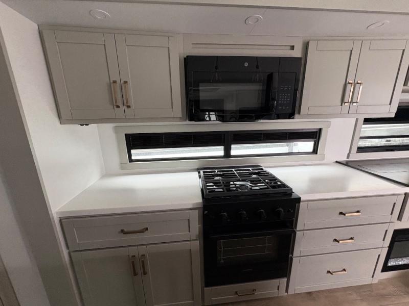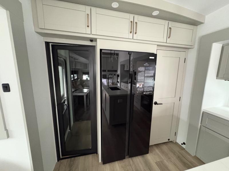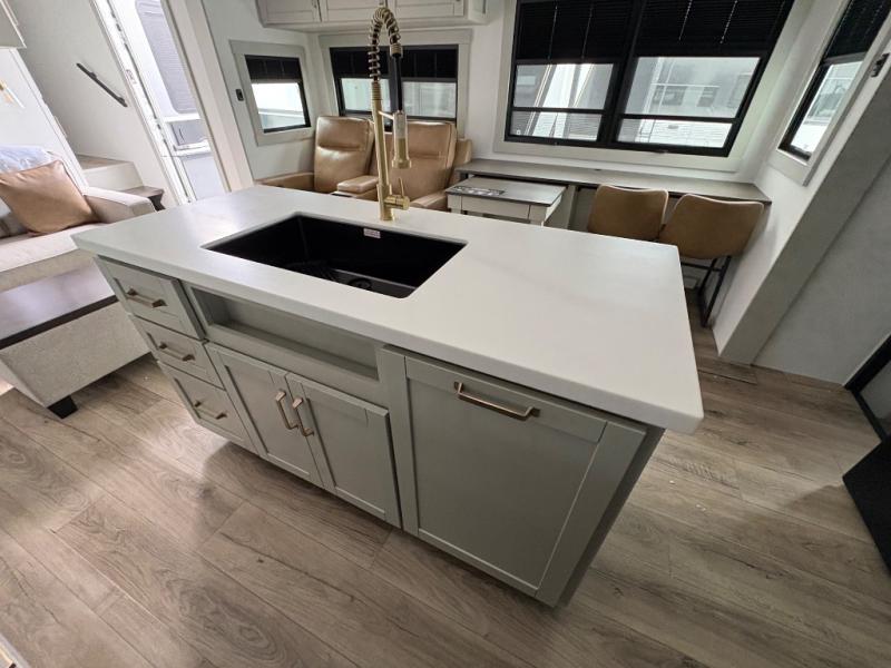 You're going to love every minute spent in this triple slide out fifth wheel! Once you arrive at the campground, you can put out the two side awnings, set up the rear patio and awning, then make lunch on the outdoor kitchen! There is also an outdoor TV here, a bar sink, and a refrigerator to keep drinks close by! Inside, the chef will find everything they need if the weather isn't cooperating, including a 30" residential microwave, 16 cu. ft. refrigerator, plus a large kitchen island, complete with dual trash bins and dog bowls at the foot. Your crew can get cozy on the tri-fold sofa that extends to a 54" x 70" bed for guests, and there is theater seating across from the televator and fireplace for easy viewing! You will find the front private bedroom ultra accommodating with its king bed slide out, sliding dresser top with hidden storage, your own TV, and a front wardrobe with shelves and a shoe rack. There is even washer and dryer prep if you want the option to make laundry day that much easier!