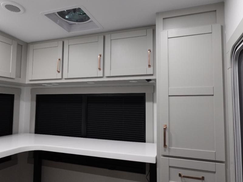 If you're looking for a feature-packed fifth wheel, this is the one! The rear multipurpose flex space can be used as an office/butler's pantry/laundry room/mudroom! There is an adjustable-height desk, storage space, plus washer and dryer prep. One of the dual entry doors is even found here for added convenience. The combined middle kitchen and living room includes dual opposing slides, a tri-fold sofa, theater seating, and a sliding desk/dining table. There is also a televator and fireplace, kitchen island with pet bowls, and an 84" pantry with adjustable shelving to name a few more features. A full bath towards the front includes a 30" x 42" shower, and the front private bedroom will feel just like home with its king bed slide out. There is also a sliding dresser top with hidden storage, bedside shelves, a front wardrobe, and washer and dryer prep here also!