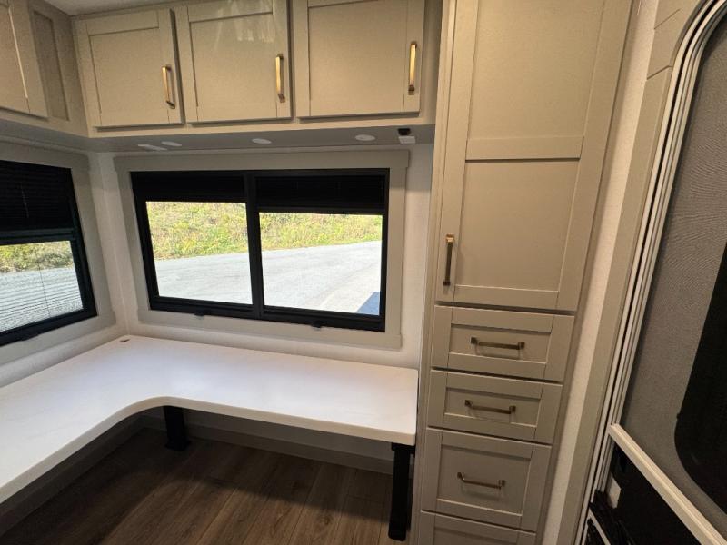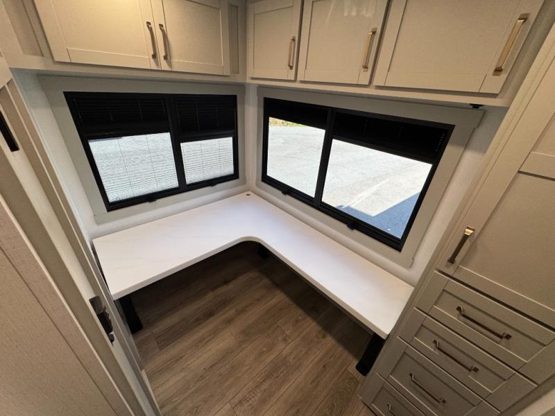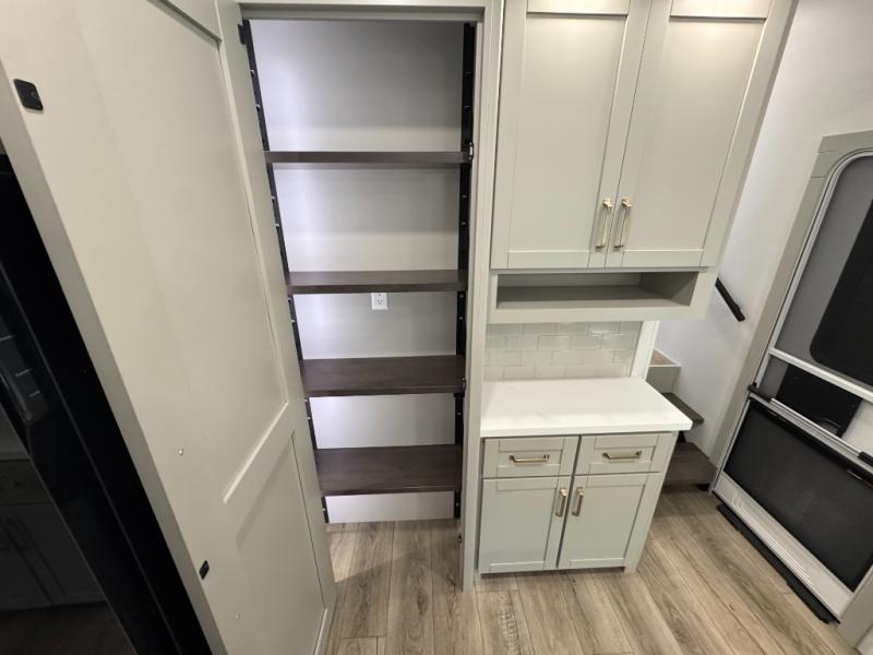 If you're looking for a feature-packed fifth wheel, this is the one! The rear multipurpose flex space can be used as an office/butler's pantry/laundry room/mudroom! There is an adjustable-height desk, storage space, plus washer and dryer prep. One of the dual entry doors is even found here for added convenience. The combined middle kitchen and living room includes dual opposing slides, a tri-fold sofa, theater seating, and a sliding desk/dining table. There is also a televator and fireplace, kitchen island with pet bowls, and an 84" pantry with adjustable shelving to name a few more features. A full bath towards the front includes a 30" x 42" shower, and the front private bedroom will feel just like home with its king bed slide out. There is also a sliding dresser top with hidden storage, bedside shelves, a front wardrobe, and washer and dryer prep here also!