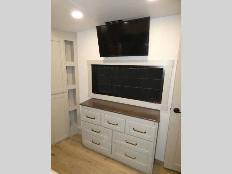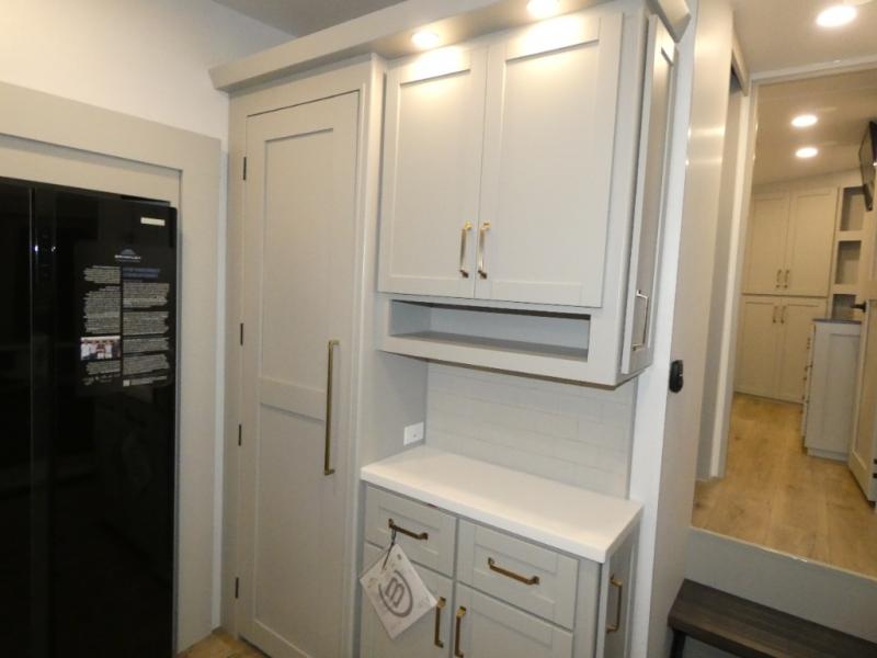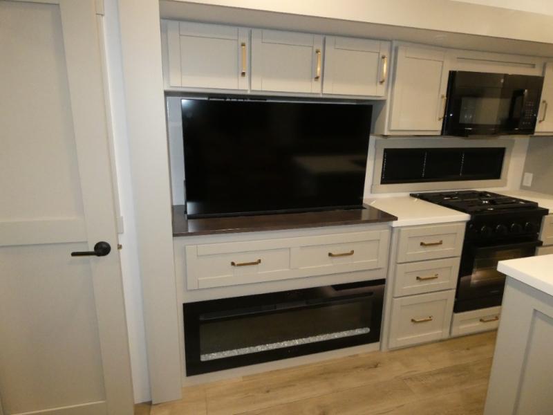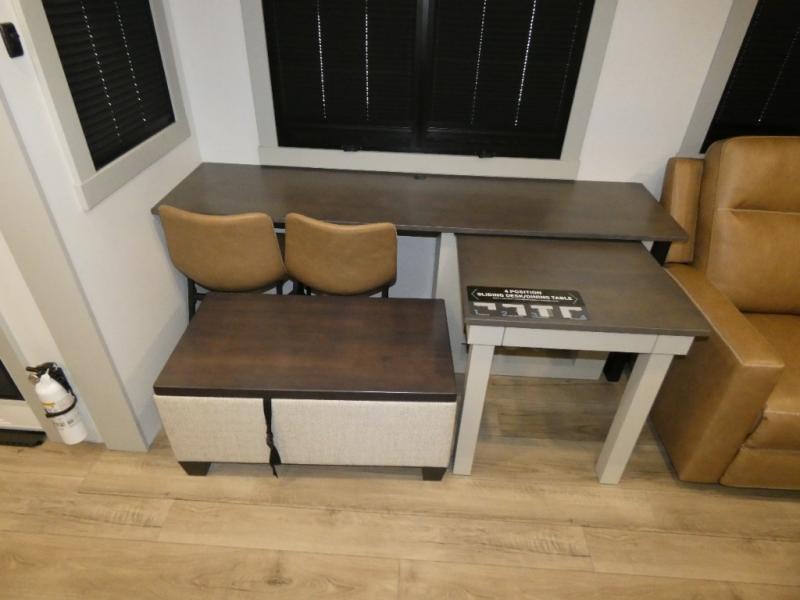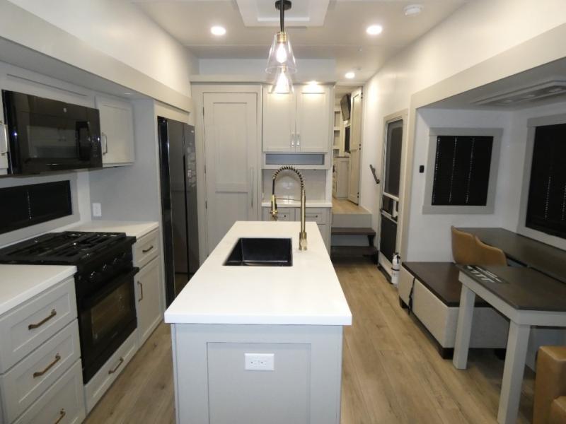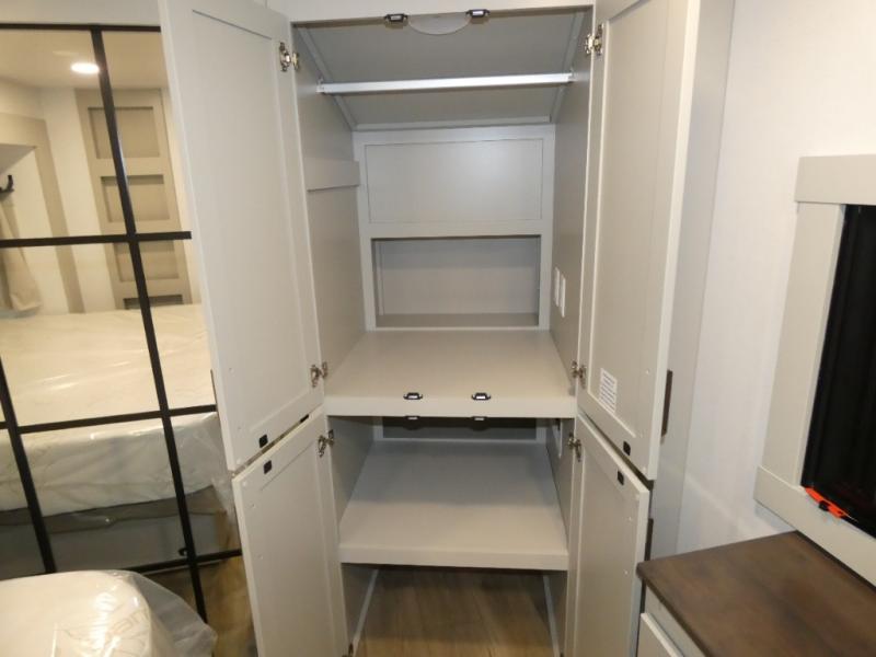 If you're looking for a feature-packed fifth wheel, this is the one! The rear multipurpose flex space can be used as an office/butler's pantry/laundry room/mudroom! There is an adjustable-height desk, storage space, plus washer and dryer prep. One of the dual entry doors is even found here for added convenience. The combined middle kitchen and living room includes dual opposing slides, a tri-fold sofa, theater seating, and a sliding desk/dining table. There is also a televator and fireplace, kitchen island with pet bowls, and an 84" pantry with adjustable shelving to name a few more features. A full bath towards the front includes a 30" x 42" shower, and the front private bedroom will feel just like home with its king bed slide out. There is also a sliding dresser top with hidden storage, bedside shelves, a front wardrobe, and washer and dryer prep here also!