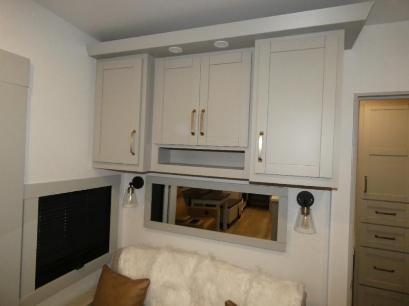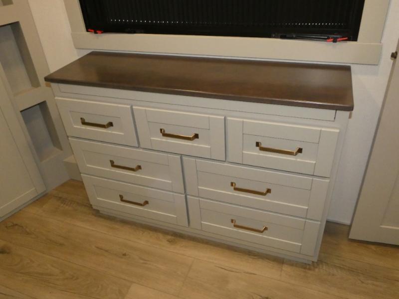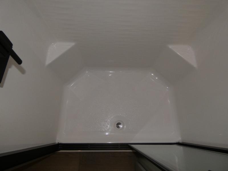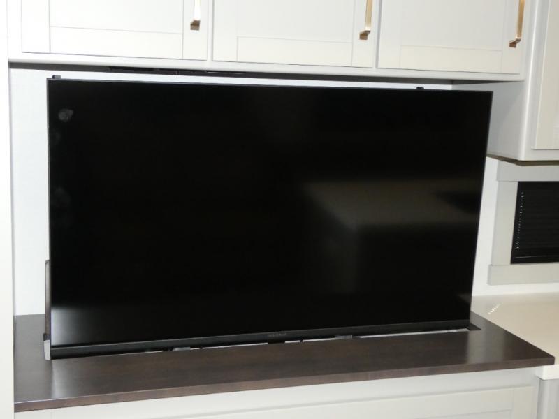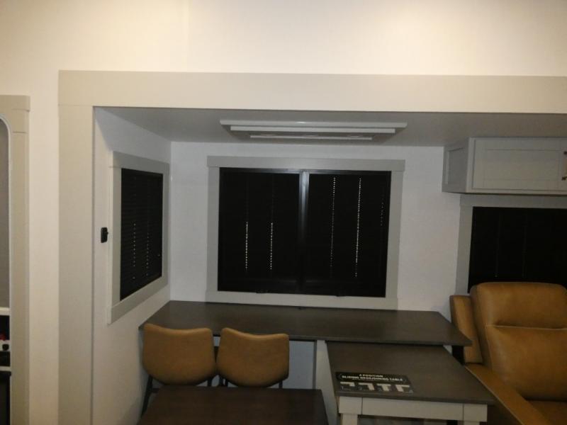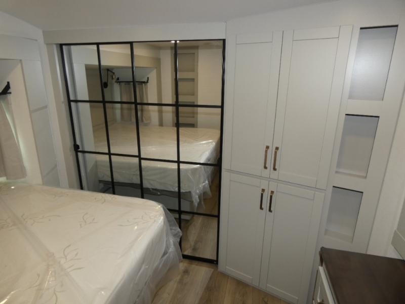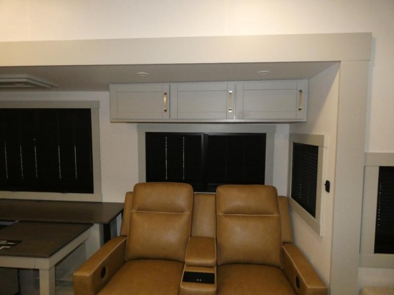 If you're looking for a feature-packed fifth wheel, this is the one! The rear multipurpose flex space can be used as an office/butler's pantry/laundry room/mudroom! There is an adjustable-height desk, storage space, plus washer and dryer prep. One of the dual entry doors is even found here for added convenience. The combined middle kitchen and living room includes dual opposing slides, a tri-fold sofa, theater seating, and a sliding desk/dining table. There is also a televator and fireplace, kitchen island with pet bowls, and an 84" pantry with adjustable shelving to name a few more features. A full bath towards the front includes a 30" x 42" shower, and the front private bedroom will feel just like home with its king bed slide out. There is also a sliding dresser top with hidden storage, bedside shelves, a front wardrobe, and washer and dryer prep here also!