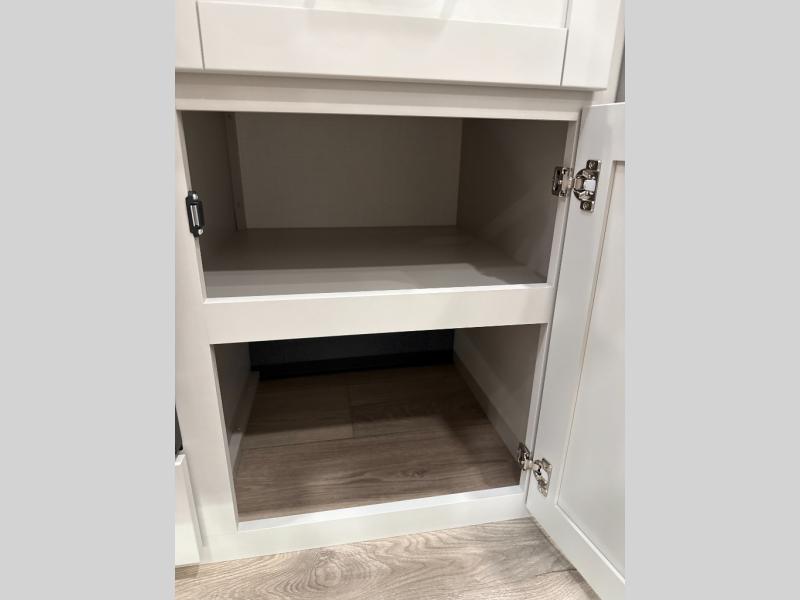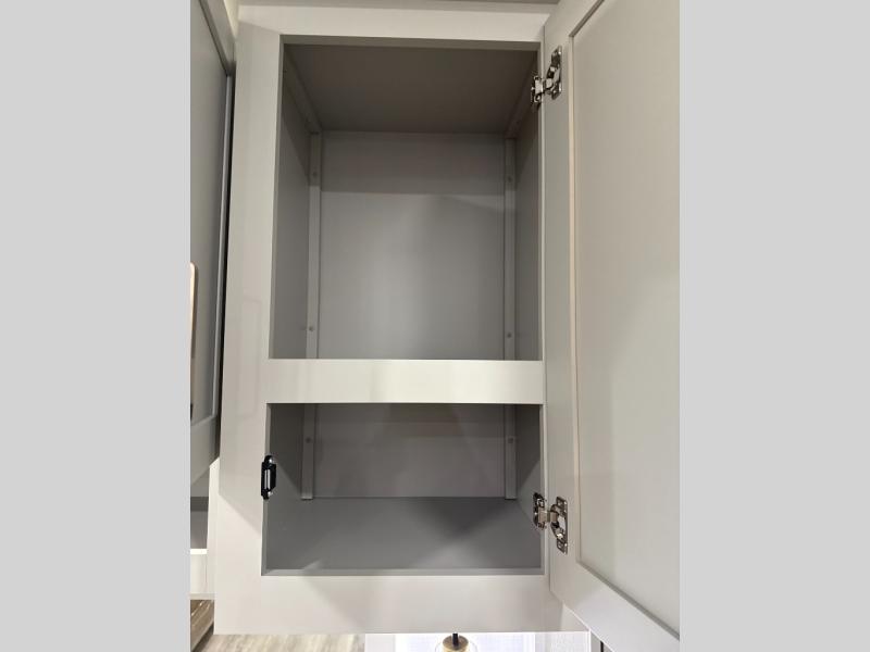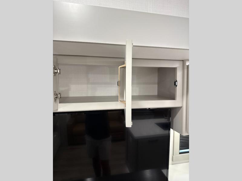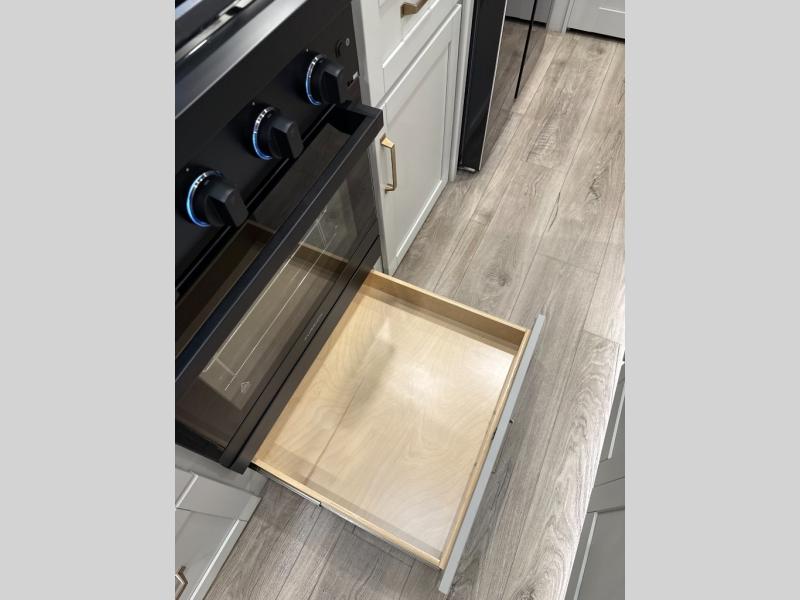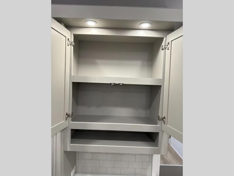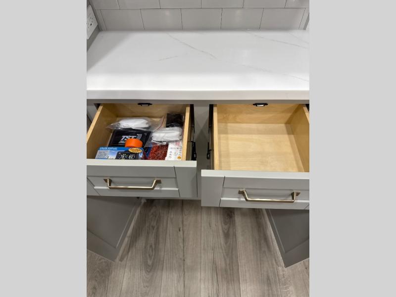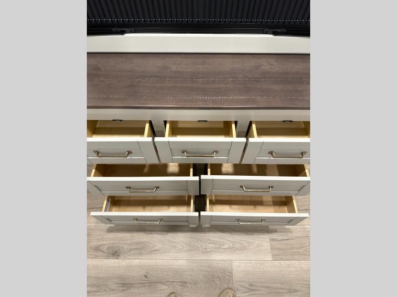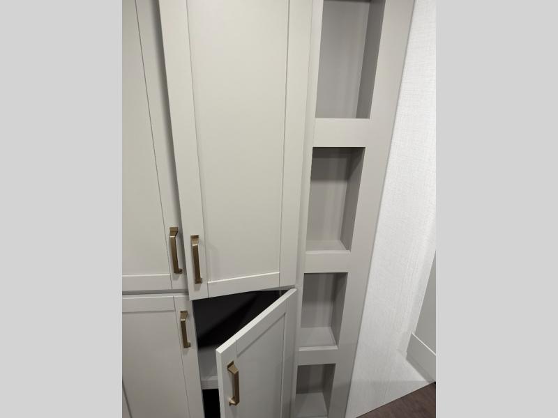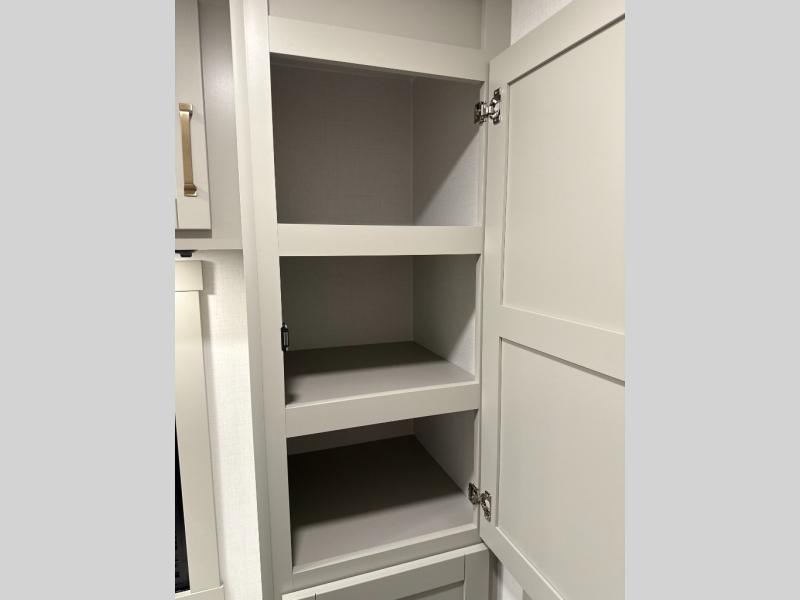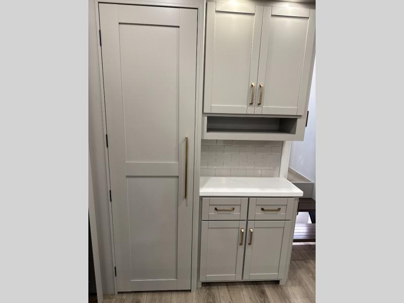 If you're looking for a feature-packed fifth wheel, this is the one! The rear multipurpose flex space can be used as an office/butler's pantry/laundry room/mudroom! There is an adjustable-height desk, storage space, plus washer and dryer prep. One of the dual entry doors is even found here for added convenience. The combined middle kitchen and living room includes dual opposing slides, a tri-fold sofa, theater seating, and a sliding desk/dining table. There is also a televator and fireplace, kitchen island with pet bowls, and an 84" pantry with adjustable shelving to name a few more features. A full bath towards the front includes a 30" x 42" shower, and the front private bedroom will feel just like home with its king bed slide out. There is also a sliding dresser top with hidden storage, bedside shelves, a front wardrobe, and washer and dryer prep here also!