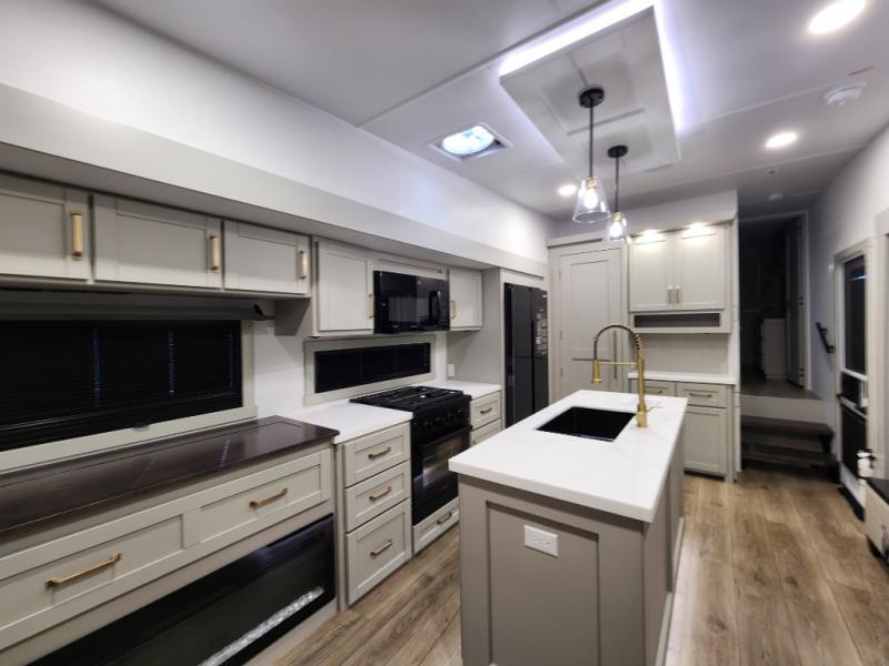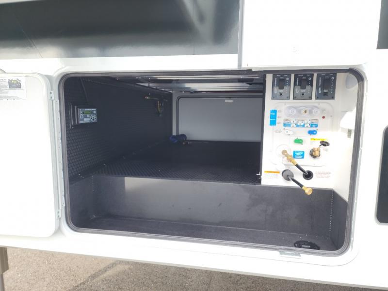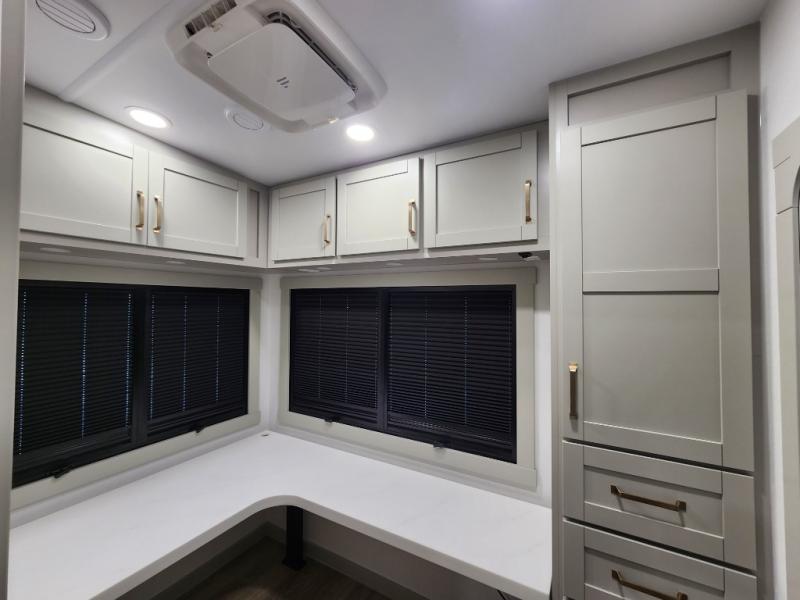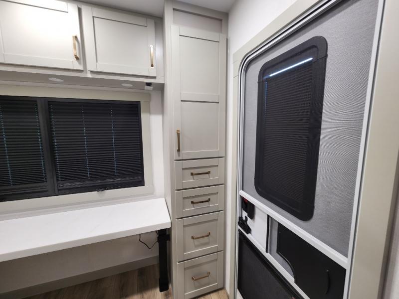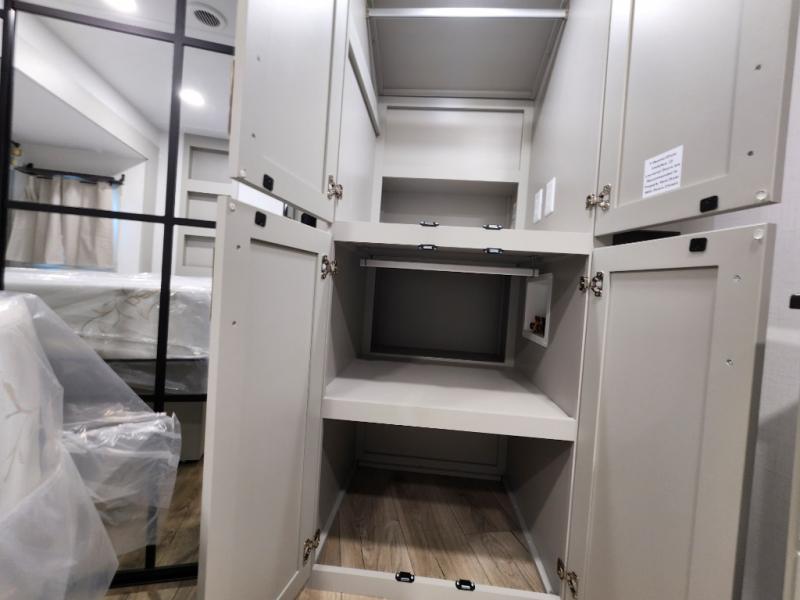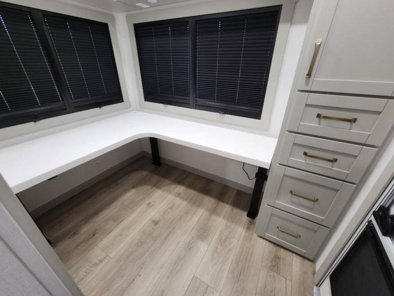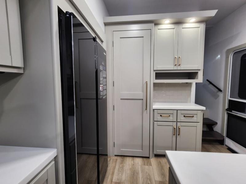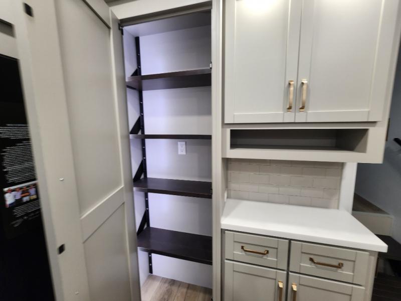 If you're looking for a feature-packed fifth wheel, this is the one! The rear multipurpose flex space can be used as an office/butler's pantry/laundry room/mudroom! There is an adjustable-height desk, storage space, plus washer and dryer prep. One of the dual entry doors is even found here for added convenience. The combined middle kitchen and living room includes dual opposing slides, a tri-fold sofa, theater seating, and a sliding desk/dining table. There is also a televator and fireplace, kitchen island with pet bowls, and an 84" pantry with adjustable shelving to name a few more features. A full bath towards the front includes a 30" x 42" shower, and the front private bedroom will feel just like home with its king bed slide out. There is also a sliding dresser top with hidden storage, bedside shelves, a front wardrobe, and washer and dryer prep here also!