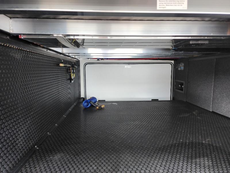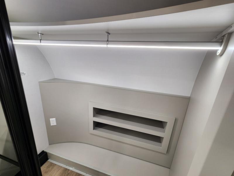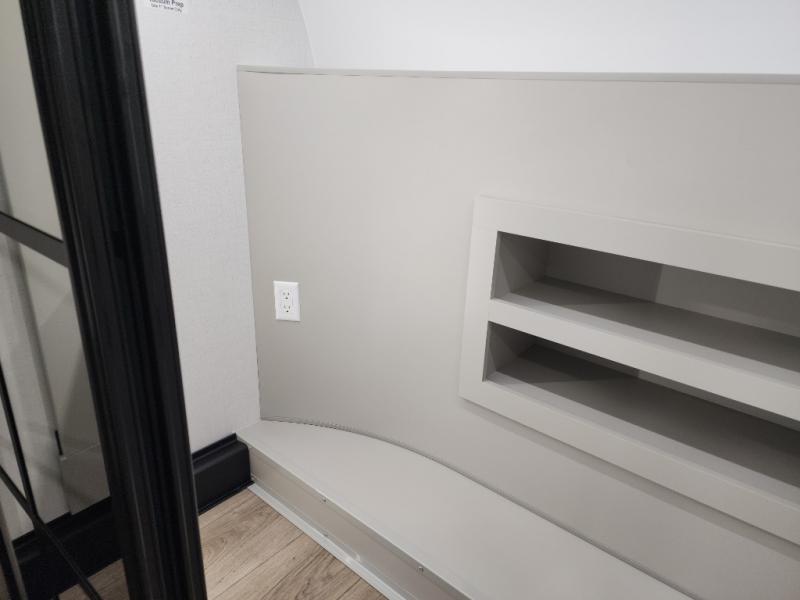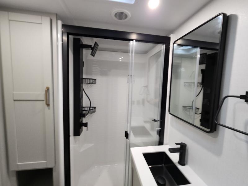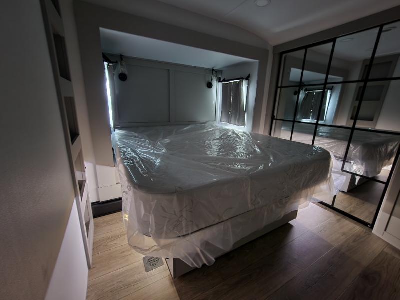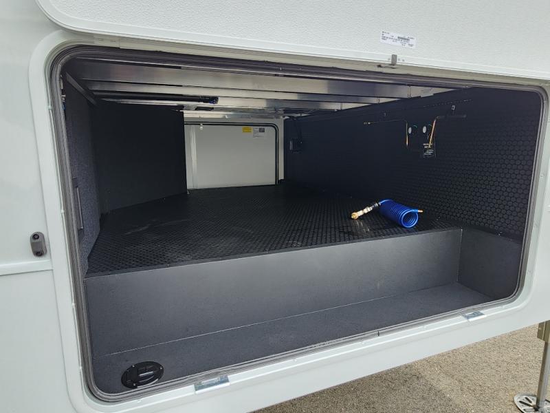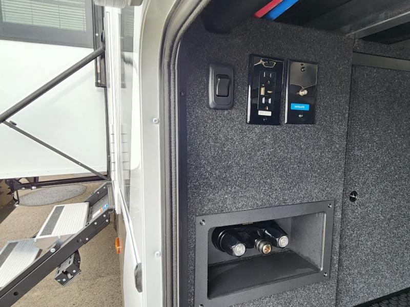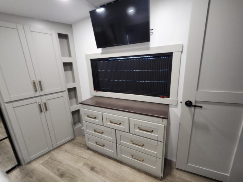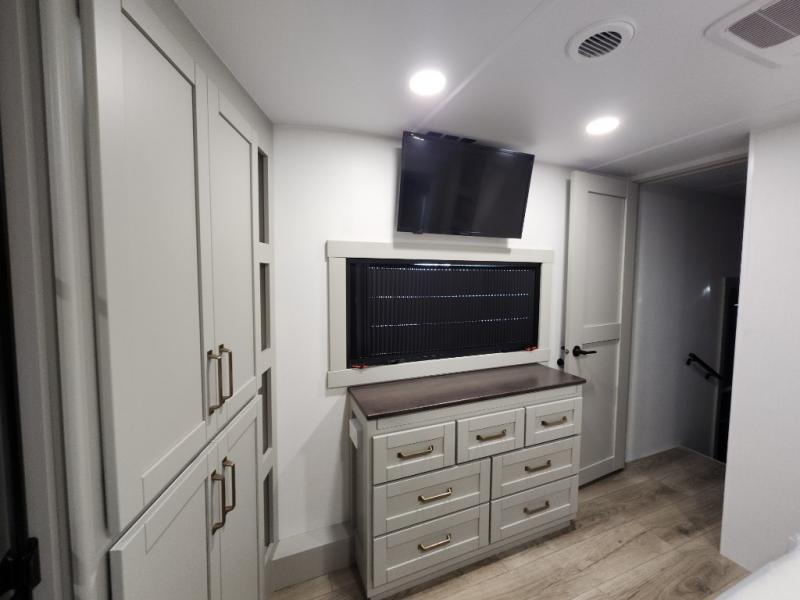 If you're looking for a feature-packed fifth wheel, this is the one! The rear multipurpose flex space can be used as an office/butler's pantry/laundry room/mudroom! There is an adjustable-height desk, storage space, plus washer and dryer prep. One of the dual entry doors is even found here for added convenience. The combined middle kitchen and living room includes dual opposing slides, a tri-fold sofa, theater seating, and a sliding desk/dining table. There is also a televator and fireplace, kitchen island with pet bowls, and an 84" pantry with adjustable shelving to name a few more features. A full bath towards the front includes a 30" x 42" shower, and the front private bedroom will feel just like home with its king bed slide out. There is also a sliding dresser top with hidden storage, bedside shelves, a front wardrobe, and washer and dryer prep here also!