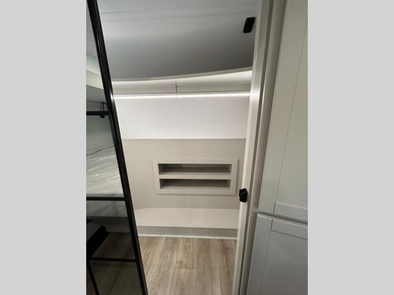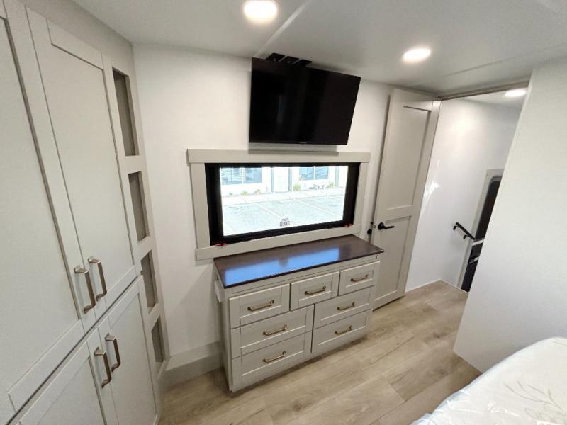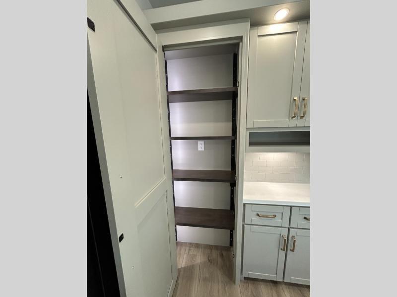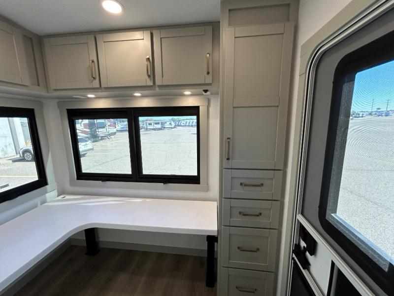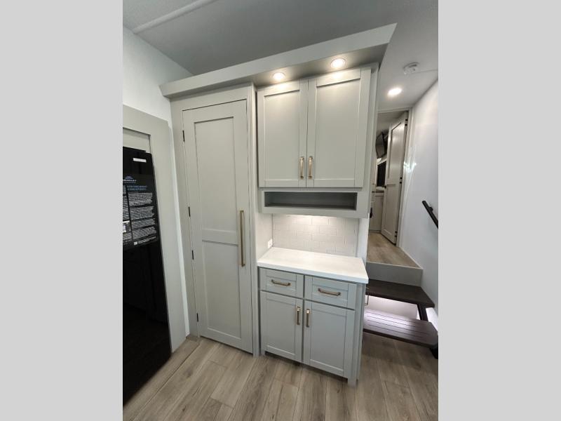 If you're looking for a feature-packed fifth wheel, this is the one! The rear multipurpose flex space can be used as an office/butler's pantry/laundry room/mudroom! There is an adjustable-height desk, storage space, plus washer and dryer prep. One of the dual entry doors is even found here for added convenience. The combined middle kitchen and living room includes dual opposing slides, a tri-fold sofa, theater seating, and a sliding desk/dining table. There is also a televator and fireplace, kitchen island with pet bowls, and an 84" pantry with adjustable shelving to name a few more features. A full bath towards the front includes a 30" x 42" shower, and the front private bedroom will feel just like home with its king bed slide out. There is also a sliding dresser top with hidden storage, bedside shelves, a front wardrobe, and washer and dryer prep here also!