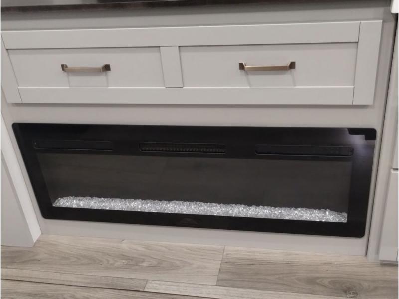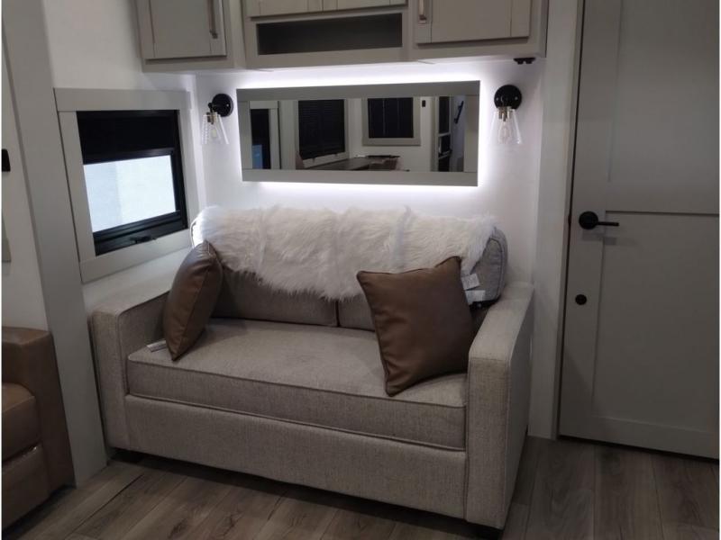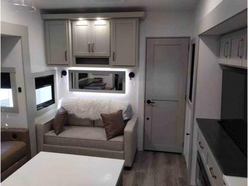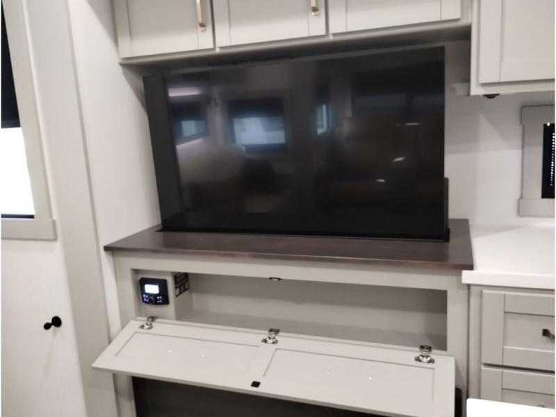 If you're looking for a feature-packed fifth wheel, this is the one! The rear multipurpose flex space can be used as an office/butler's pantry/laundry room/mudroom! There is an adjustable-height desk, storage space, plus washer and dryer prep. One of the dual entry doors is even found here for added convenience. The combined middle kitchen and living room includes dual opposing slides, a tri-fold sofa, theater seating, and a sliding desk/dining table. There is also a televator and fireplace, kitchen island with pet bowls, and an 84" pantry with adjustable shelving to name a few more features. A full bath towards the front includes a 30" x 42" shower, and the front private bedroom will feel just like home with its king bed slide out. There is also a sliding dresser top with hidden storage, bedside shelves, a front wardrobe, and washer and dryer prep here also!