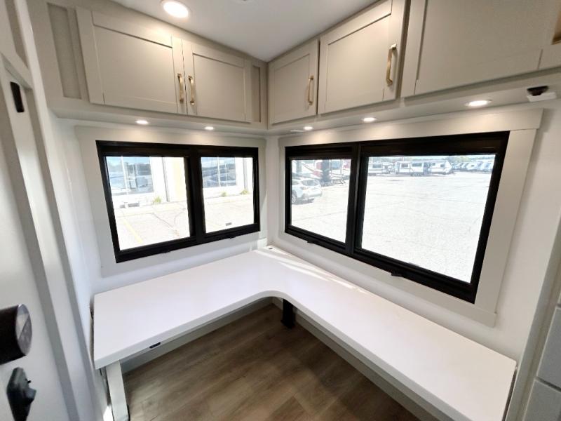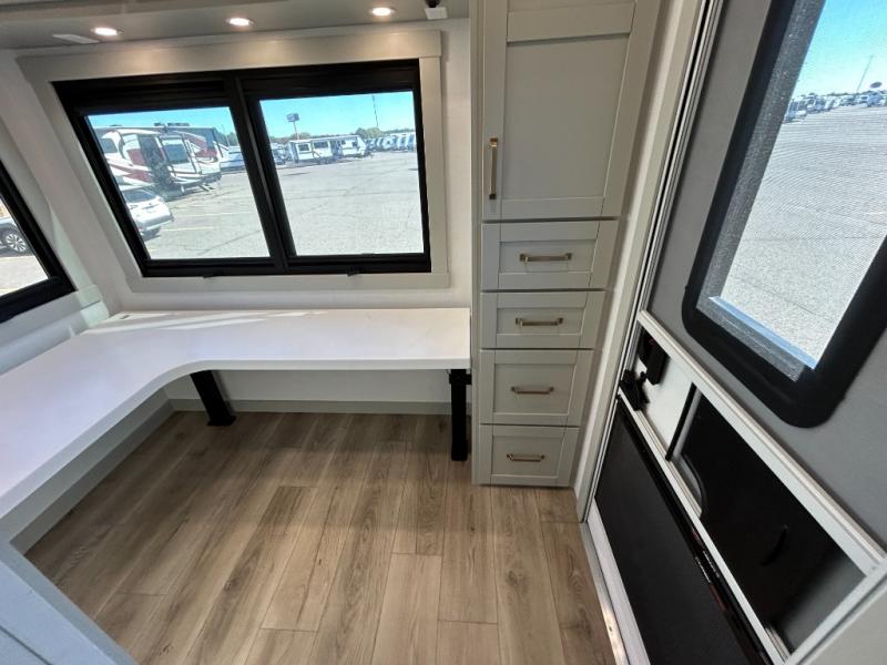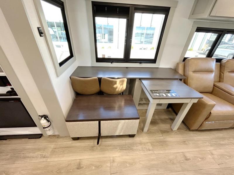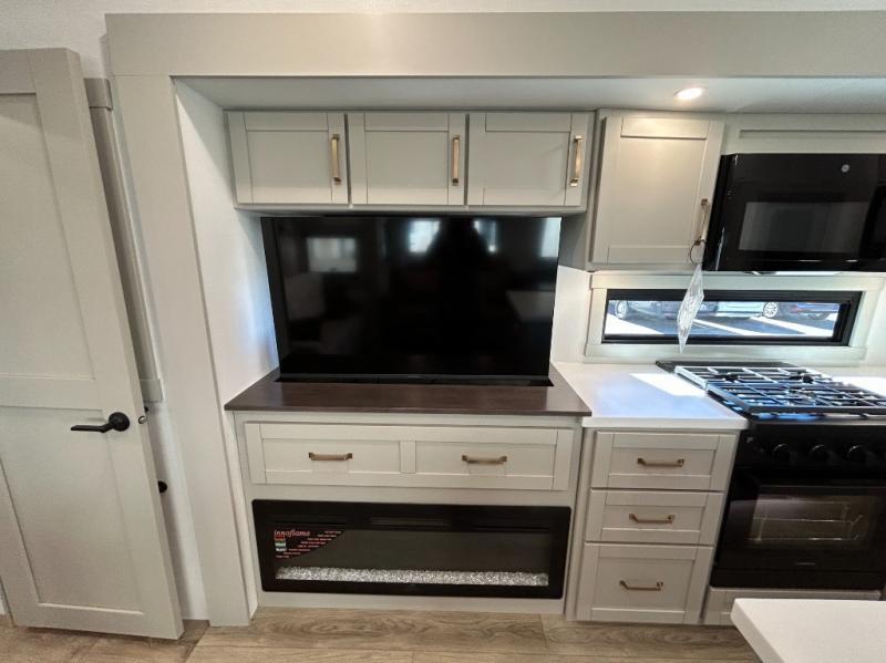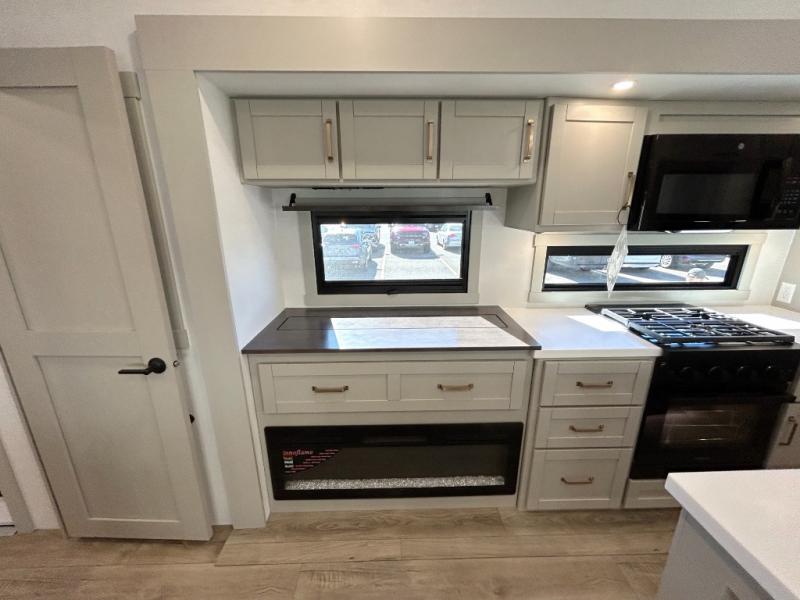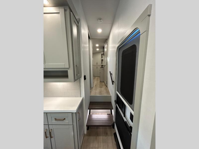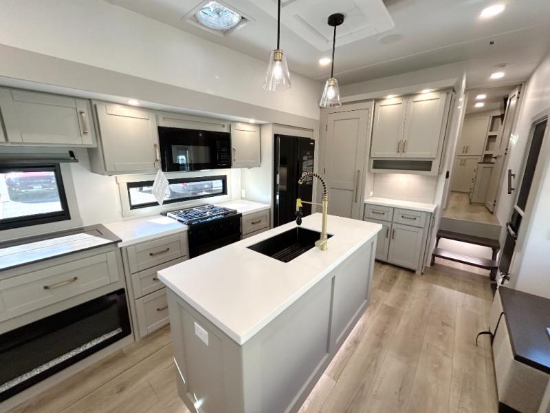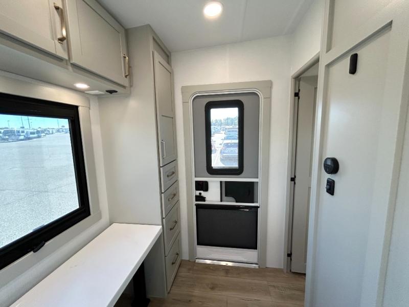 If you're looking for a feature-packed fifth wheel, this is the one! The rear multipurpose flex space can be used as an office/butler's pantry/laundry room/mudroom! There is an adjustable-height desk, storage space, plus washer and dryer prep. One of the dual entry doors is even found here for added convenience. The combined middle kitchen and living room includes dual opposing slides, a tri-fold sofa, theater seating, and a sliding desk/dining table. There is also a televator and fireplace, kitchen island with pet bowls, and an 84" pantry with adjustable shelving to name a few more features. A full bath towards the front includes a 30" x 42" shower, and the front private bedroom will feel just like home with its king bed slide out. There is also a sliding dresser top with hidden storage, bedside shelves, a front wardrobe, and washer and dryer prep here also!