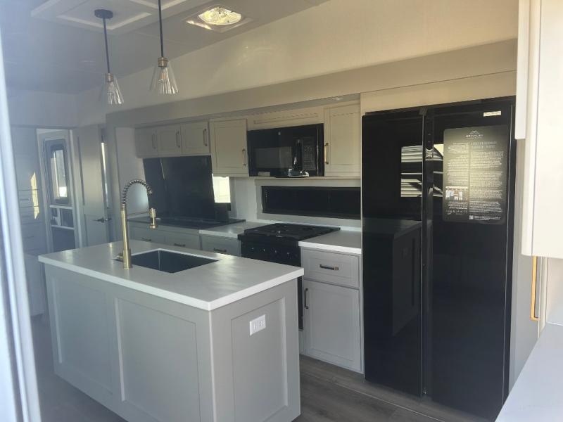 If you're looking for a feature-packed fifth wheel, this is the one! The rear multipurpose flex space can be used as an office/butler's pantry/laundry room/mudroom! There is an adjustable-height desk, storage space, plus washer and dryer prep. One of the dual entry doors is even found here for added convenience. The combined middle kitchen and living room includes dual opposing slides, a tri-fold sofa, theater seating, and a sliding desk/dining table. There is also a televator and fireplace, kitchen island with pet bowls, and an 84" pantry with adjustable shelving to name a few more features. A full bath towards the front includes a 30" x 42" shower, and the front private bedroom will feel just like home with its king bed slide out. There is also a sliding dresser top with hidden storage, bedside shelves, a front wardrobe, and washer and dryer prep here also!
