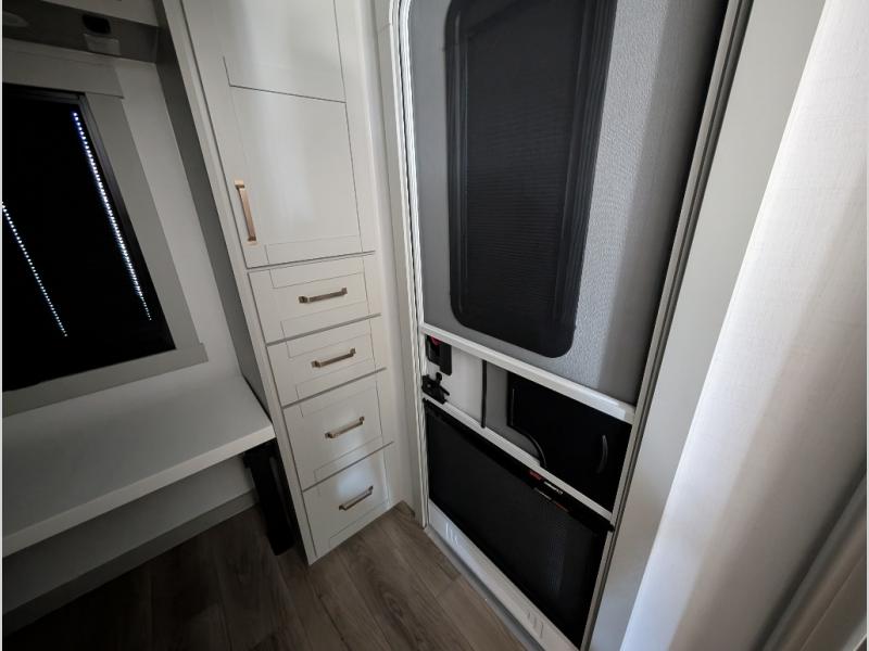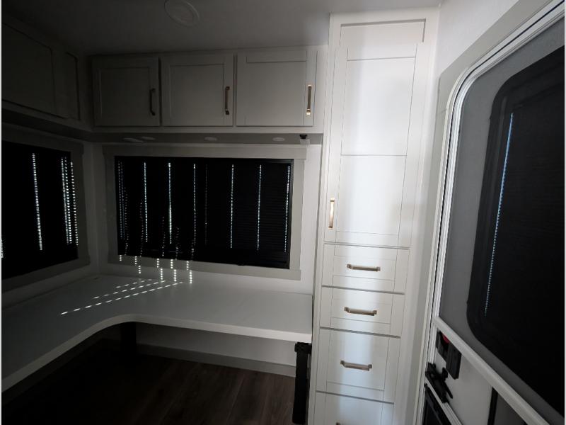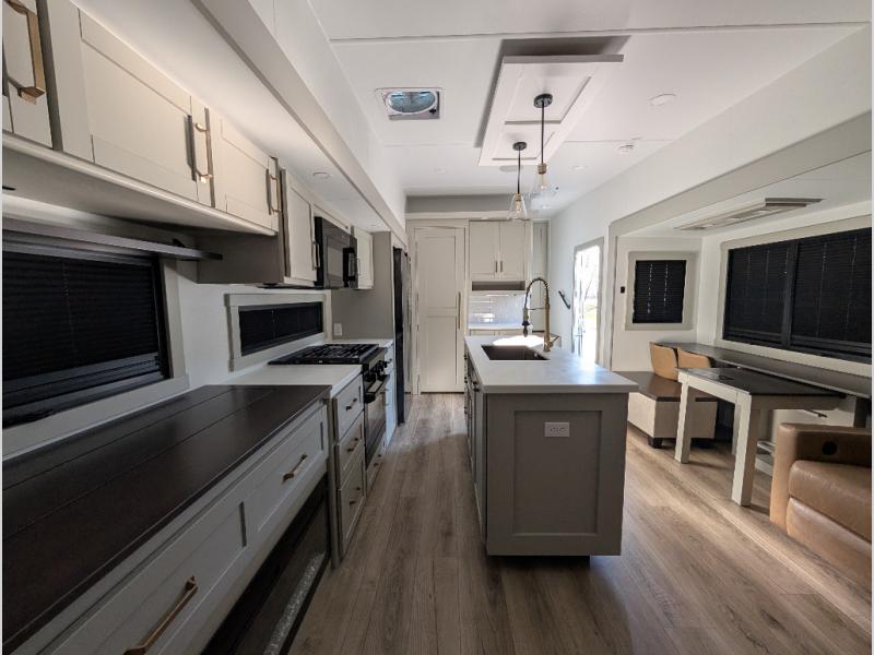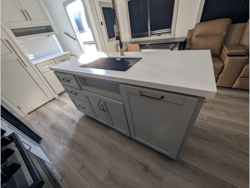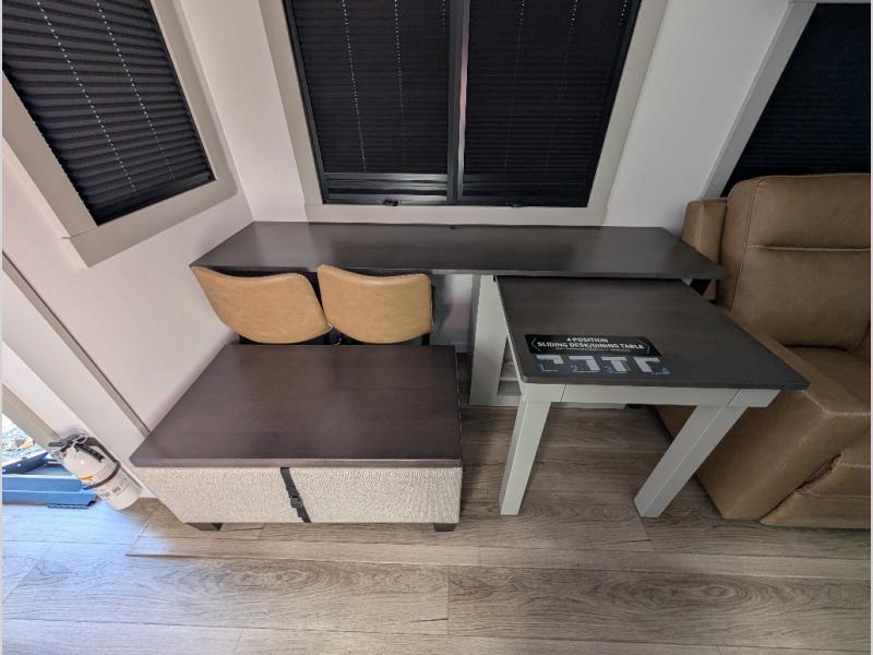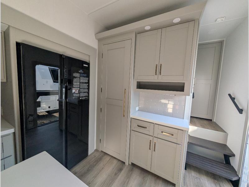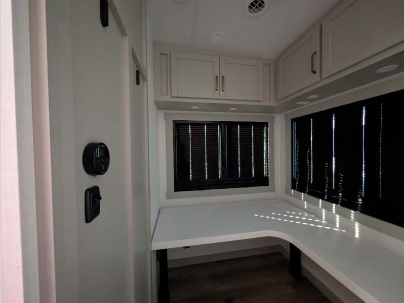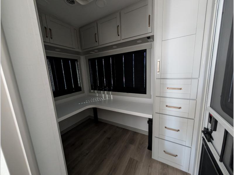 If you're looking for a feature-packed fifth wheel, this is the one! The rear multipurpose flex space can be used as an office/butler's pantry/laundry room/mudroom! There is an adjustable-height desk, storage space, plus washer and dryer prep. One of the dual entry doors is even found here for added convenience. The combined middle kitchen and living room includes dual opposing slides, a tri-fold sofa, theater seating, and a sliding desk/dining table. There is also a televator and fireplace, kitchen island with pet bowls, and an 84" pantry with adjustable shelving to name a few more features. A full bath towards the front includes a 30" x 42" shower, and the front private bedroom will feel just like home with its king bed slide out. There is also a sliding dresser top with hidden storage, bedside shelves, a front wardrobe, and washer and dryer prep here also!