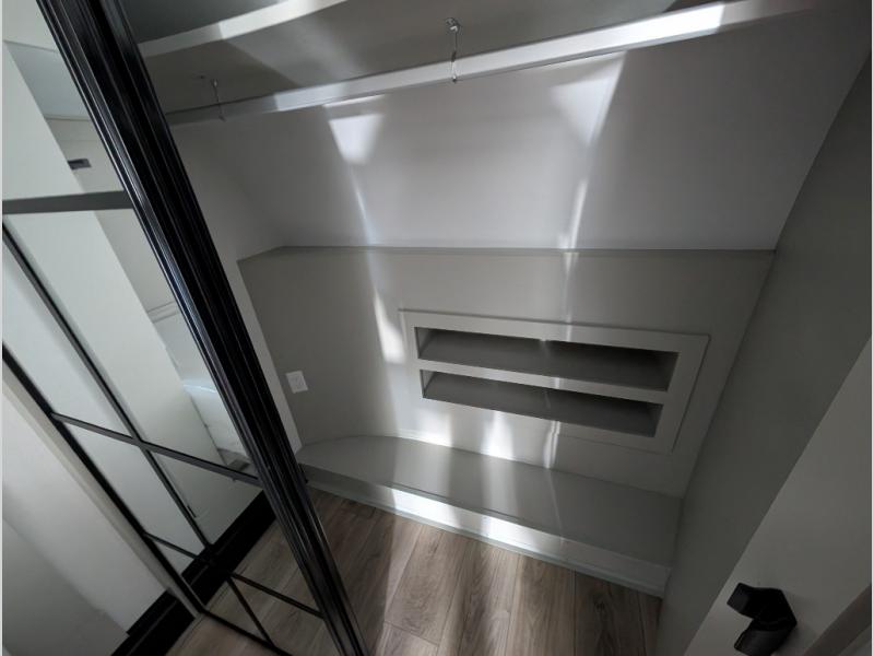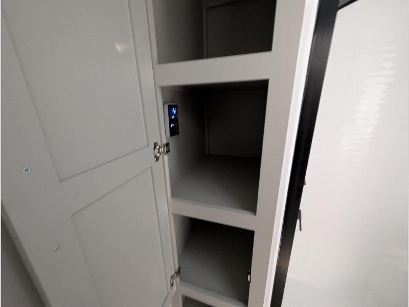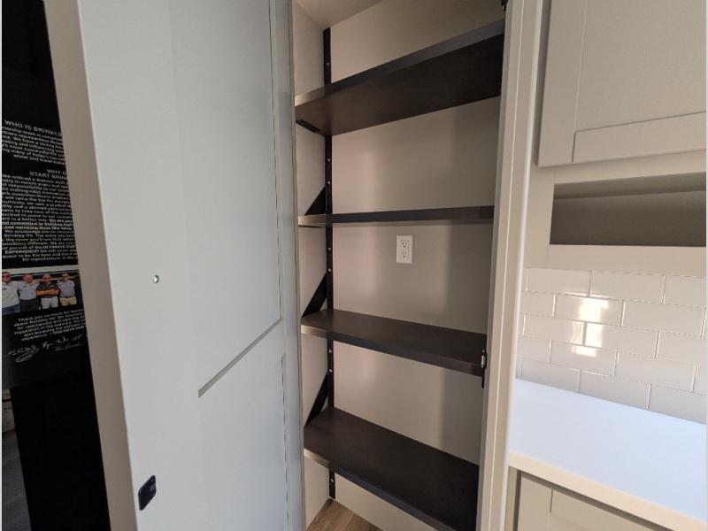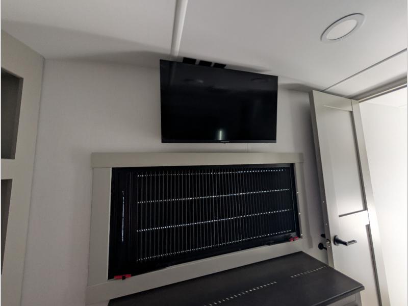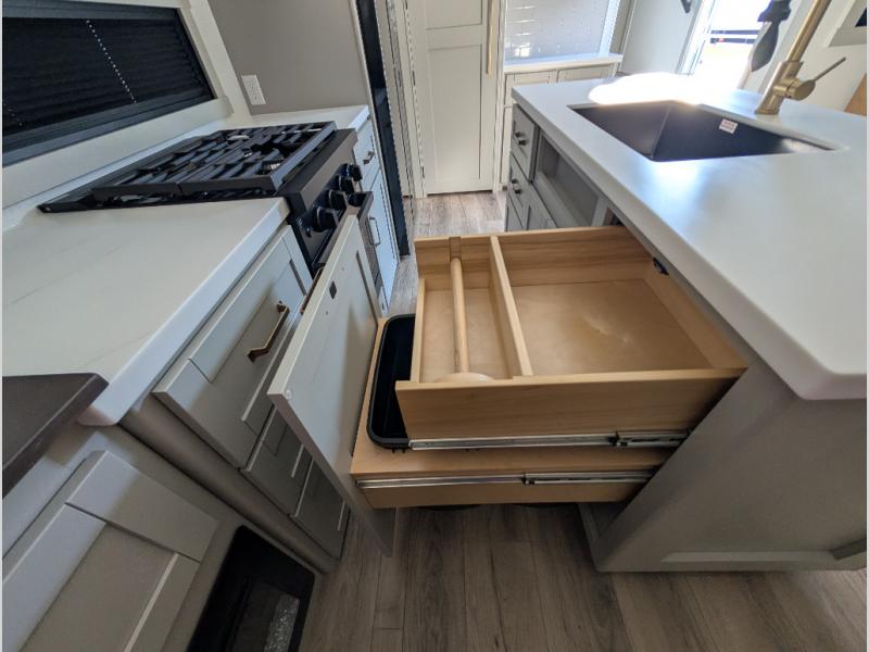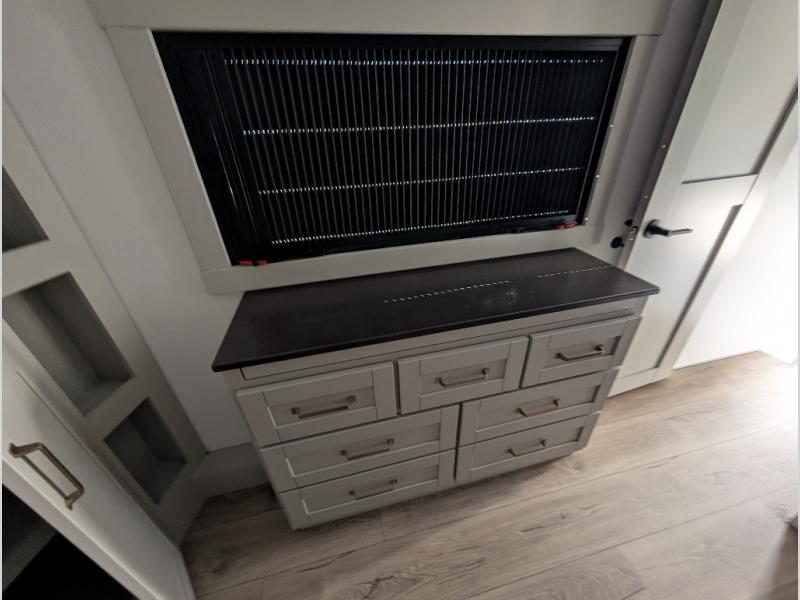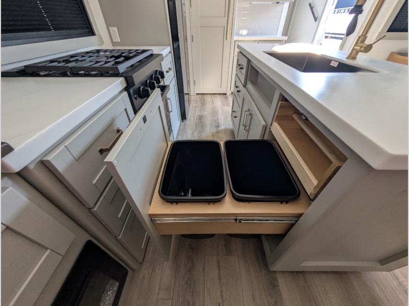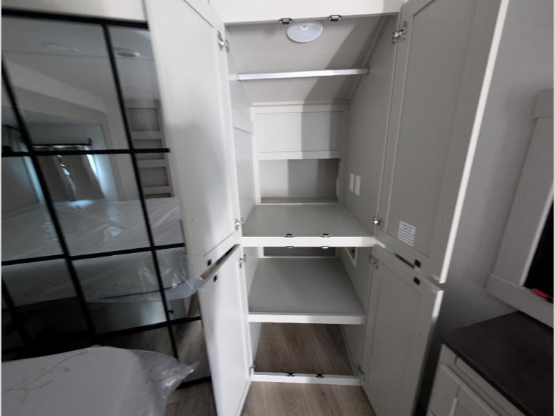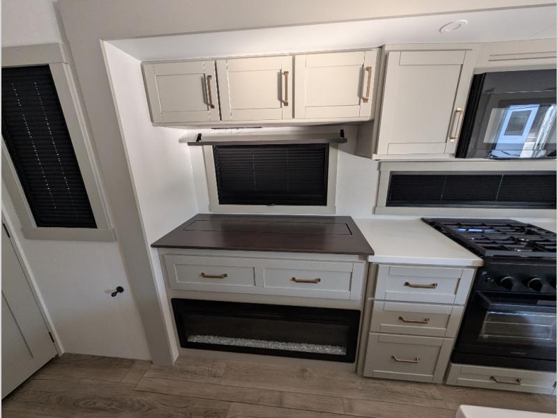 If you're looking for a feature-packed fifth wheel, this is the one! The rear multipurpose flex space can be used as an office/butler's pantry/laundry room/mudroom! There is an adjustable-height desk, storage space, plus washer and dryer prep. One of the dual entry doors is even found here for added convenience. The combined middle kitchen and living room includes dual opposing slides, a tri-fold sofa, theater seating, and a sliding desk/dining table. There is also a televator and fireplace, kitchen island with pet bowls, and an 84" pantry with adjustable shelving to name a few more features. A full bath towards the front includes a 30" x 42" shower, and the front private bedroom will feel just like home with its king bed slide out. There is also a sliding dresser top with hidden storage, bedside shelves, a front wardrobe, and washer and dryer prep here also!