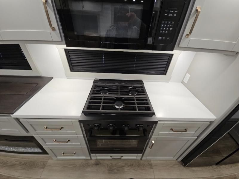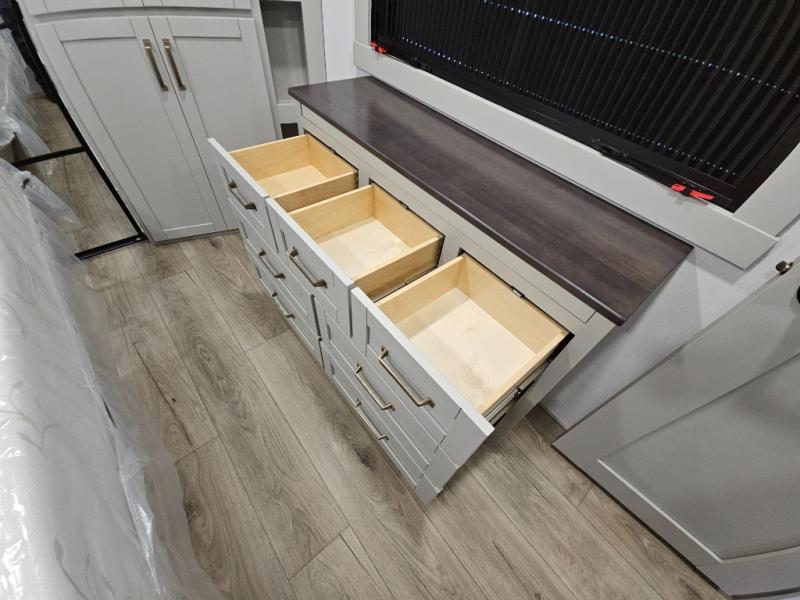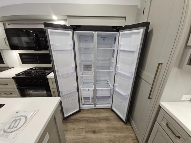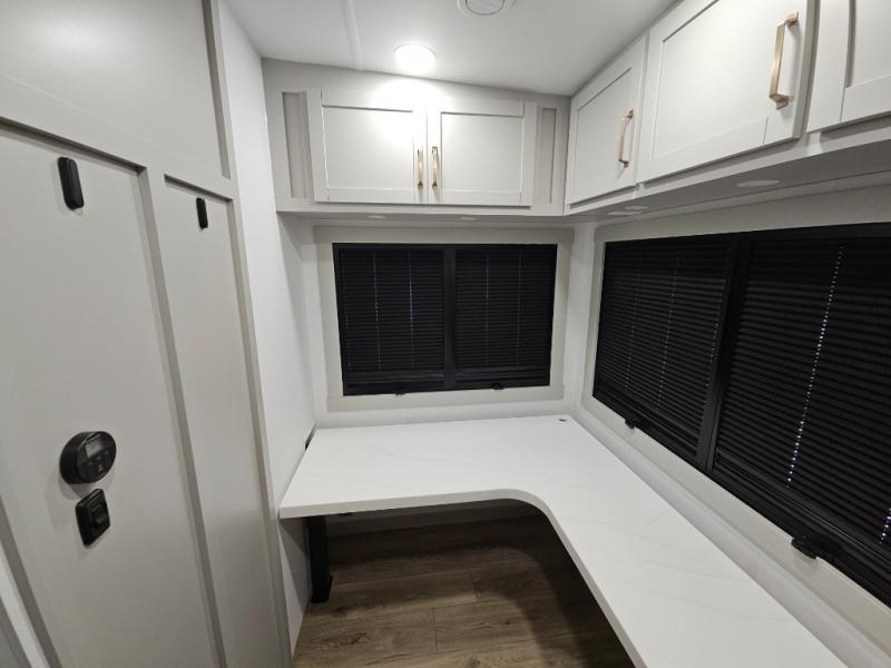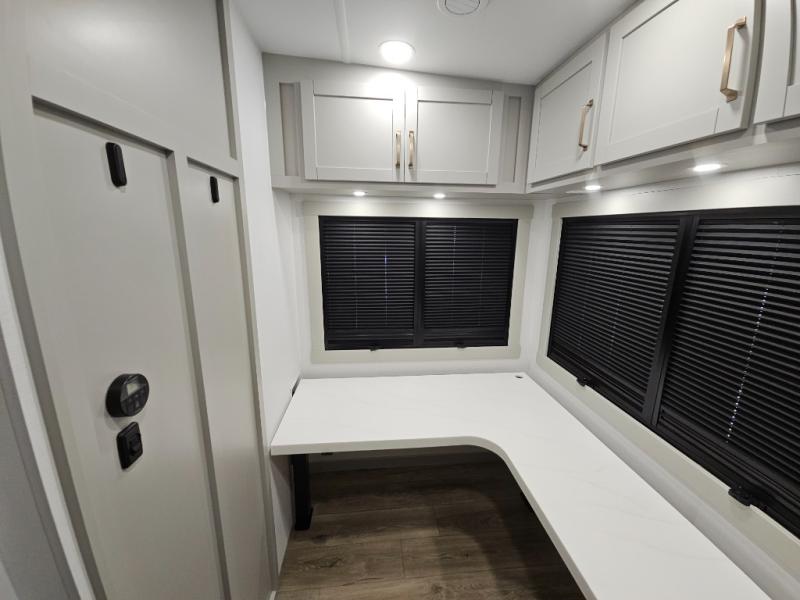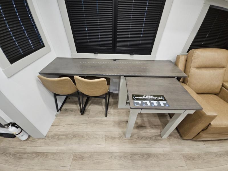 If you're looking for a feature-packed fifth wheel, this is the one! The rear multipurpose flex space can be used as an office/butler's pantry/laundry room/mudroom! There is an adjustable-height desk, storage space, plus washer and dryer prep. One of the dual entry doors is even found here for added convenience. The combined middle kitchen and living room includes dual opposing slides, a tri-fold sofa, theater seating, and a sliding desk/dining table. There is also a televator and fireplace, kitchen island with pet bowls, and an 84" pantry with adjustable shelving to name a few more features. A full bath towards the front includes a 30" x 42" shower, and the front private bedroom will feel just like home with its king bed slide out. There is also a sliding dresser top with hidden storage, bedside shelves, a front wardrobe, and washer and dryer prep here also!