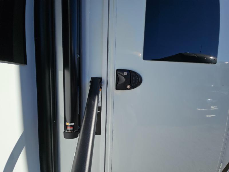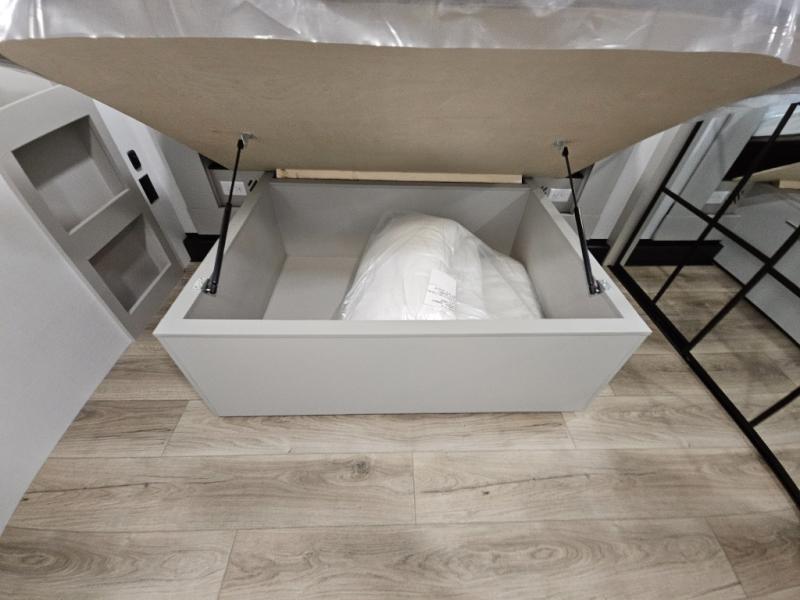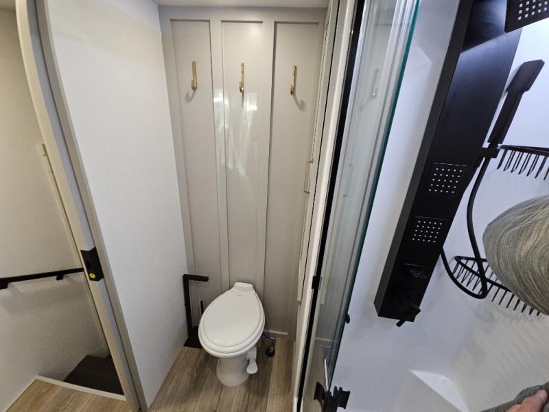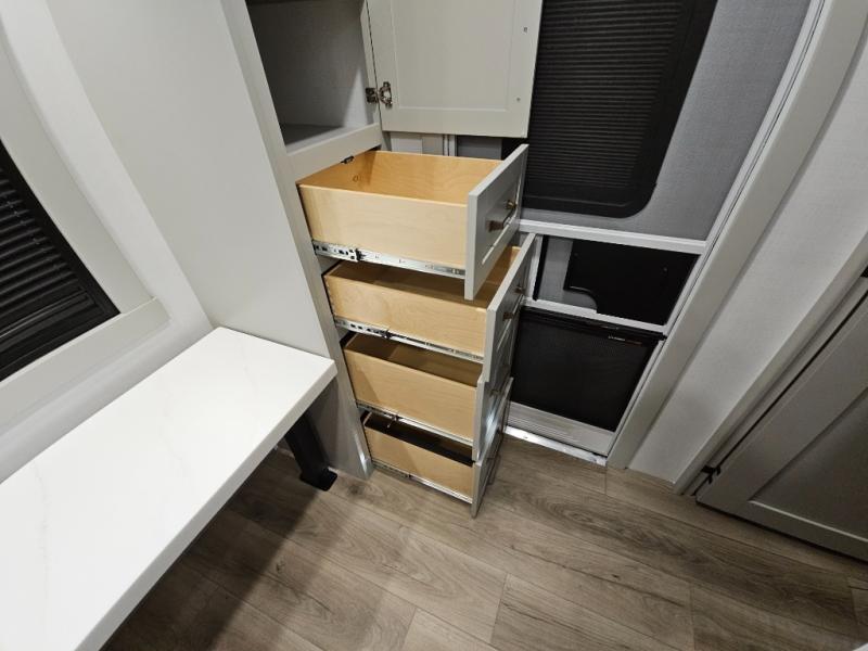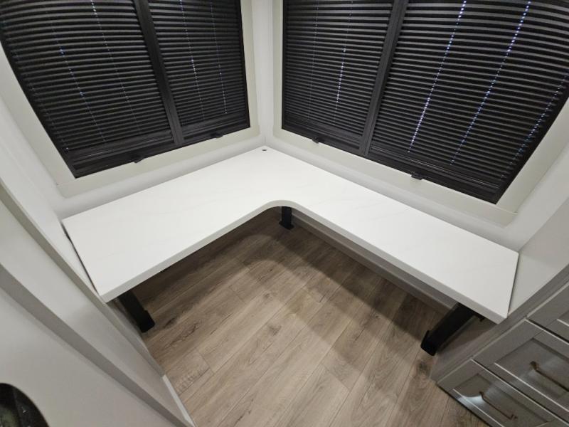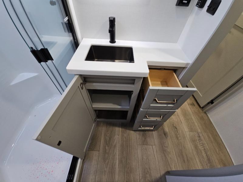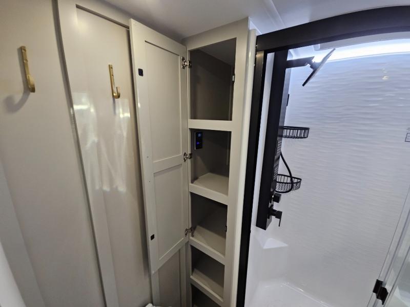 If you're looking for a feature-packed fifth wheel, this is the one! The rear multipurpose flex space can be used as an office/butler's pantry/laundry room/mudroom! There is an adjustable-height desk, storage space, plus washer and dryer prep. One of the dual entry doors is even found here for added convenience. The combined middle kitchen and living room includes dual opposing slides, a tri-fold sofa, theater seating, and a sliding desk/dining table. There is also a televator and fireplace, kitchen island with pet bowls, and an 84" pantry with adjustable shelving to name a few more features. A full bath towards the front includes a 30" x 42" shower, and the front private bedroom will feel just like home with its king bed slide out. There is also a sliding dresser top with hidden storage, bedside shelves, a front wardrobe, and washer and dryer prep here also!