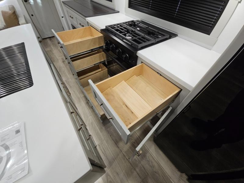 The Brinkley mid-profile Model Z fifth wheels bring you clean lines and an upscale look with plenty of style and exciting new features like the industry first brass plumbing connections. These units also feature an automotive grade front cap, plenty of exterior storage, dual exterior hot and cold showers, and wide stance leveling jacks for easy set up. Residential frameless windows provide a clean look and beautiful views, and ample electrical outlets and 6 USB/USB-C outlets allow all of your electronics and appliances to easily be used and charged.