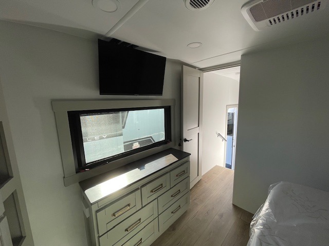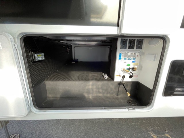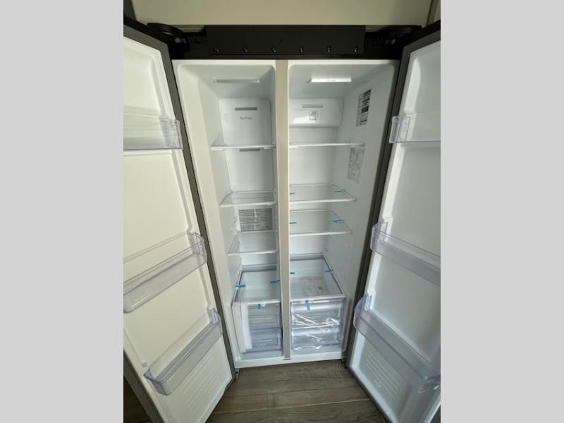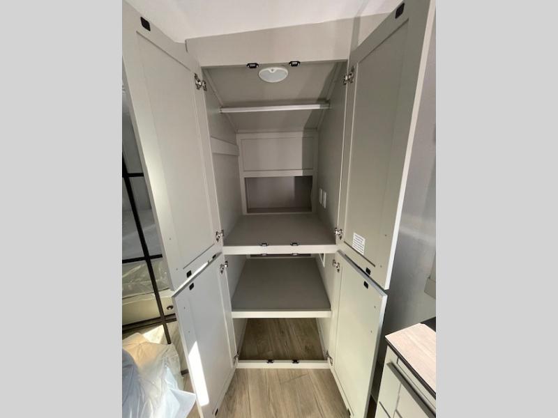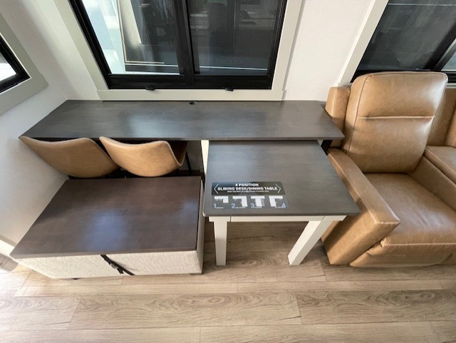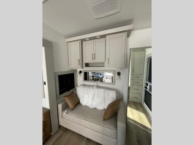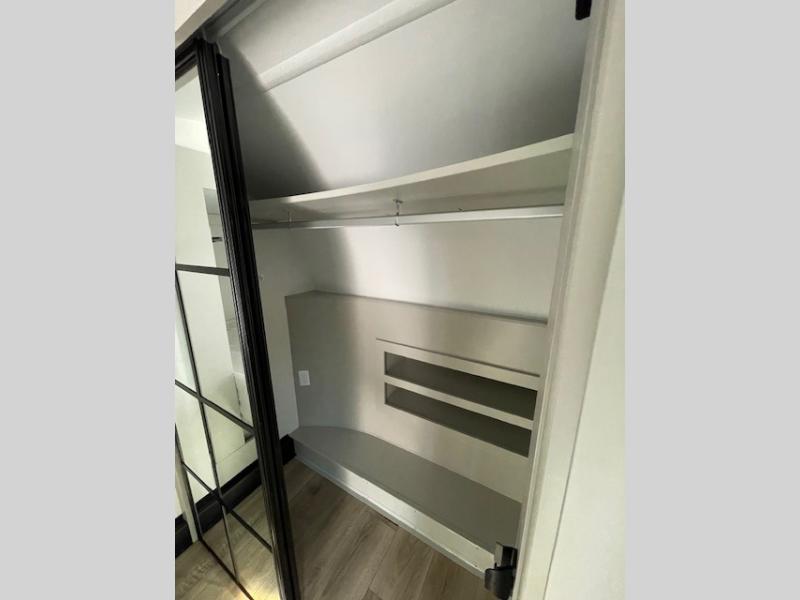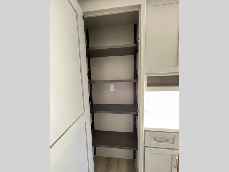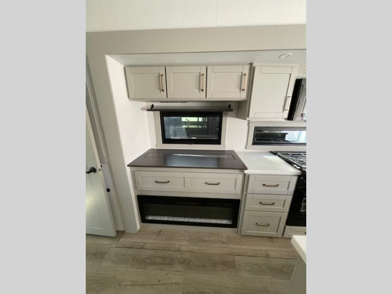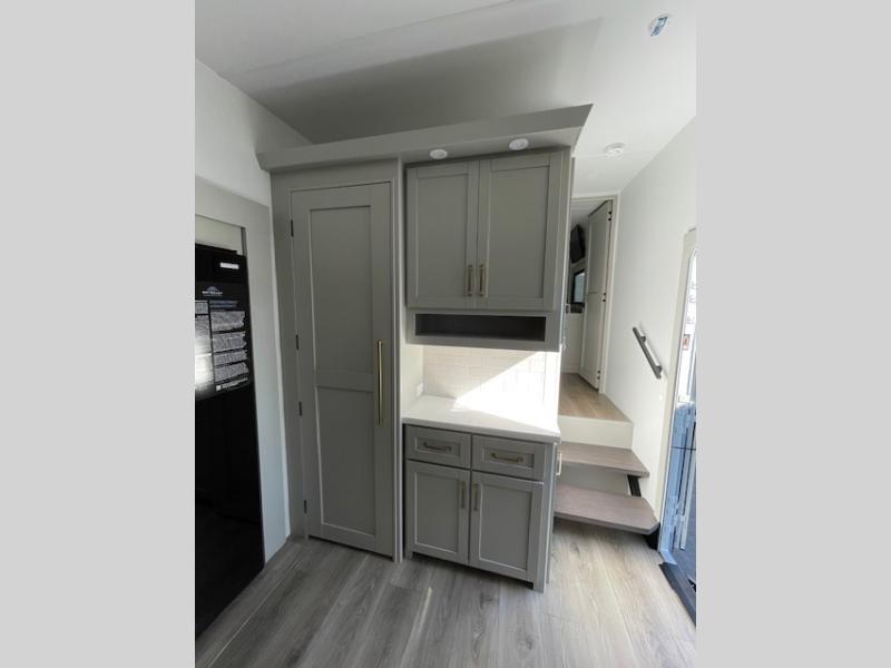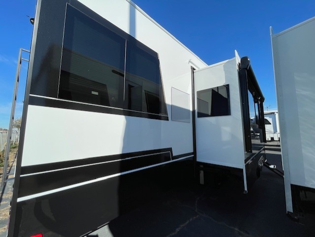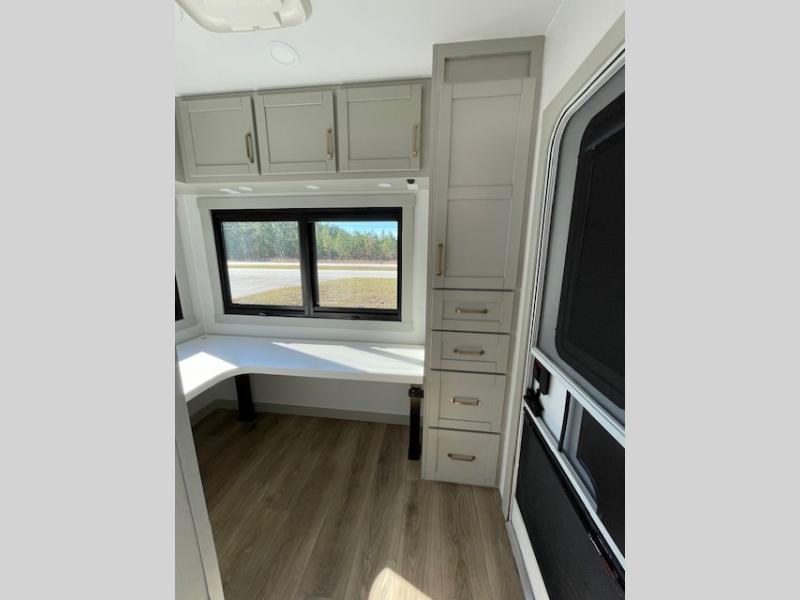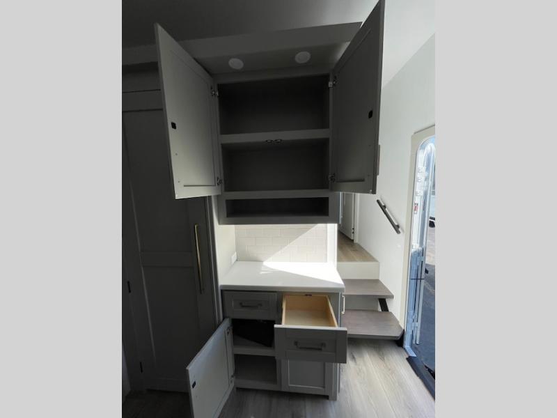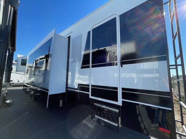 If you're looking for a feature-packed fifth wheel, this is the one! The rear multipurpose flex space can be used as an office/butler's pantry/laundry room/mudroom! There is an adjustable-height desk, storage space, plus washer and dryer prep. One of the dual entry doors is even found here for added convenience. The combined middle kitchen and living room includes dual opposing slides, a tri-fold sofa, theater seating, and a sliding desk/dining table. There is also a televator and fireplace, kitchen island with pet bowls, and an 84" pantry with adjustable shelving to name a few more features. A full bath towards the front includes a 30" x 42" shower, and the front private bedroom will feel just like home with its king bed slide out. There is also a sliding dresser top with hidden storage, bedside shelves, a front wardrobe, and washer and dryer prep here also!