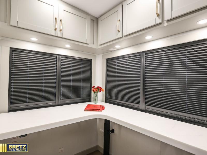 If you're looking for a feature-packed fifth wheel, this is the one! The rear multipurpose flex space can be used as an office/butler's pantry/laundry room/mudroom! There is an adjustable-height desk, storage space, plus washer and dryer prep. One of the dual entry doors is even found here for added convenience. The combined middle kitchen and living room includes dual opposing slides, a tri-fold sofa, theater seating, and a sliding desk/dining table. There is also a televator and fireplace, kitchen island with pet bowls, and an 84" pantry with adjustable shelving to name a few more features. A full bath towards the front includes a 30" x 42" shower, and the front private bedroom will feel just like home with its king bed slide out. There is also a sliding dresser top with hidden storage, bedside shelves, a front wardrobe, and washer and dryer prep here also!
