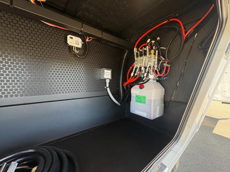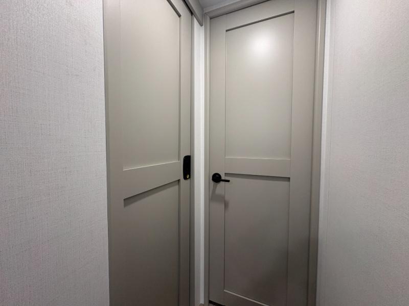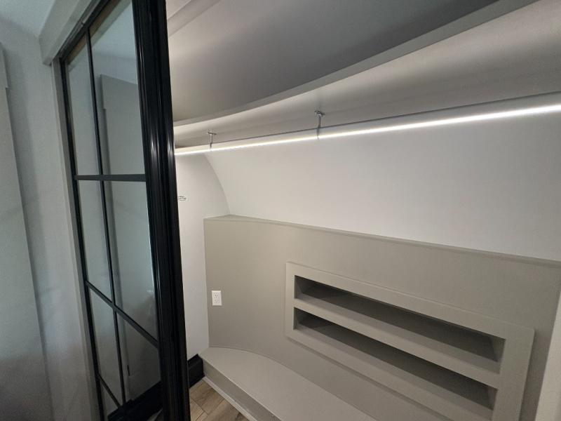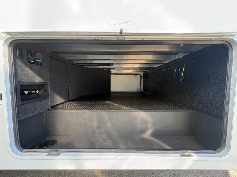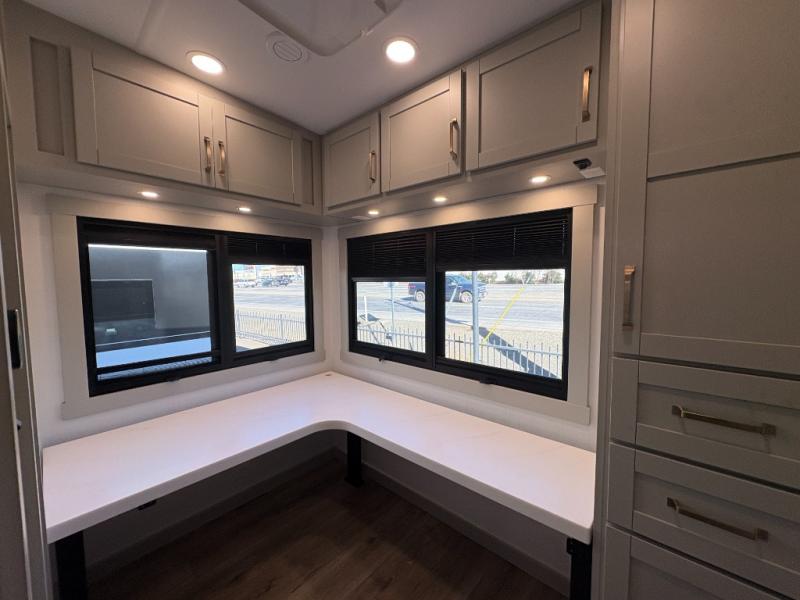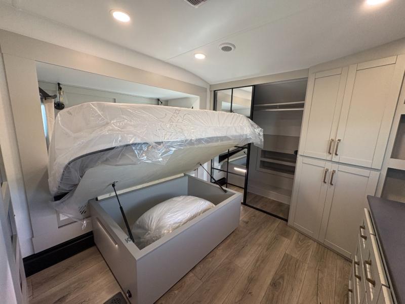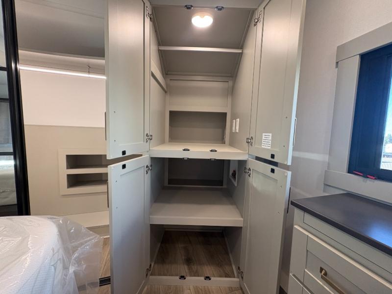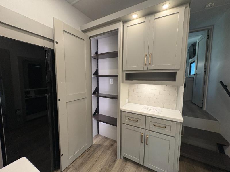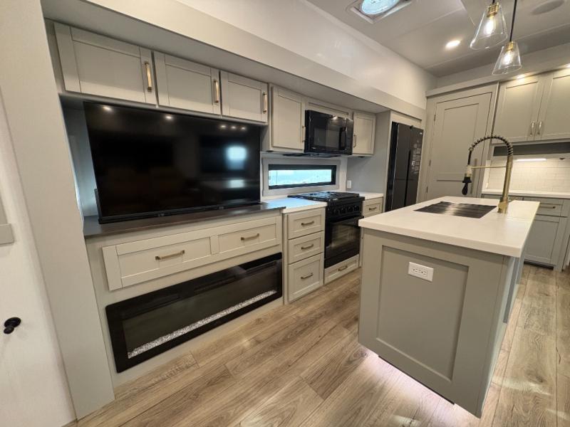 If you're looking for a feature-packed fifth wheel, this is the one! The rear multipurpose flex space can be used as an office/butler's pantry/laundry room/mudroom! There is an adjustable-height desk, storage space, plus washer and dryer prep. One of the dual entry doors is even found here for added convenience. The combined middle kitchen and living room includes dual opposing slides, a tri-fold sofa, theater seating, and a sliding desk/dining table. There is also a televator and fireplace, kitchen island with pet bowls, and an 84" pantry with adjustable shelving to name a few more features. A full bath towards the front includes a 30" x 42" shower, and the front private bedroom will feel just like home with its king bed slide out. There is also a sliding dresser top with hidden storage, bedside shelves, a front wardrobe, and washer and dryer prep here also!